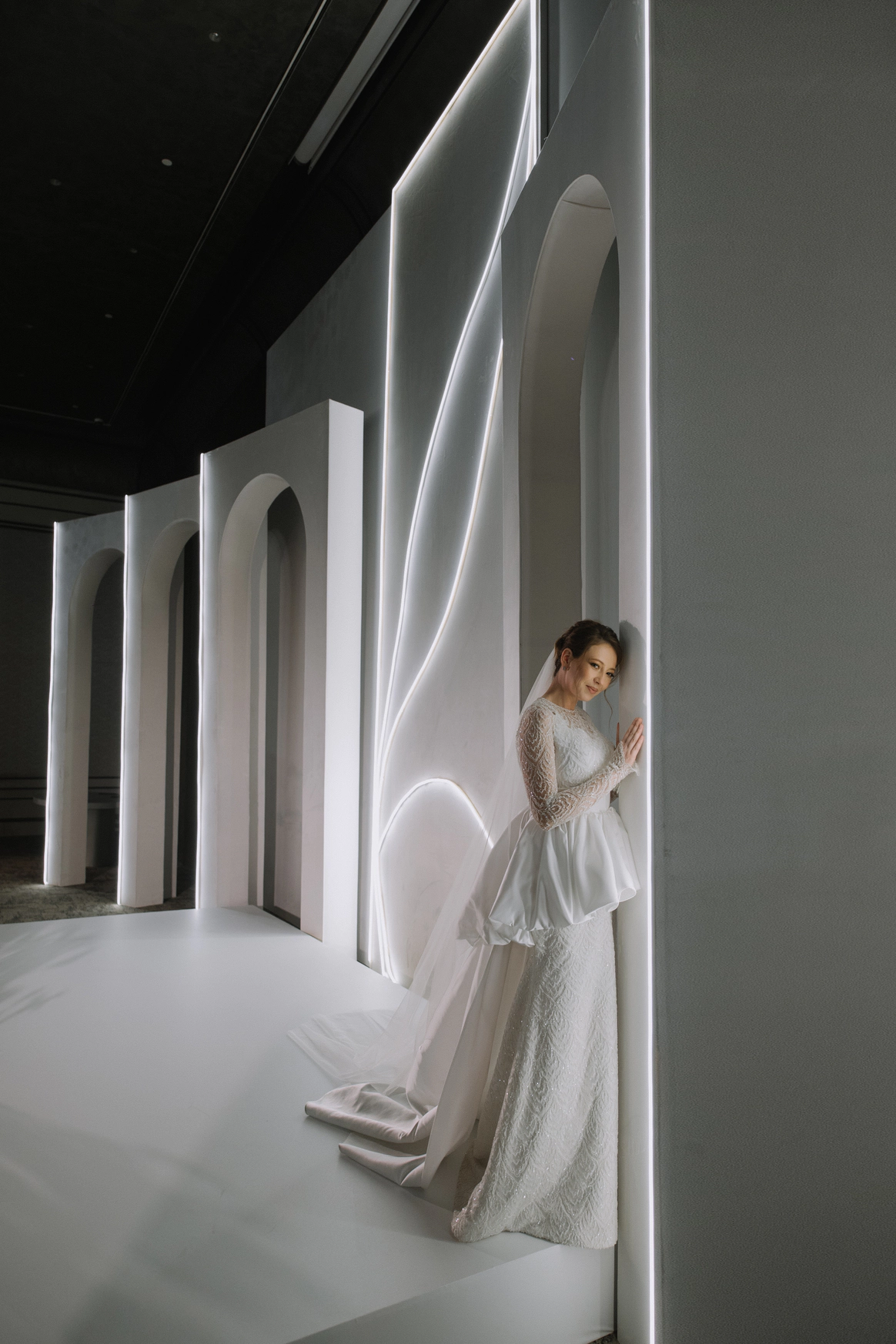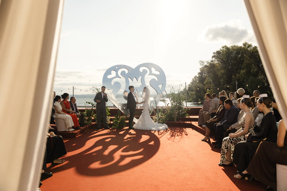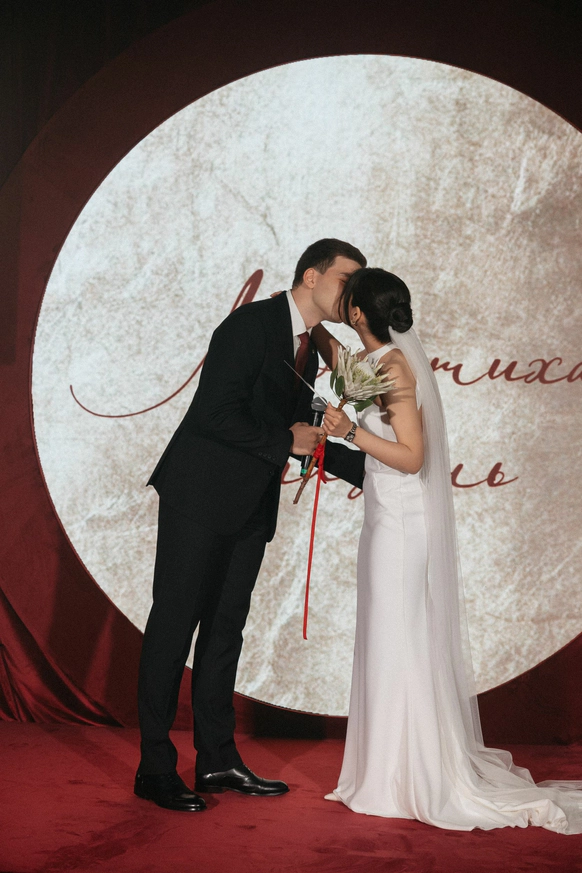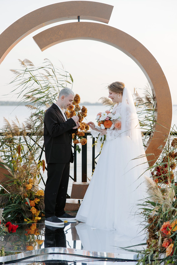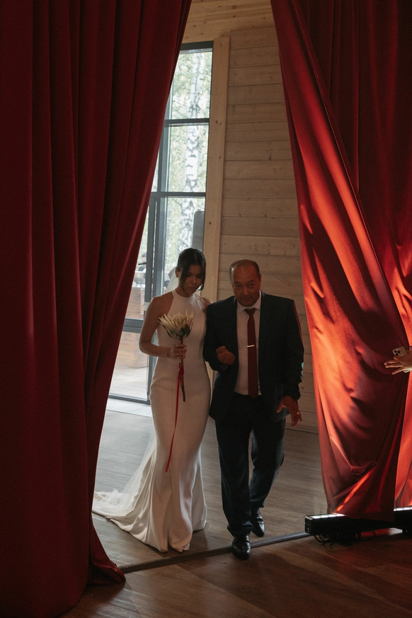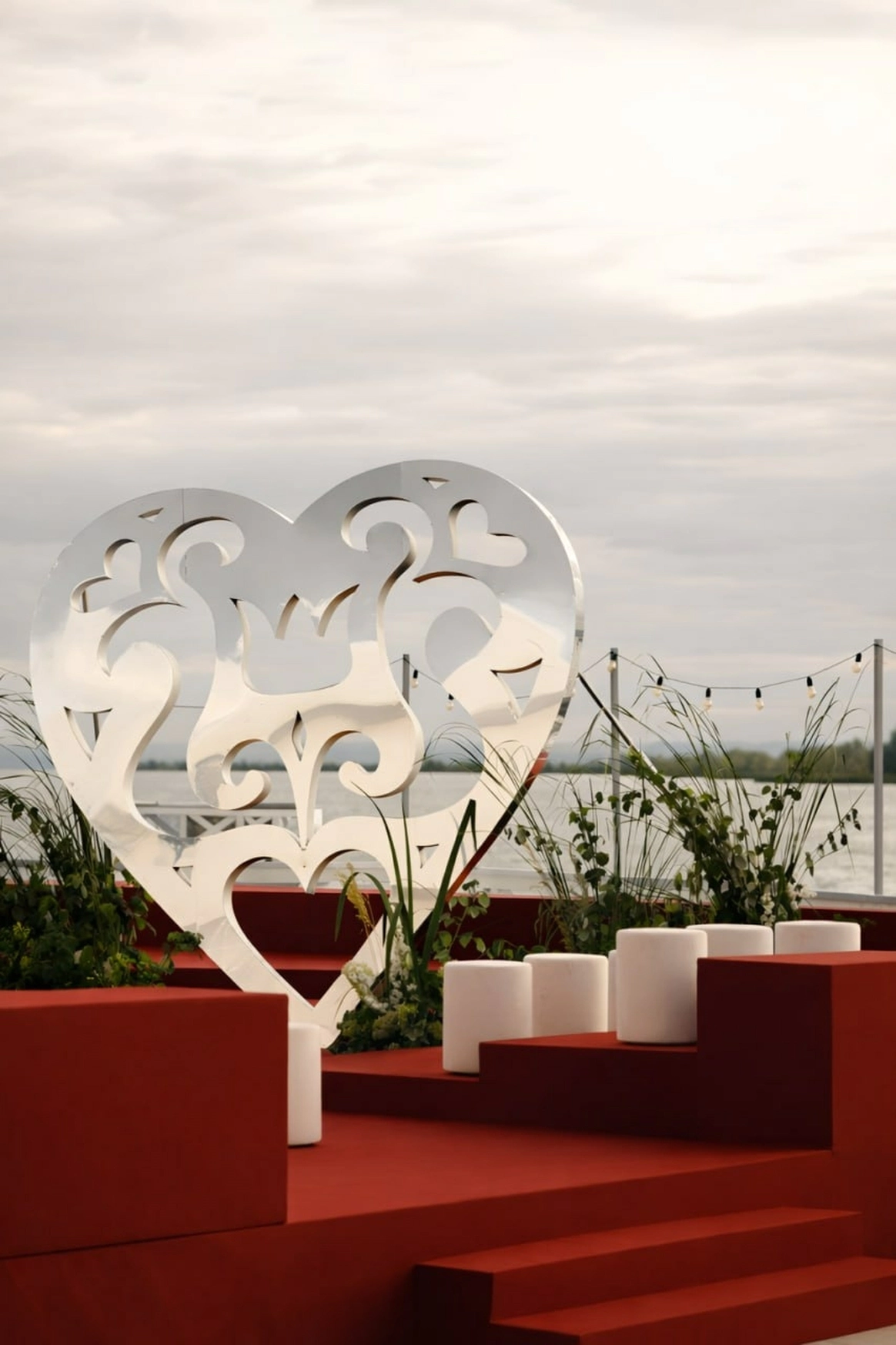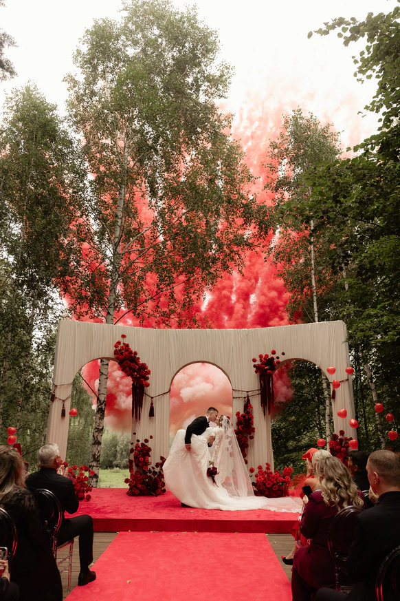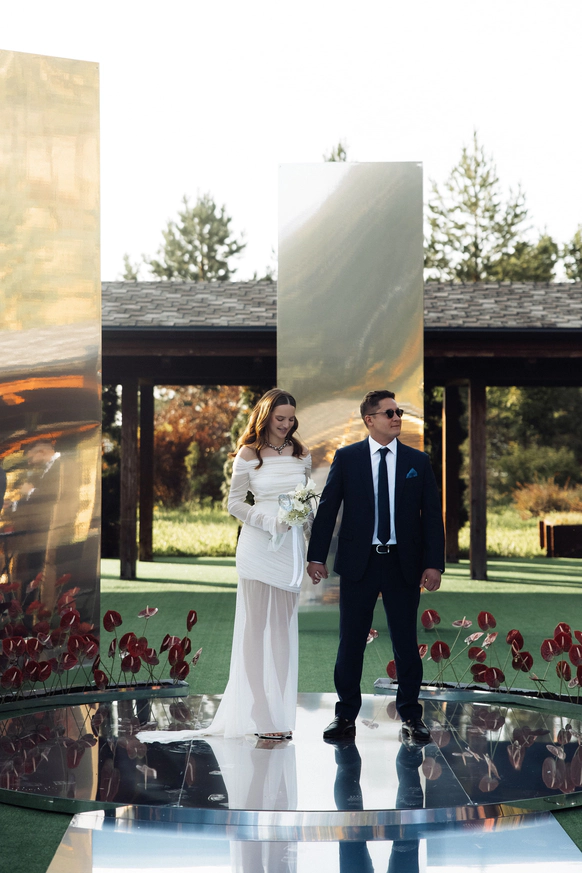 Зеркальная резная конструкция создаёт выразительный фон на фоне неба и открытого пространства, а красное покрытие под ногами добавляет композиции торжественности - цвета любви, энергии и семейного благополучия.