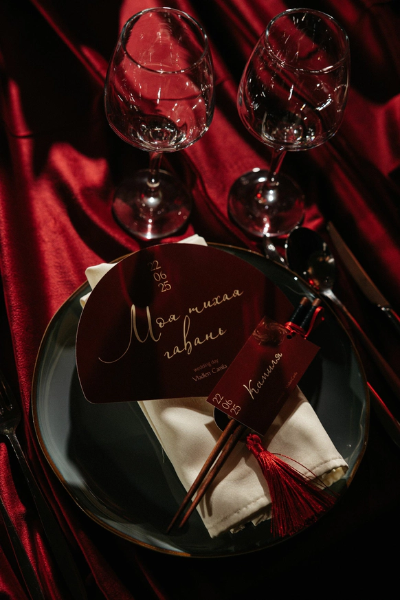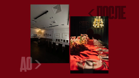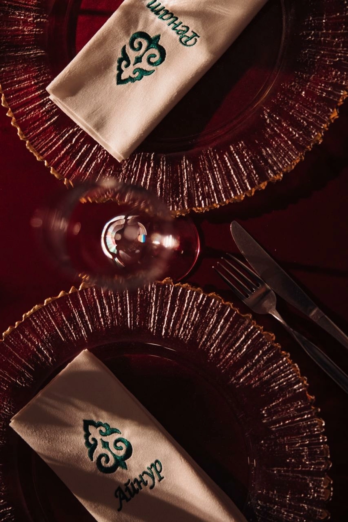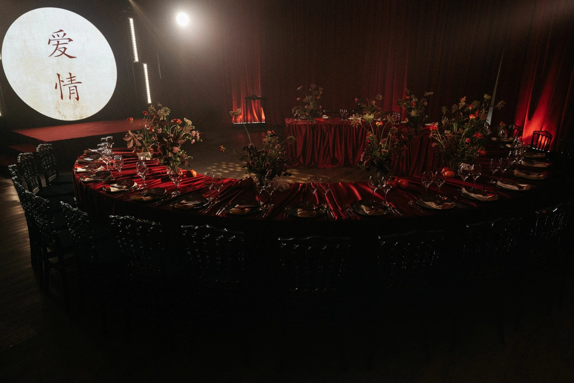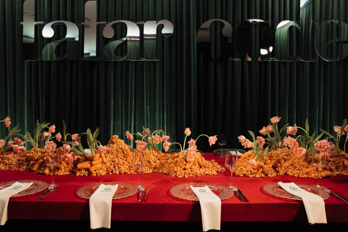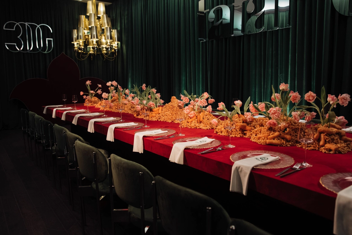 Оформление столов продолжает концепцию: лаконичные белые скатерти подчёркивают яркие акценты, а декоративные элементы в красных и зелёных оттенках усиливают национальный характер торжества. Детали подобраны с особым вниманием - от орнаментов до текстур, чтобы каждая часть пространства говорила о традициях, гостеприимстве и уважении к культуре.