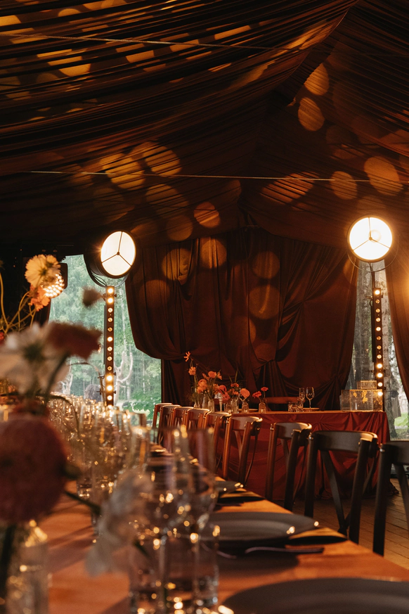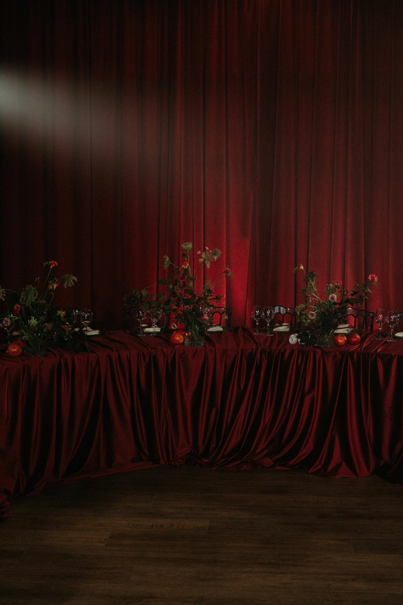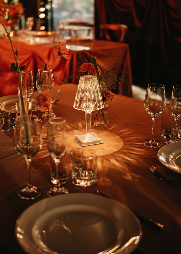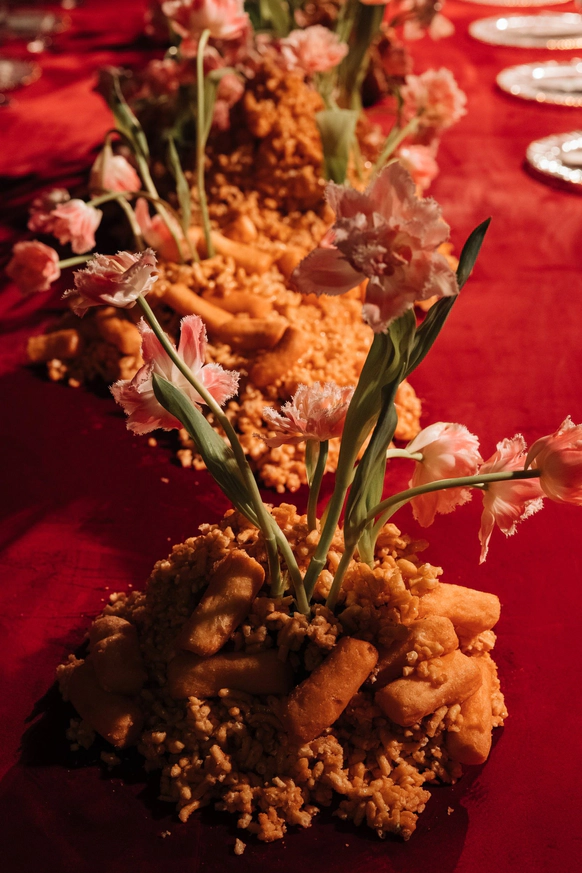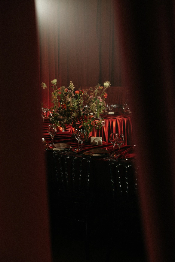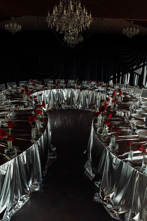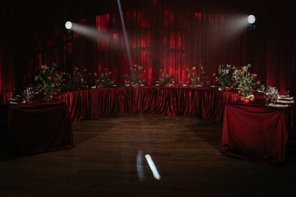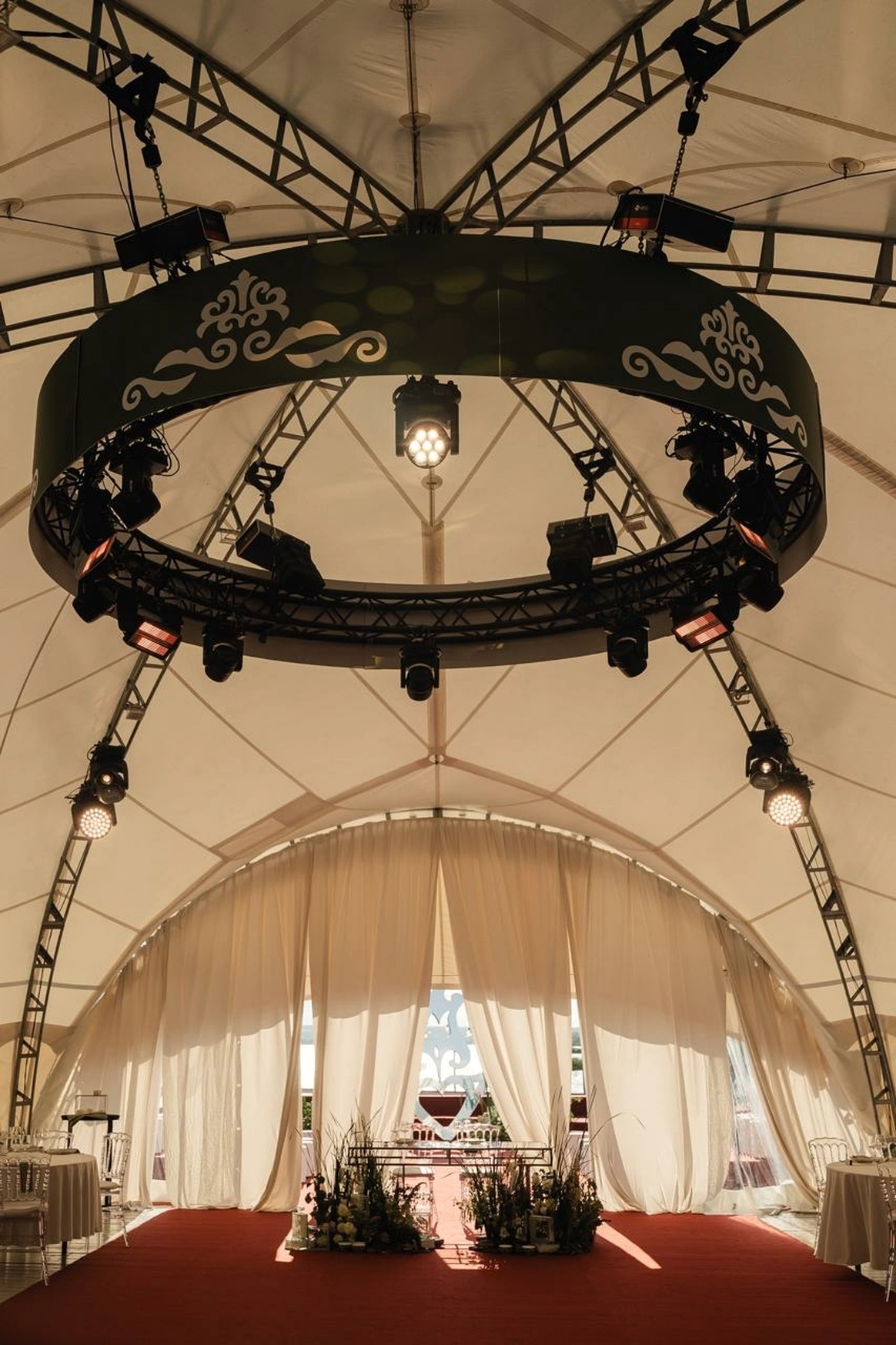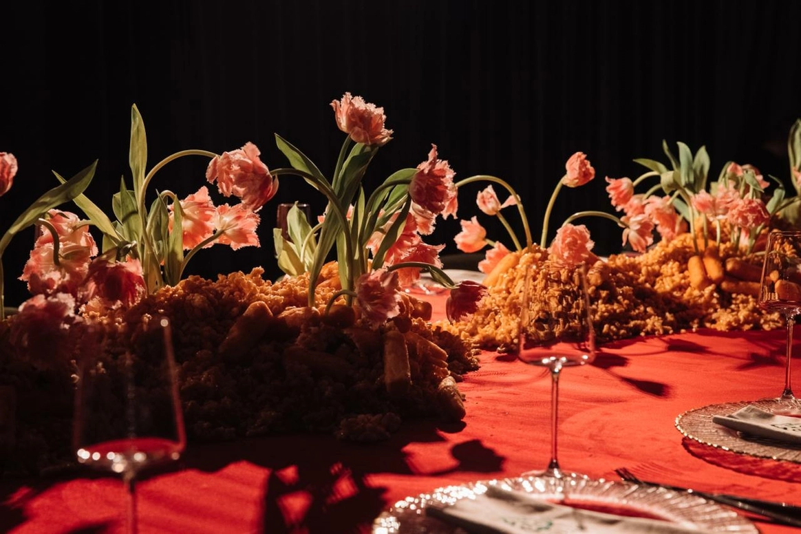 Оформление столов продолжает концепцию: лаконичные белые скатерти подчёркивают яркие акценты, а декоративные элементы в красных и зелёных оттенках усиливают национальный характер торжества. Детали подобраны с особым вниманием - от орнаментов до текстур, чтобы каждая часть пространства говорила о традициях, гостеприимстве и уважении к культуре.
