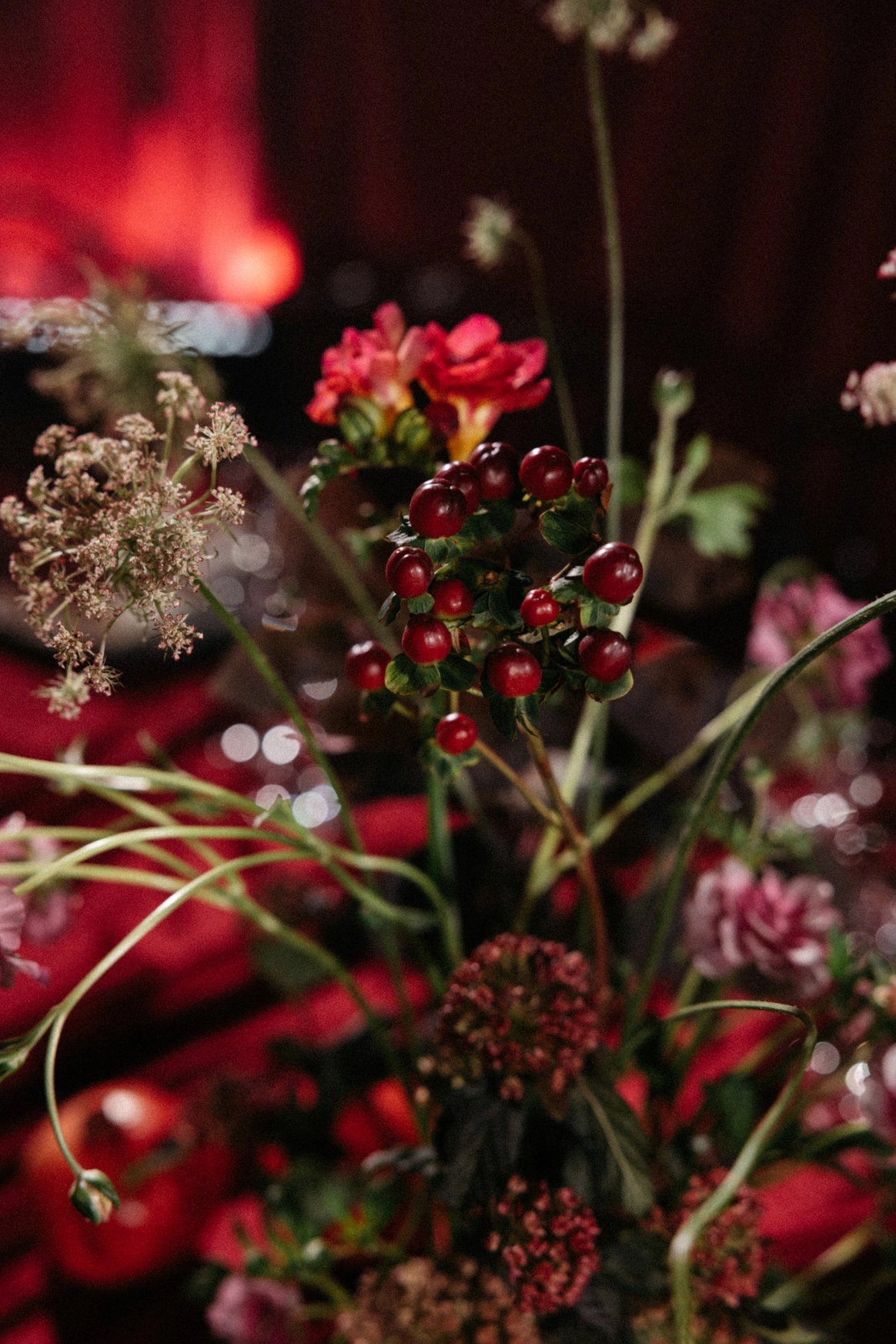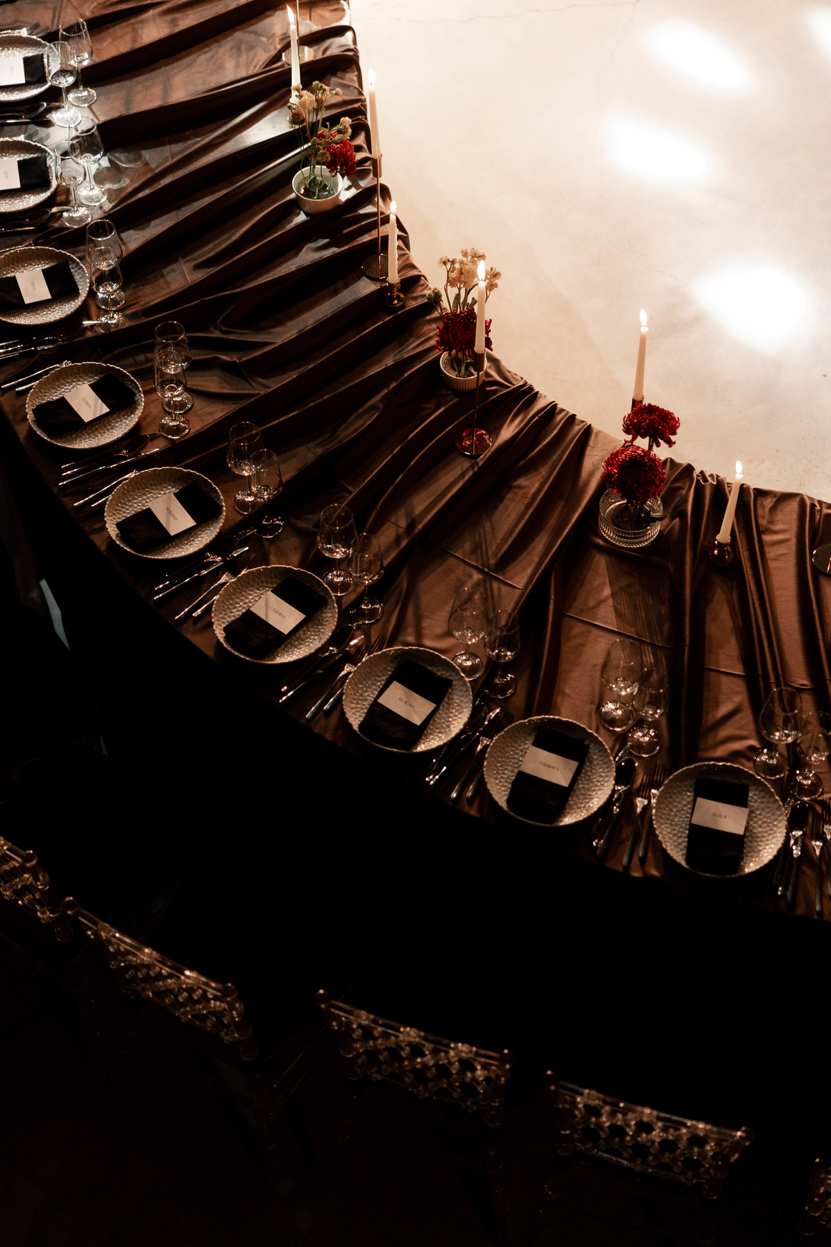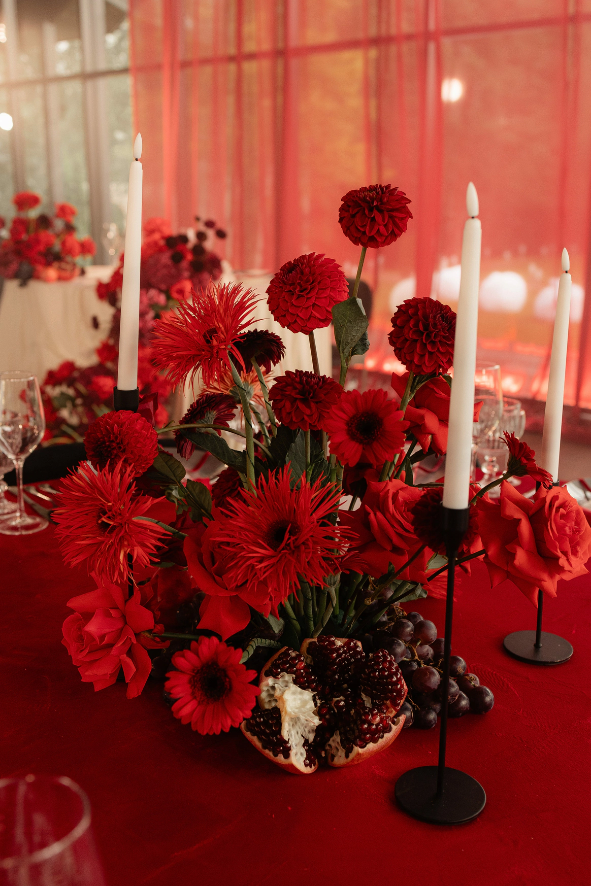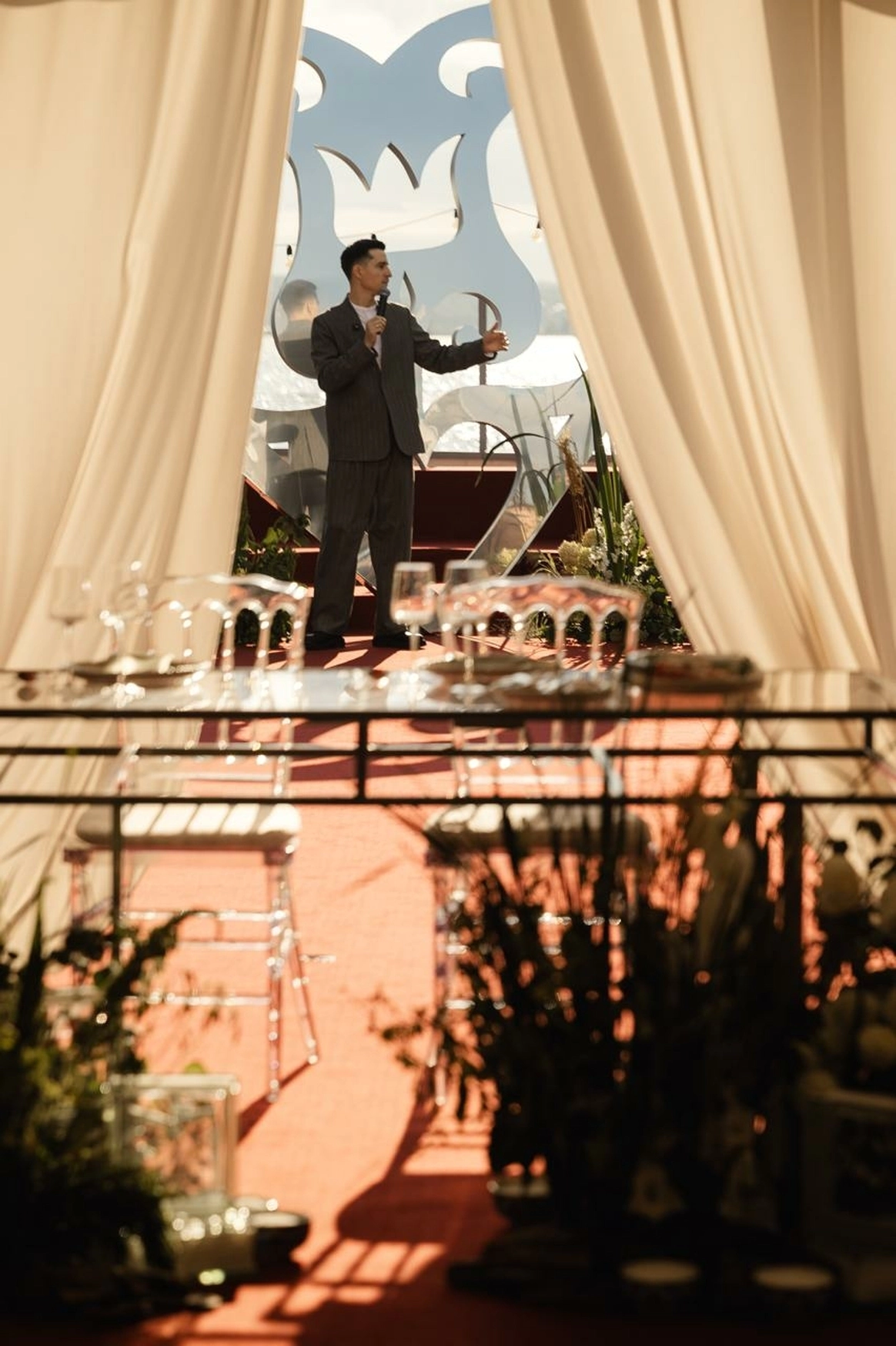 Оформление столов продолжает концепцию: лаконичные белые скатерти подчёркивают яркие акценты, а декоративные элементы в красных и зелёных оттенках усиливают национальный характер торжества. Детали подобраны с особым вниманием - от орнаментов до текстур, чтобы каждая часть пространства говорила о традициях, гостеприимстве и уважении к культуре.