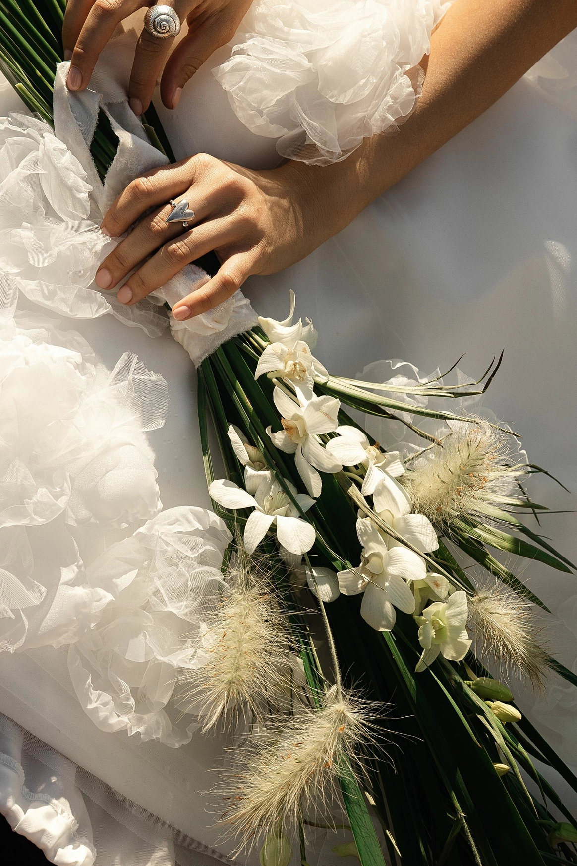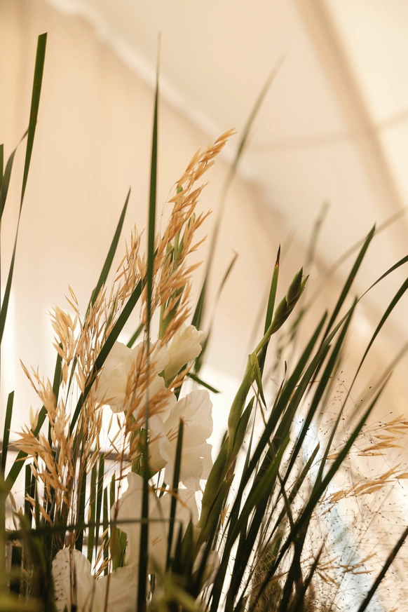 Флористика выдержана в гармоничном сочетании зелени и светлых оттенков: воздушные травы, белые цветы и насыщенные зелёные акценты.