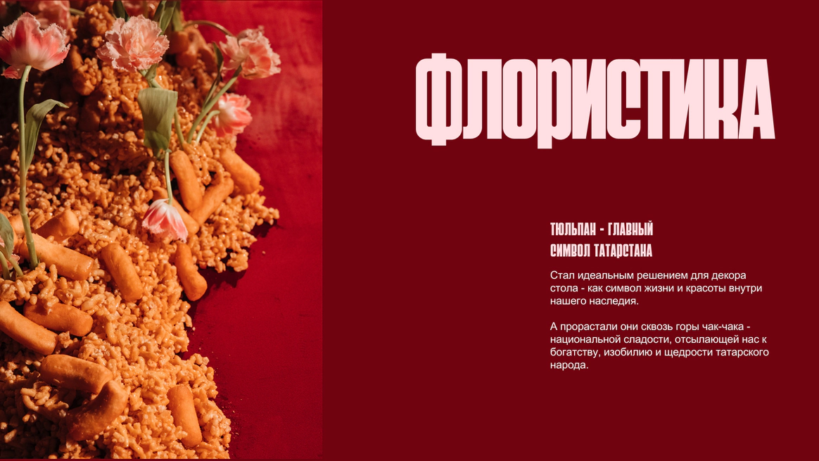 Главным украшением стола стали горы чак-чака и баурсака. Из золотистых сладостей словно прорастали тюльпаны - это особенный цветок для татарской культуры. Он издавна считается символом весны, обновления и новой главы жизни. Этот образ стал метафорой юбилея: из традиций - рост, из прошлого - сила для будущего.