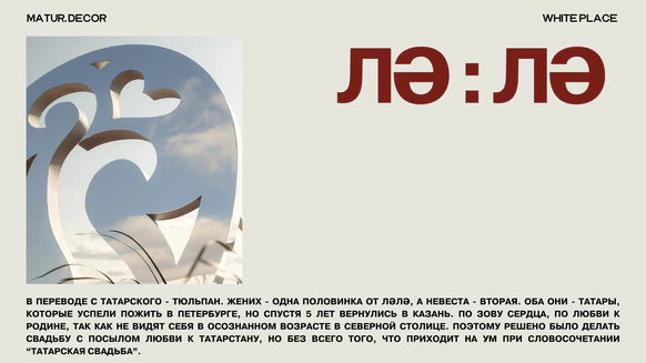 Мы - Даниль и Регина, пара в жизни и партнёры в деле. Основатели студии декора «Матур» из Казани. В 2019 году мы пришли в мир декора, а двумя годами позже создали проект, в котором красота - не случайность, а система. «Матур» в переводе с татарского - «красивый». И мы сделали это нашим стандартом. Иногда мы ловим себя на том, что не помним, где закончился рабочий день и начался семейный вечер - и нам это нравится :) Дом и студия стали единым пространством идей, где семейные ужины легко превращаются в обсуждение новых проектов, а рабочие встречи - в искренние разговоры по душам. В работе мы стремимся к тому, чтобы создать атмосферу, в которой людям хочется быть, праздновать, любить, начинать новое. И мы точно знаем, что за этим стоит не только огромный труд, но и огромная любовь к тому, что мы делаем.