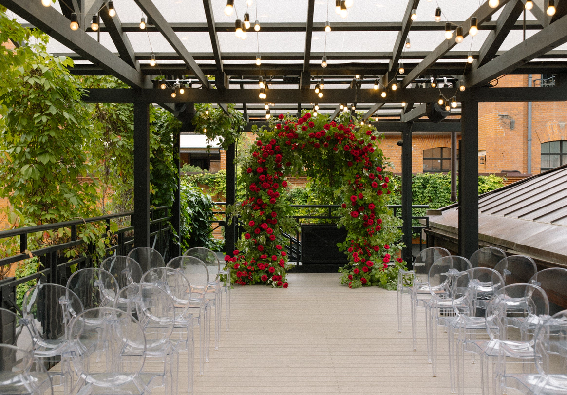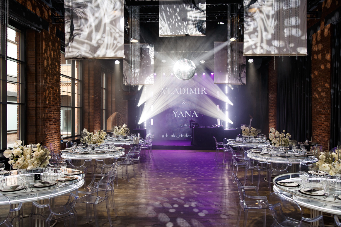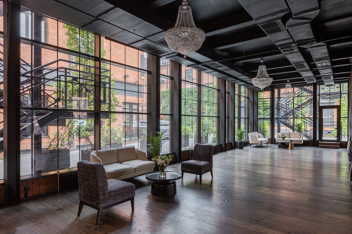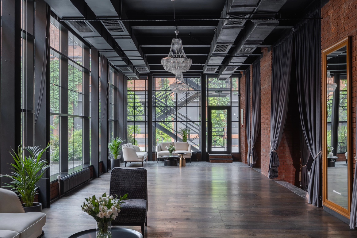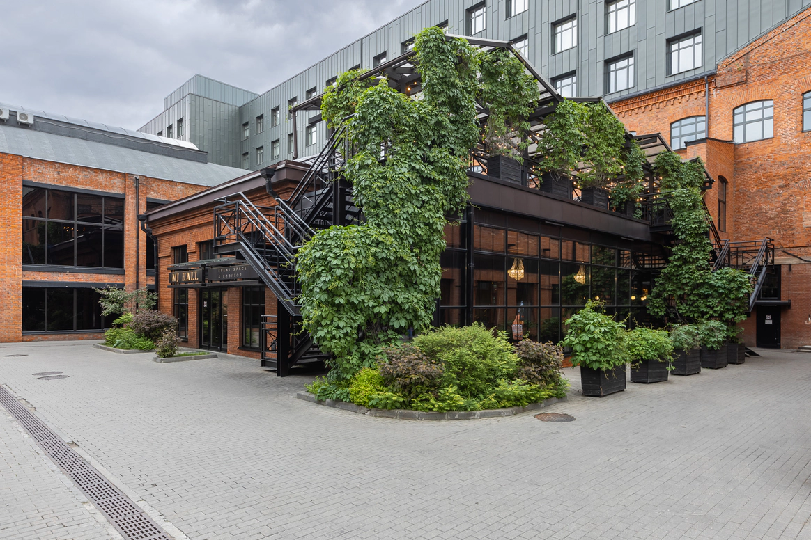 MJ Hall расположен на закрытой территории премиального Loft-квартала Даниловская Мануфактура, где гармонично переплетается архитектурное наследие 19 века и современные дизайнерские решения. Особняк идеально подходит для мероприятий любого формата: свадеб с торжественной церемонией, семейных торжеств, детских праздников, бизнес-конференций, корпоративных вечеров и бизнес-бранчей. 1 этаж вмещает два смежных зала, общей площадью почти 300м2, с панорамным остеклением, каскадом хрустальных люстр , большой барной стойкой и комфортной мягкой мебелью. Плотные бархатные портьеры в высоких кирпичных порталах легко зонируют пространство особняка на 2 зала. Основной зал оснащен центральным четырехметровым светодиодным экраном, профессиональным световым и музыкальным оборудованием, а высота потолка 9 метров дает возможность для выступления воздушных гимнастов. Открытая веранда, утопающая в зелени, располагается на крыше особняка. Скрытая от городского шума, станет идеальным местом для проведения выездной церемонии. Особую романтику и камерность добавляет винтажная гирлянда, теплое свечение которой, летними вечерами создает ни с чем не сравнимую атмосферу.