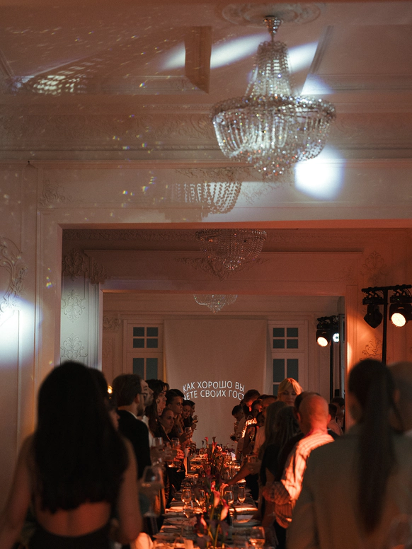 Пространством события стал особняк на Малой Ордынке с панорамными окнами и хрустальными люстрами, позволивший объединить элегантность классической архитектуры с лёгкой французской небрежностью. Сценарий дня разворачивался как прогулка: расслабленное утро с завтраком в кафе вместо традиционных сборов, французская welcome-веранда, художественная церемония и ужин, плавно переходящий в вечернюю вечеринку и afterparty.