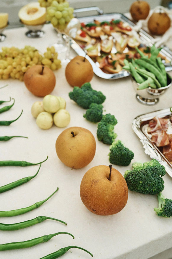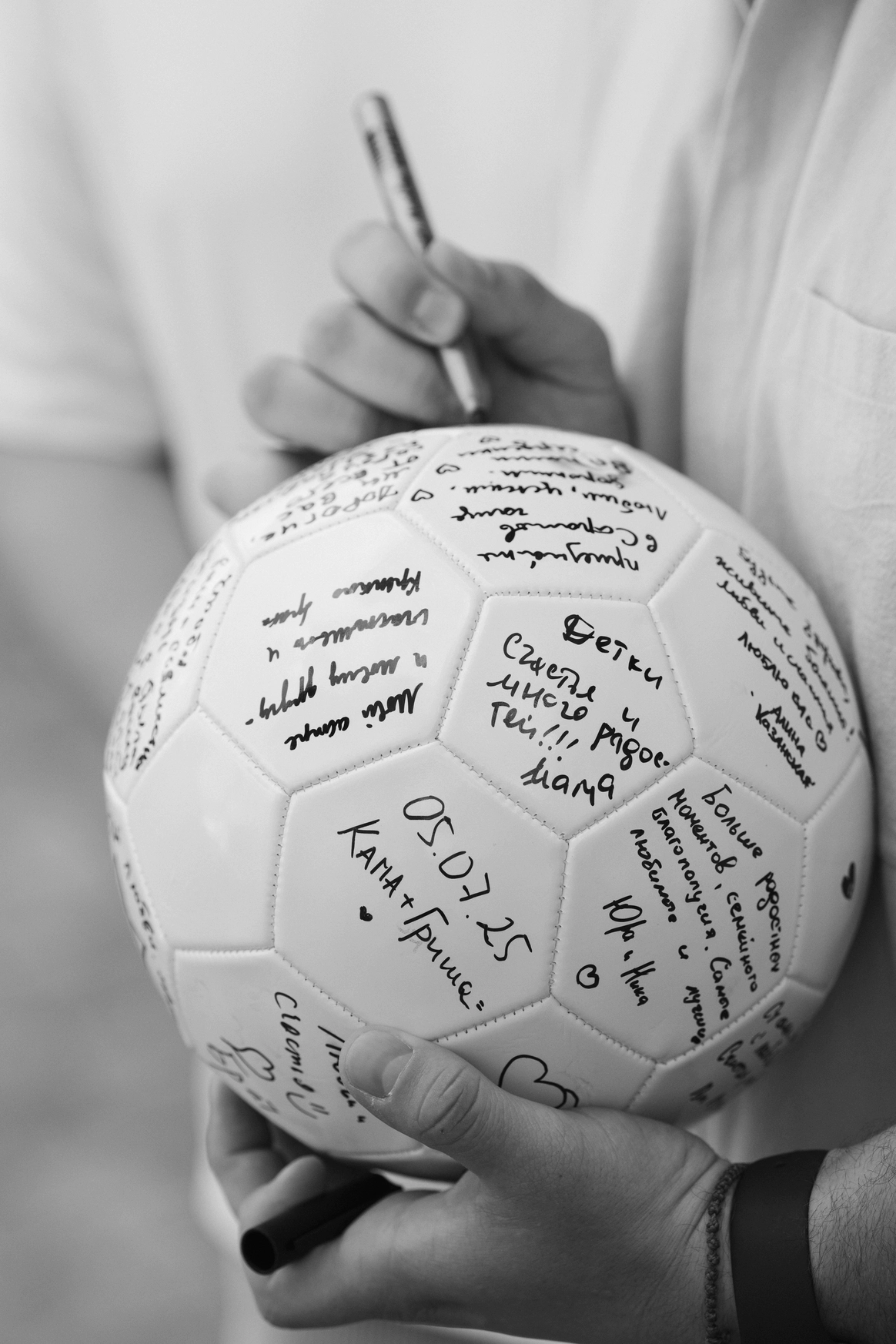 Welcome-зона у открытых ставней особняка была оформлена как летняя французская веранда с виноградом, лёгкими закусками и просекко, создавая атмосферу неспешной городской прогулки. На велком гости писали пожелания на белом футбольном мяче, что отсылало к увлечениям пары.