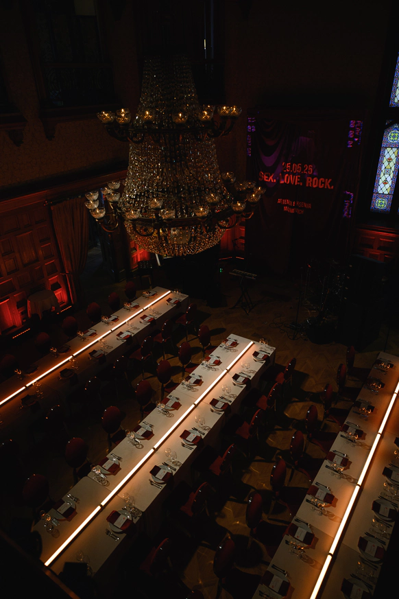 Пространство дополняли игровые элементы, усиливающие атмосферу приватного клуба: тайная комната для неформального общения и курения сигар, газета, в которой описана история пары. Важной частью концепции стала идея личного взаимодействия: вместо традиционного альбома гости оставляли пожелания на игральных картах, формируя живую книгу воспоминаний.