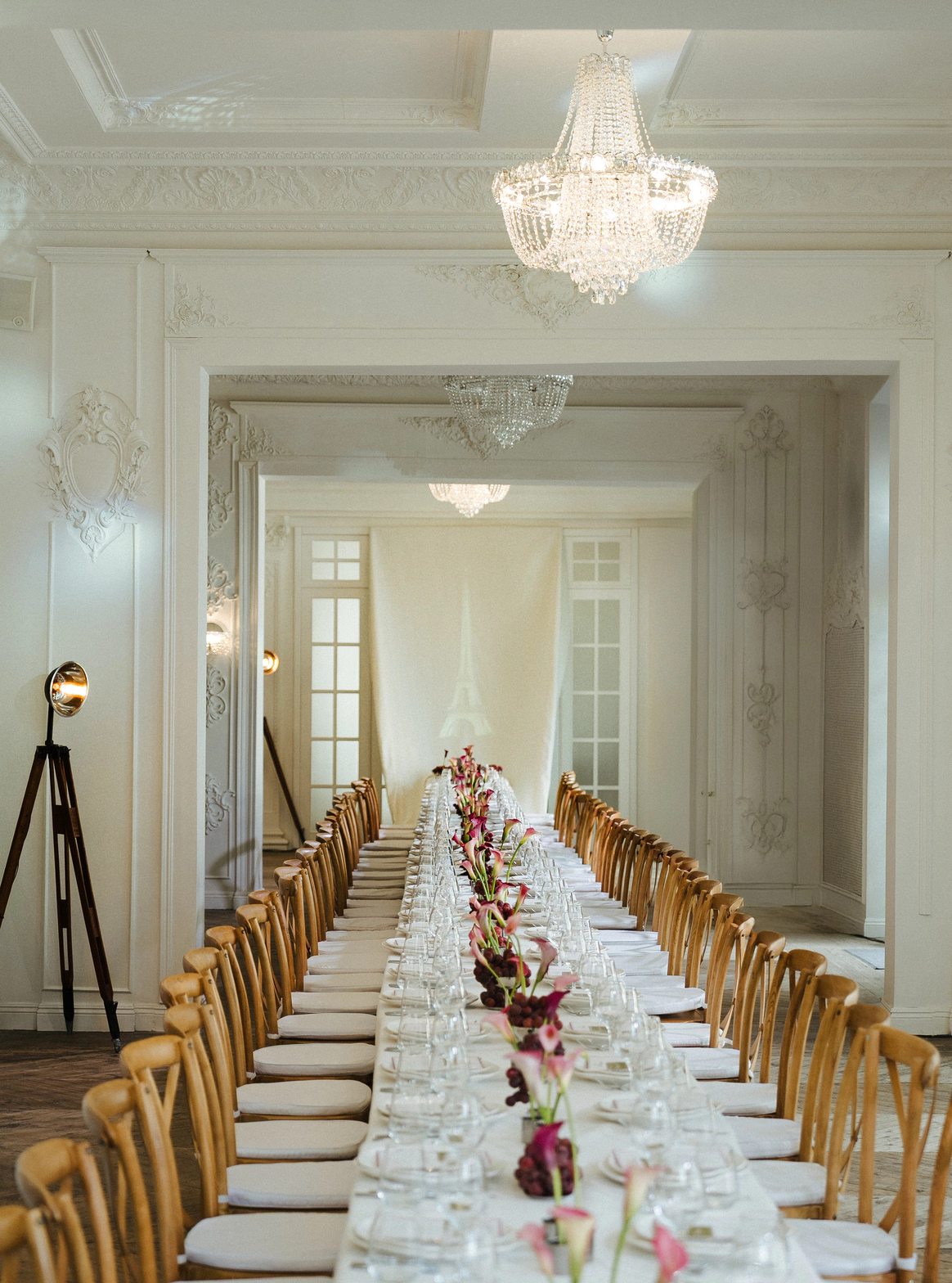Банкетное пространство развивало художественную линию через длинный деревянный стол, текстиль с парижским настроением и декоративные цветы-объекты вместо классической флористики.