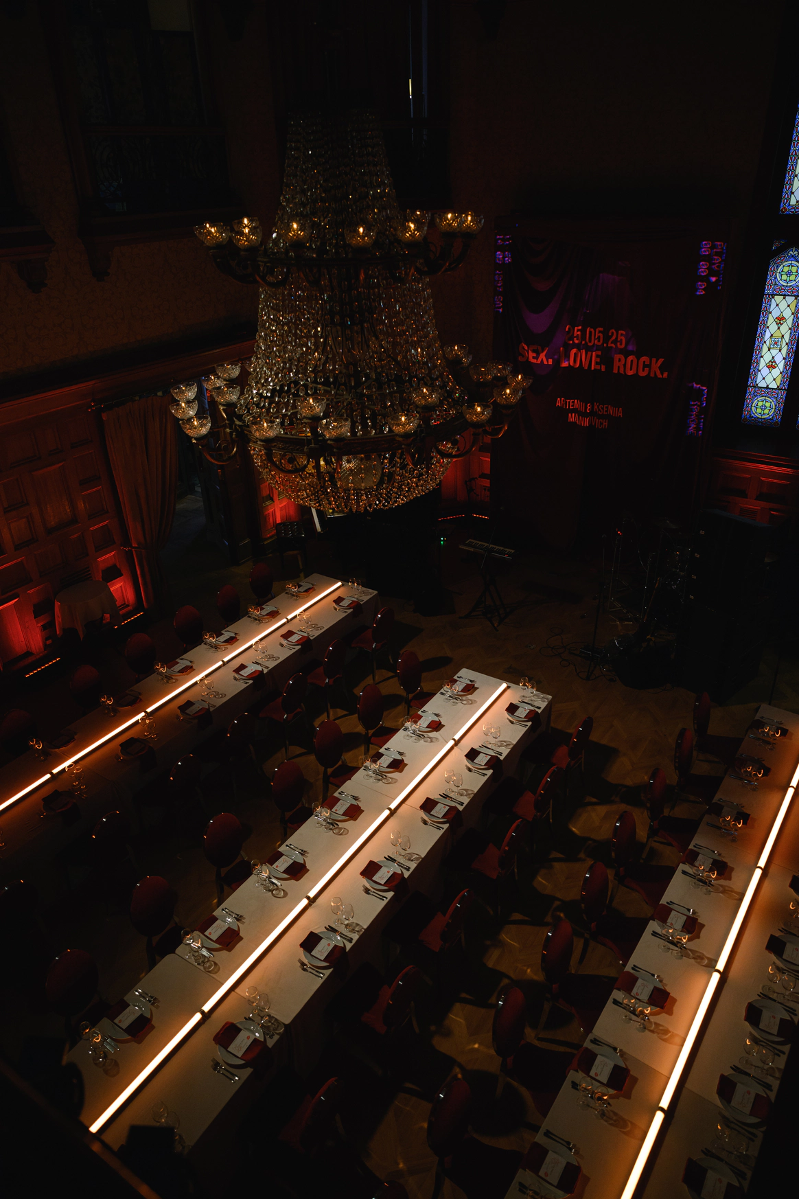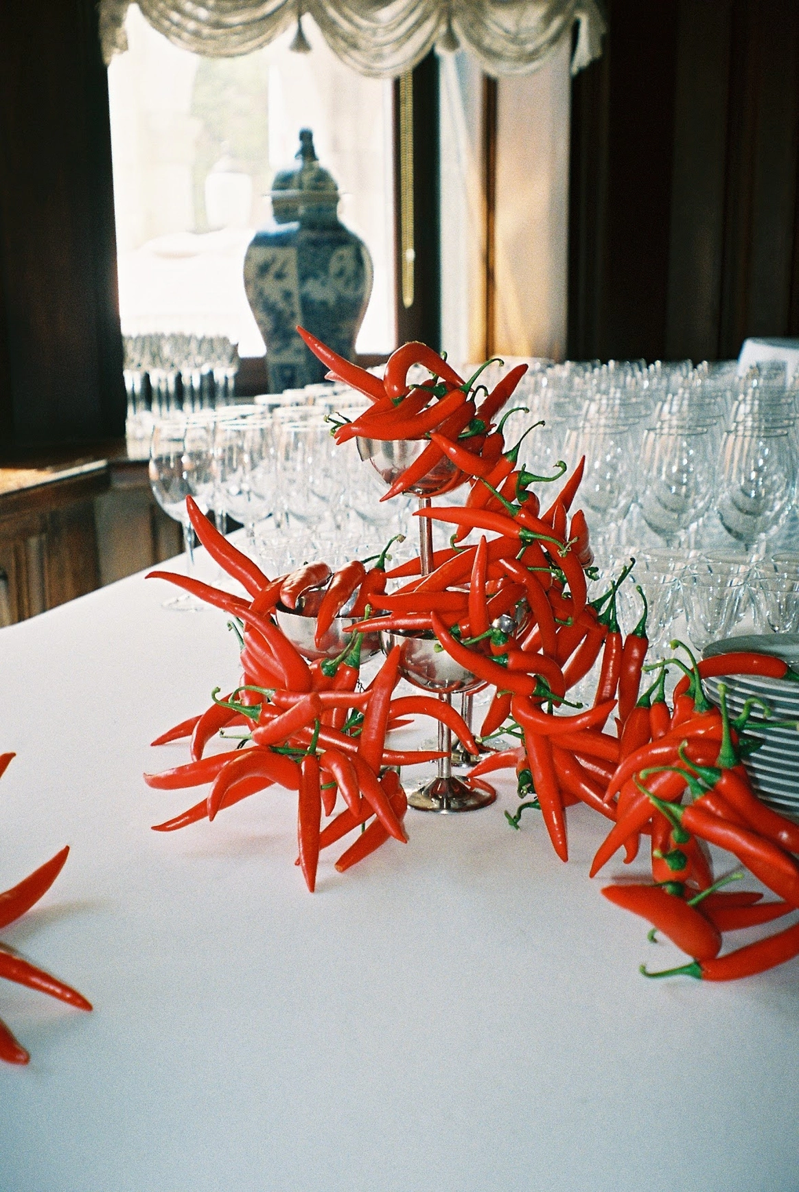 Концепция строилась на сочетании минимализма и провокационных акцентов: доминирующий красный цвет, длинные банкетные столы с декором в виде длинных ламп, создающим чувственную визуальную драматургию. Яркие большие композиции из настоящих перцев на велком.