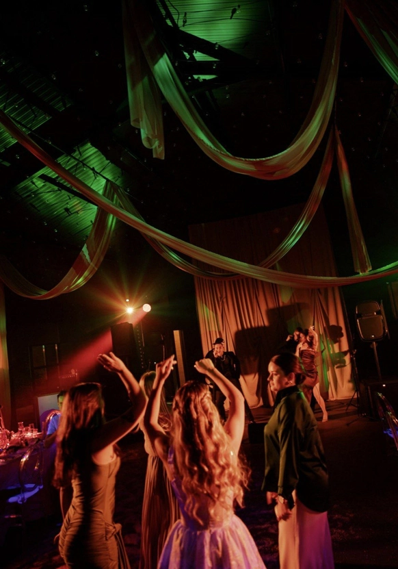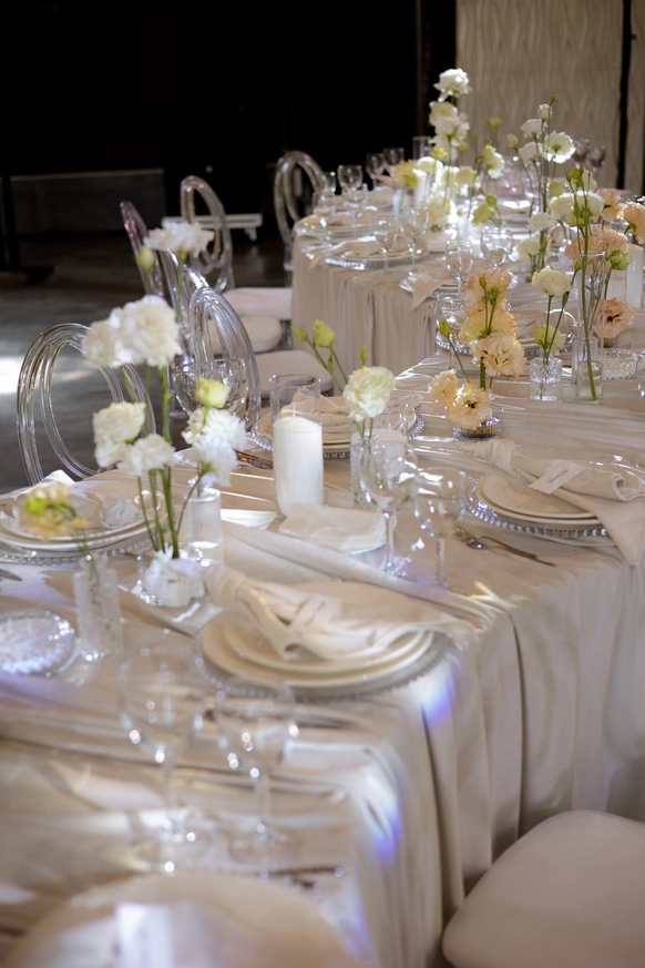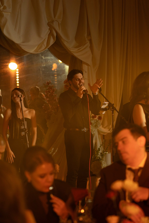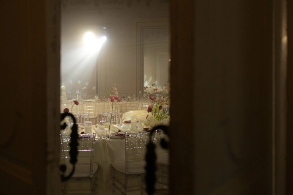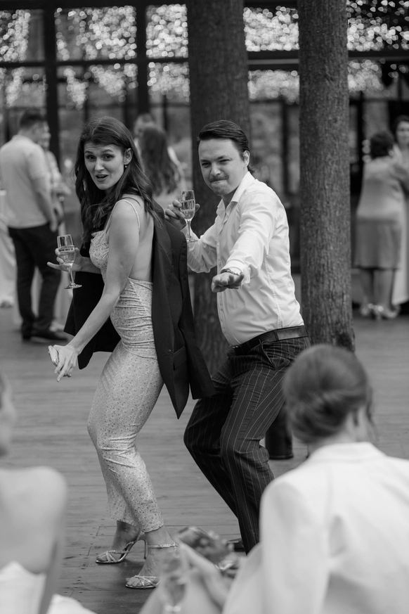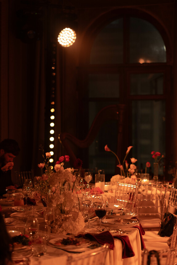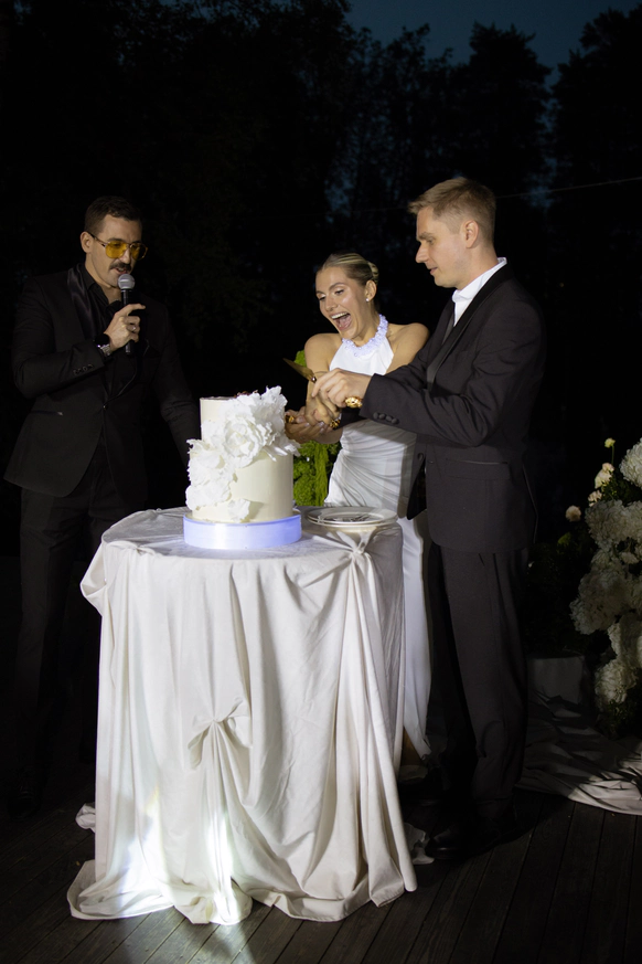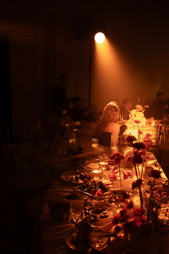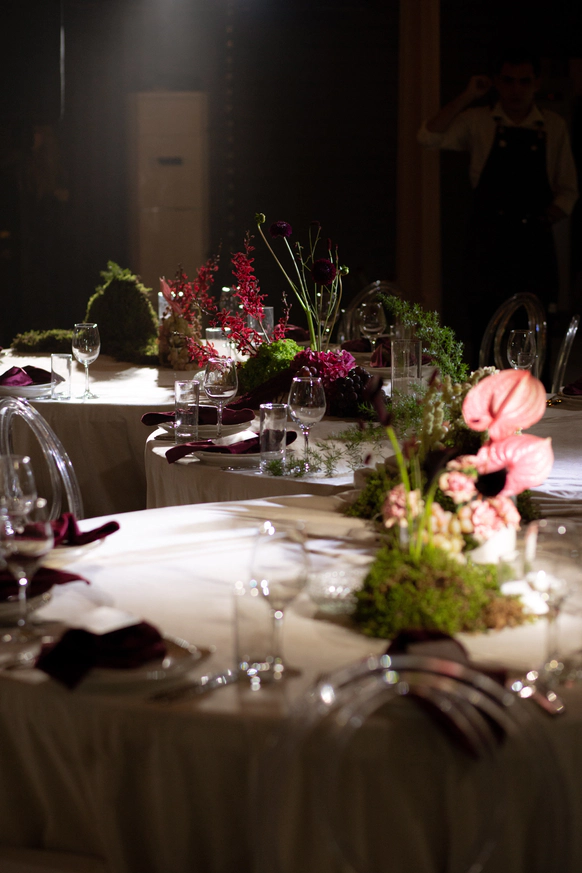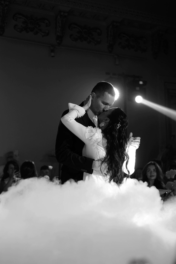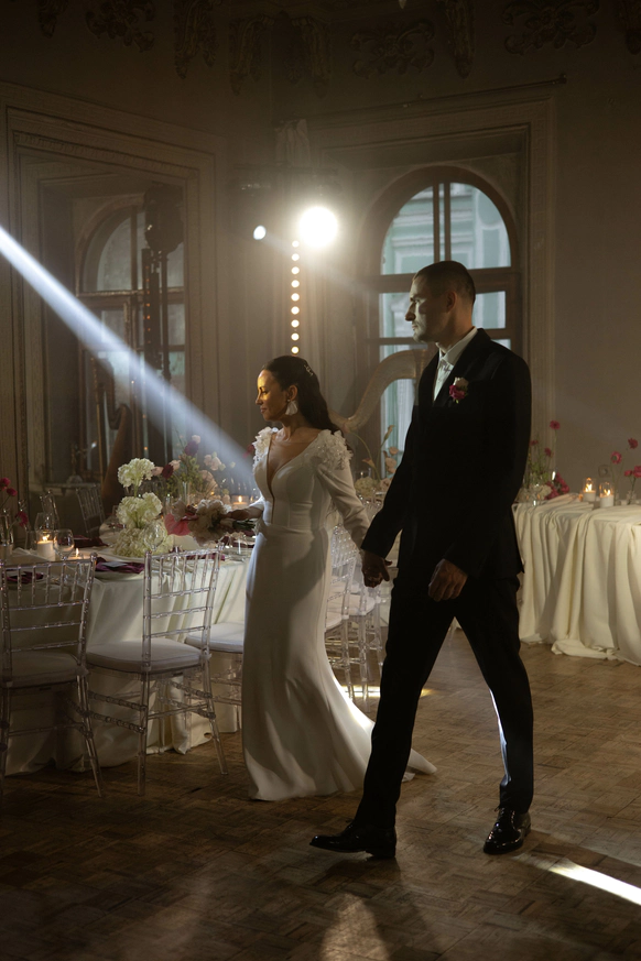 Исторический особняк превратился в волшебное пространство благодаря удивительному сценическому свету. Профессиональные световые режиссёры создали живую атмосферу, где каждый луч света окутывал гостей, погружая их в уникальный мир праздника и чуда. Иллюзионист добавил нотку загадки, а общий стол-«змейка» помог всем почувствовать себя единой большой семьей. Это была свадьба, где история и современная магия слились воедино.