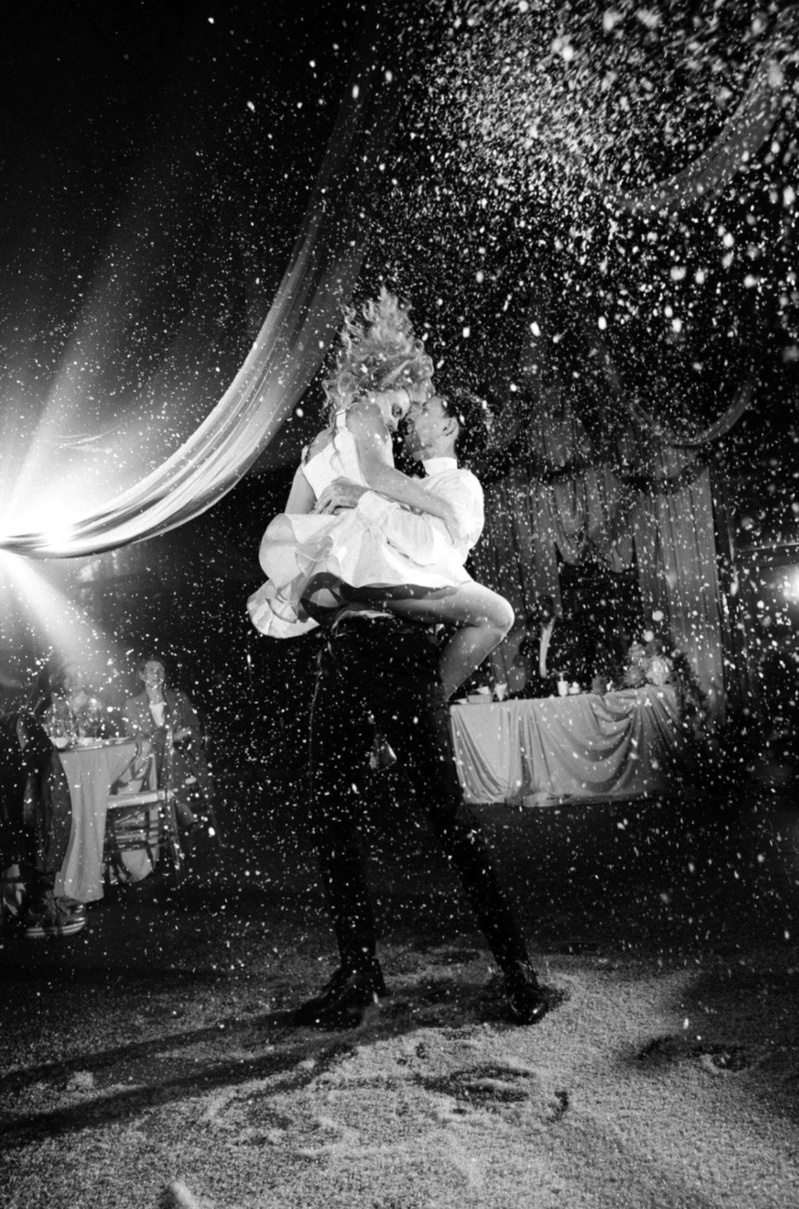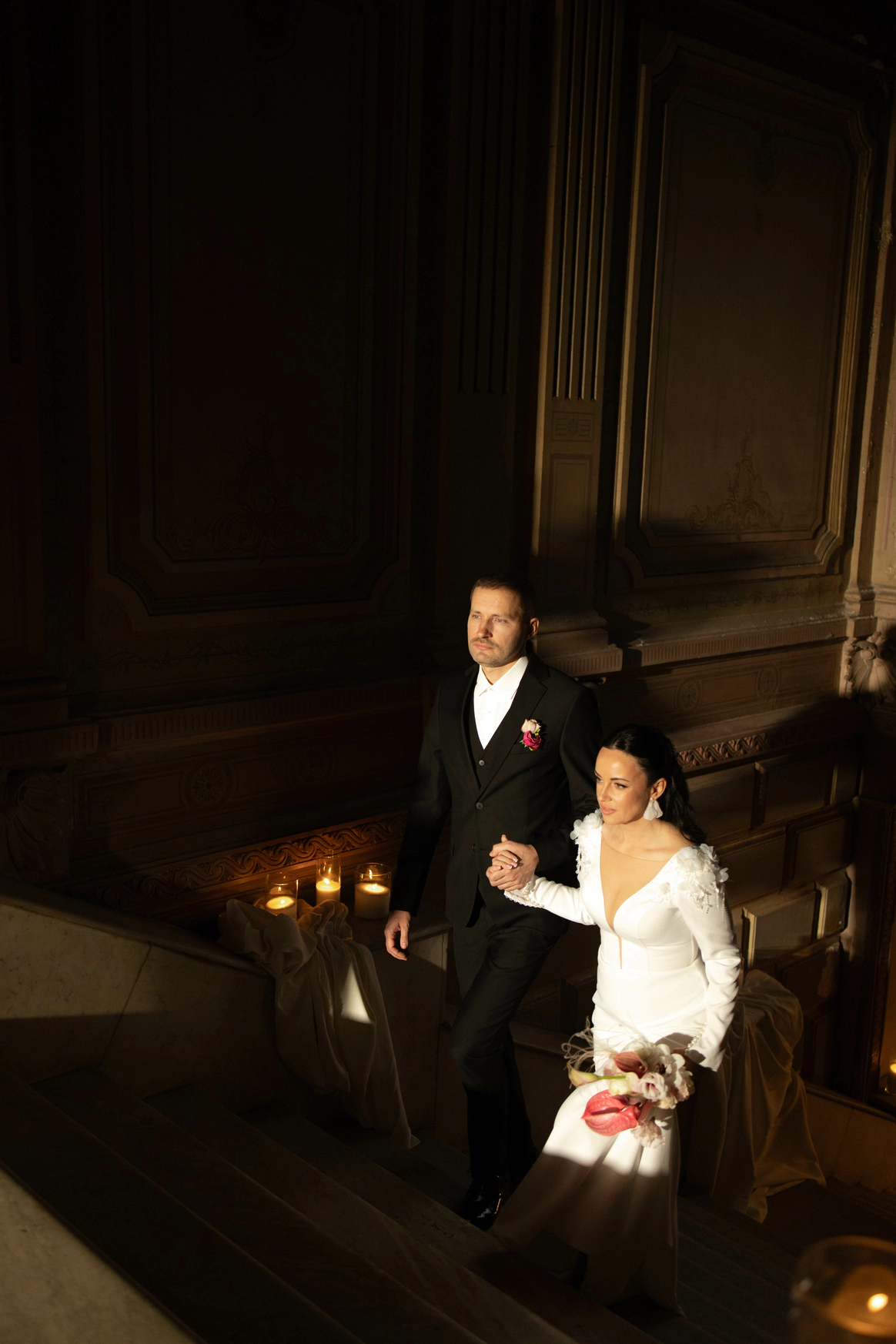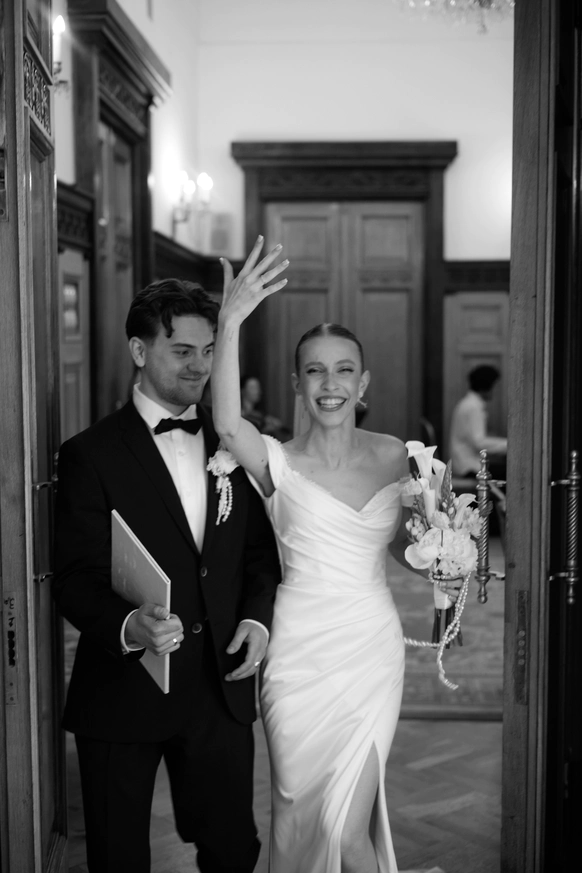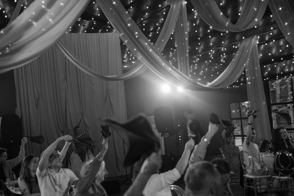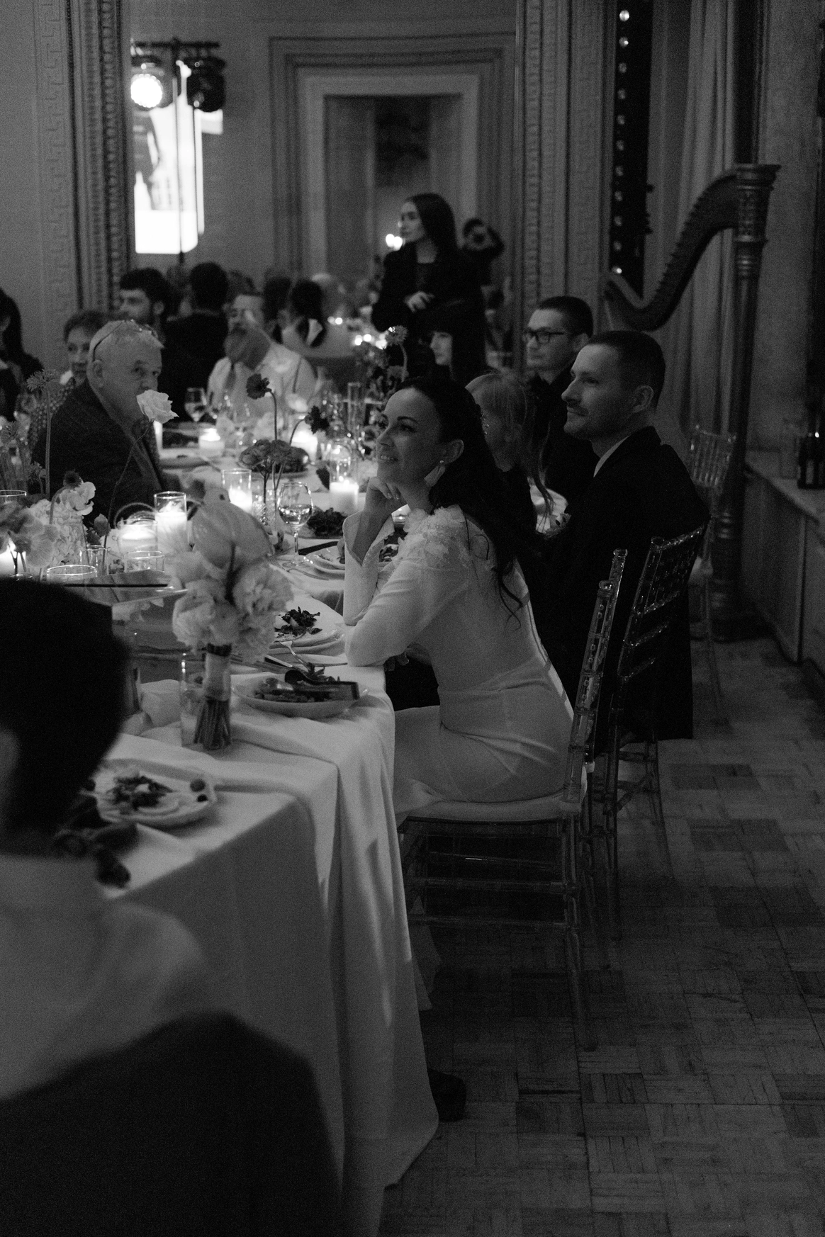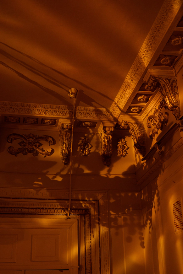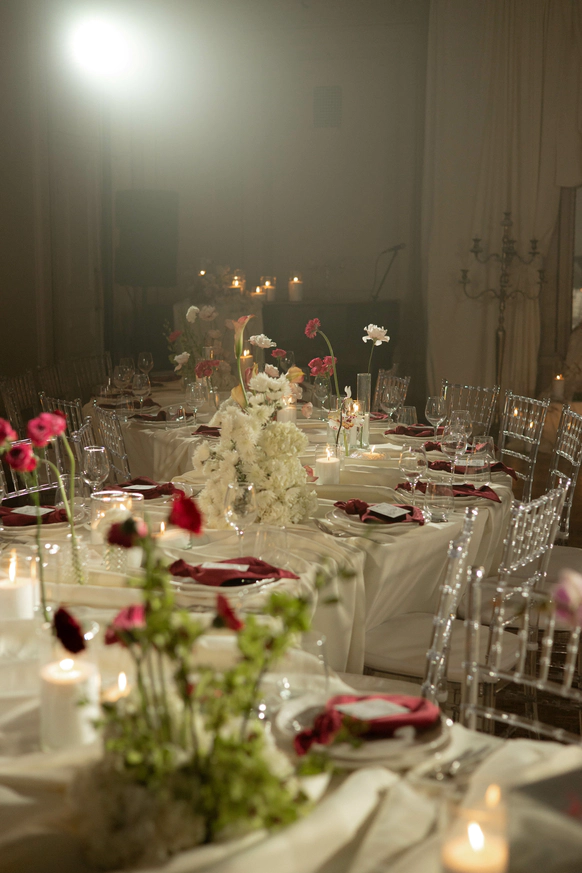 Исторический особняк превратился в волшебное пространство благодаря удивительному сценическому свету. Профессиональные световые режиссёры создали живую атмосферу, где каждый луч света окутывал гостей, погружая их в уникальный мир праздника и чуда. Иллюзионист добавил нотку загадки, а общий стол-«змейка» помог всем почувствовать себя единой большой семьей. Это была свадьба, где история и современная магия слились воедино.