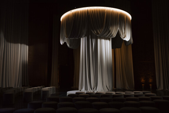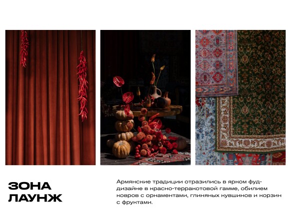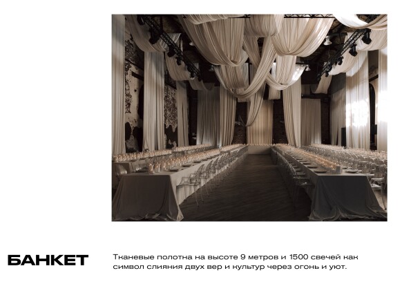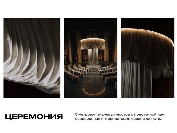 Национальная свадьба, где удалось совместить еврейские и армянские традиции в новом светском прочтении. Как декоратор я смогла воплотить эту концепцию и смыслы от организатора, грамотно поработать с тканями в масштабе, реализовать футурустичную люстру-хупу и детально разработать авторский фуд-дизайн с армянскими мотивами.