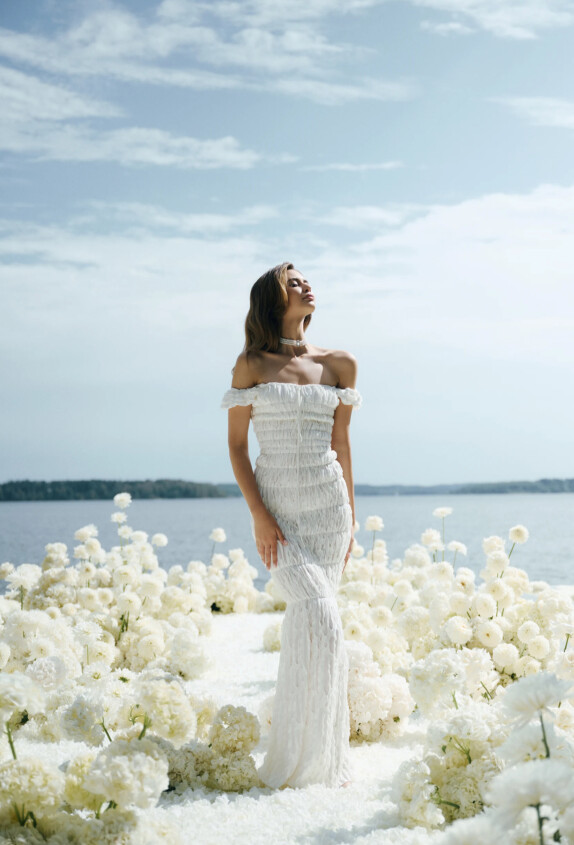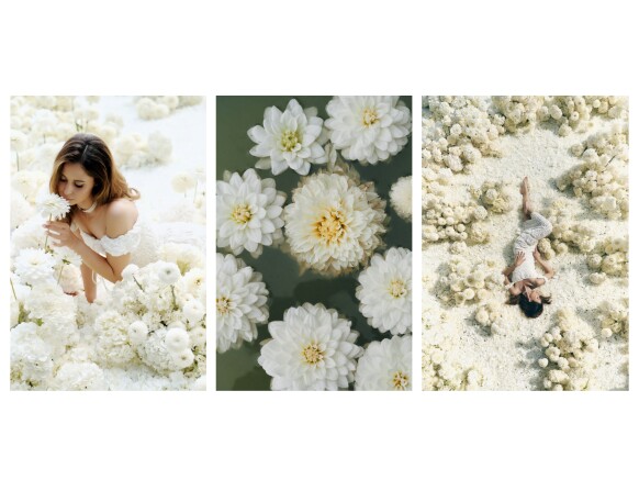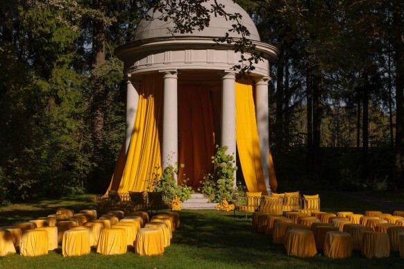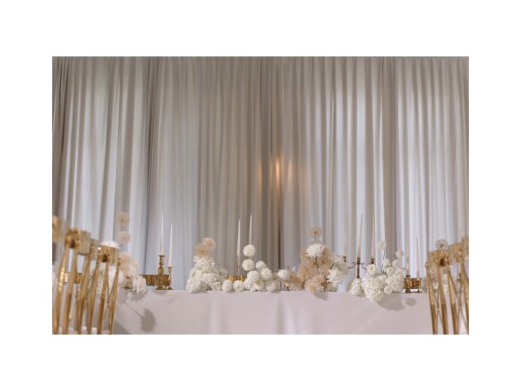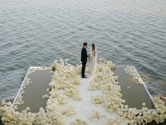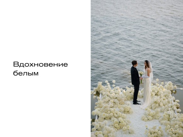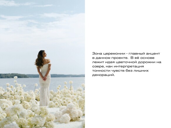 Этот проект про тонкое внедрение монохромного декора в природную локацию через работу с живым цветком и авторский взгляд на современную классику. Главный акцент - церемония на пирсе, где было использовано более 3 тысяч голов фермерских георгинов и хризантем, с внедрением резервуаров с водой для эффекта "цветочной дорожки" на озере.