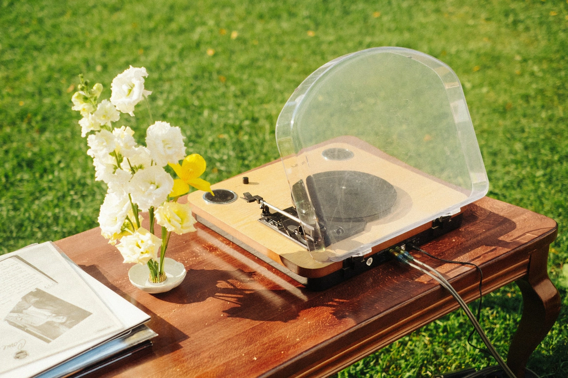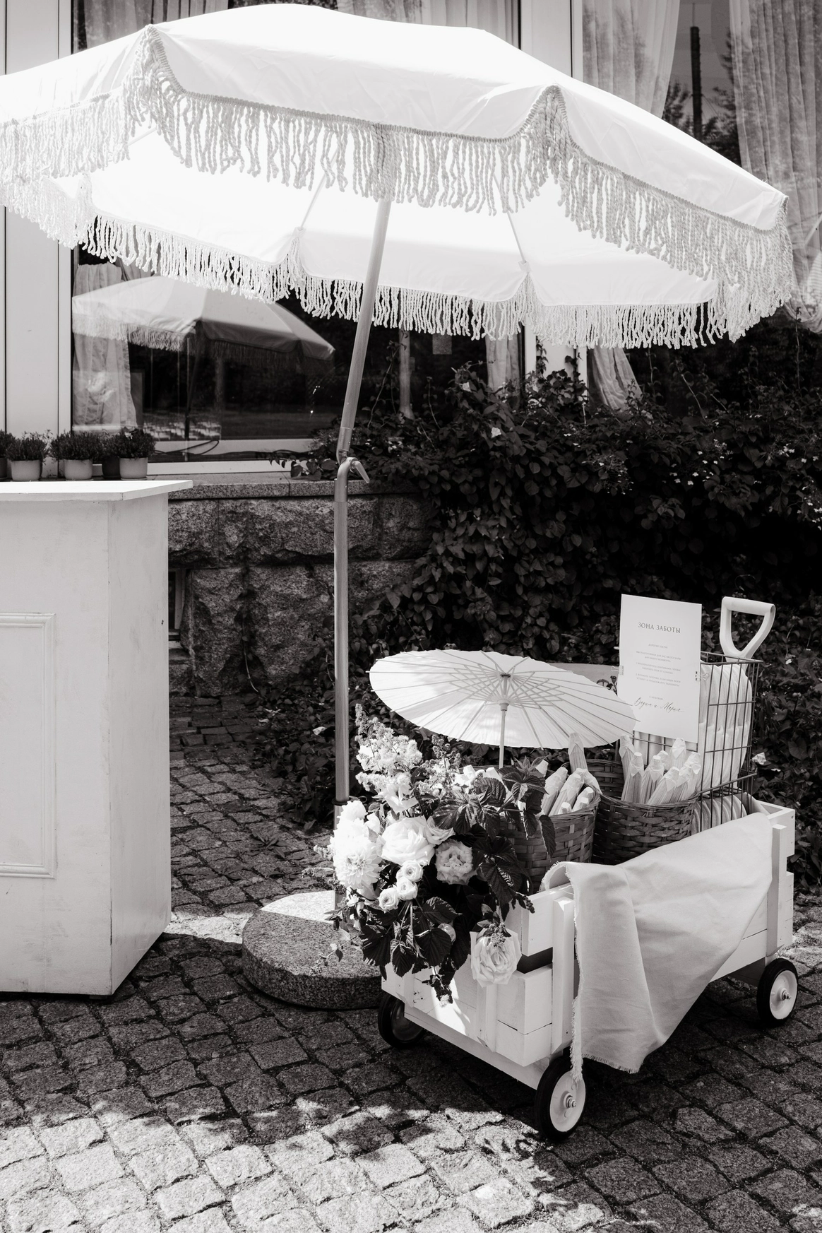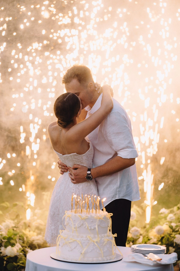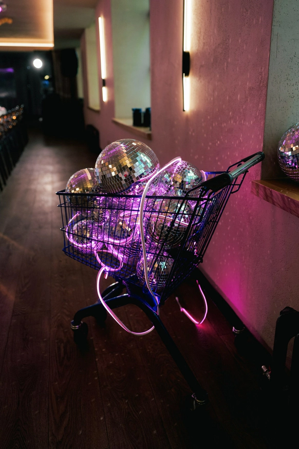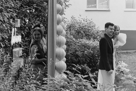 Цвет - главный инструмент: яркие акценты, текстильные цветы (шила невеста), два платья, одно сшито из её ткани для фаты (наша идея). Отсылки к BMW: синяя телега из супермаркета («телега»), которую ребята сами грунтовали и красили, внутри - диско-шары. Всё работало на «ненапряжную», но глубоко личную атмосферу.