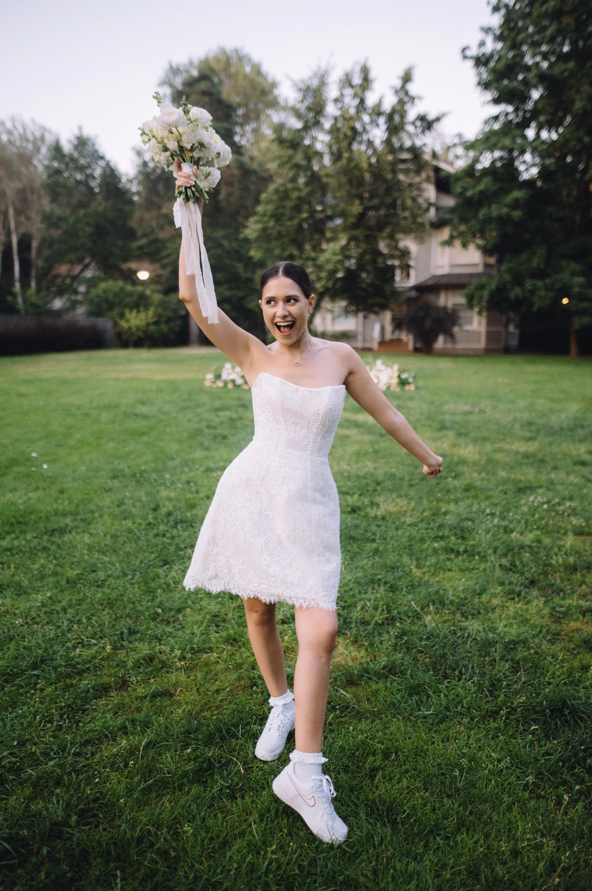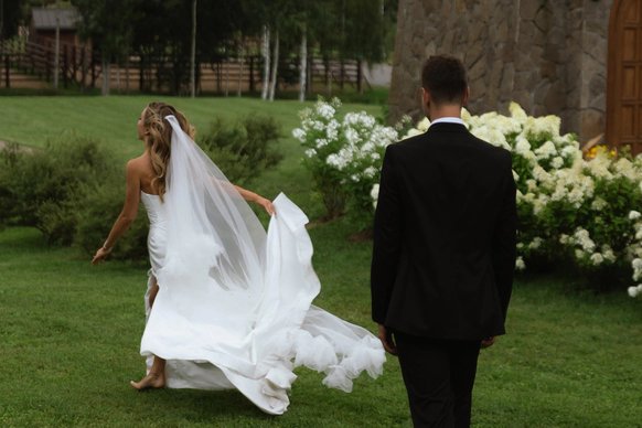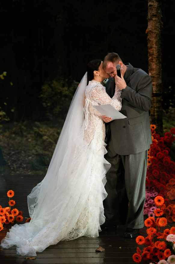 В итоге мечта о лесной церемонии превзошла себя: под сводами сосен, среди моховых холмов, в дату их знакомства, под живой оркестр и дождь в кульминационный момент - "это была магия", сказала Карина.