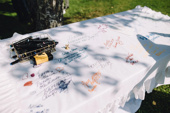 Стол-подкастошная, скатерть для росписи (семейная реликвия), гаражная распродажа с личными вещами пары, индивидуальные подарки для гостей, клятвы - письма друг другу, видео-сюрпризы от кота Марса, финал с песнями под оркестр.