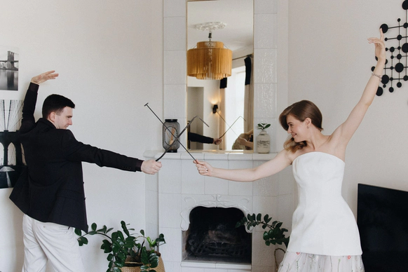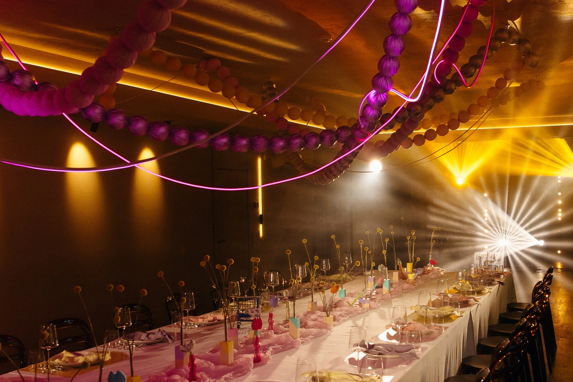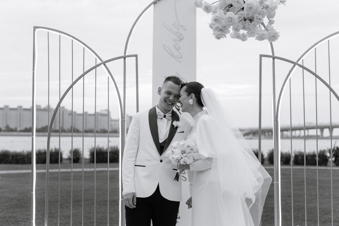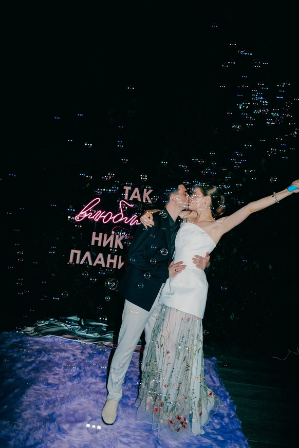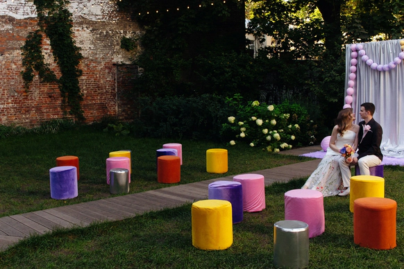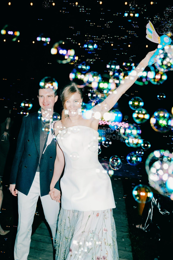Главный запрос звучал так: «Хочется цвета. Должно быть ярко, весело, интересно и не напряжно». Итог: городская локация с парком, вытянутый зал с единым столом, двойная арка на церемонии, собственноручно сшитые невестой цветы на стол, идеальный сабраж, битва на мечах на сборах и миллион мыльных пузырей в финале вместо бенгальских огней.