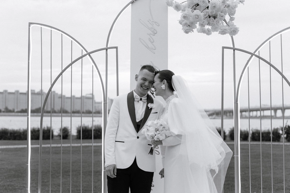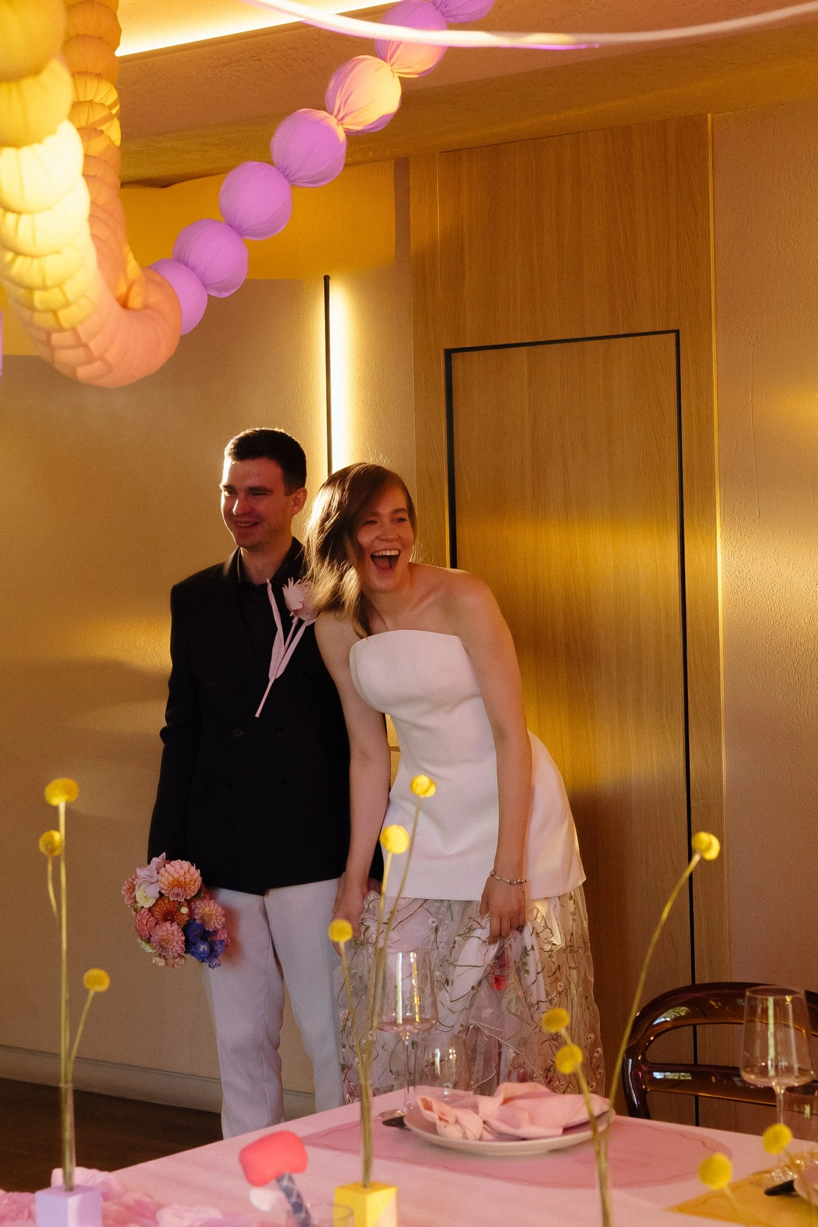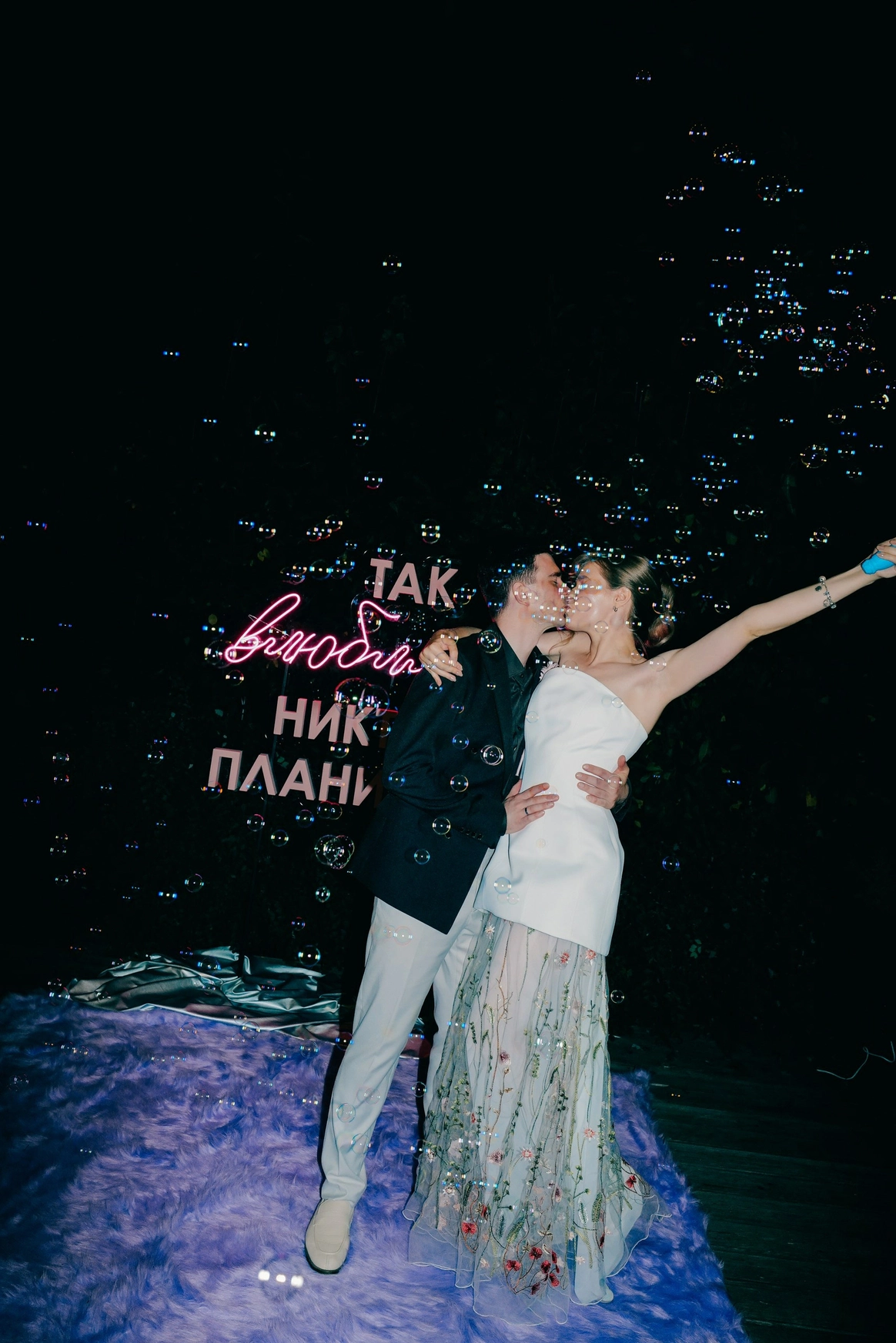 Мы сделали её инженерной загадкой: на церемонии две арки. Первая - штора с бусами, вторая - неоновая вывеска с той самой фразой. В нужный момент штора падает, открывая надпись - символ того, как их непланируемая встреча стала главным событием. Неон в последствие стал семейной реликвией.