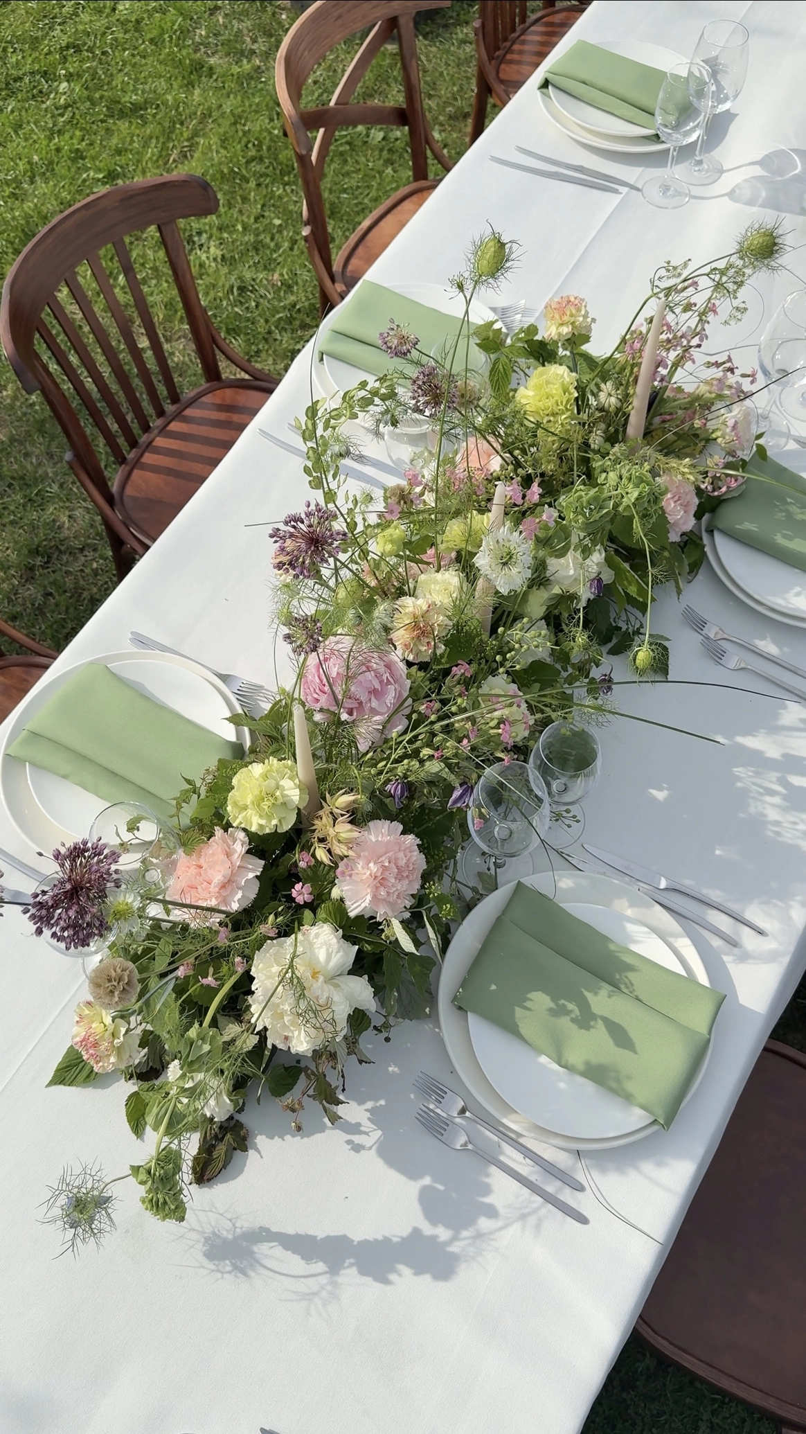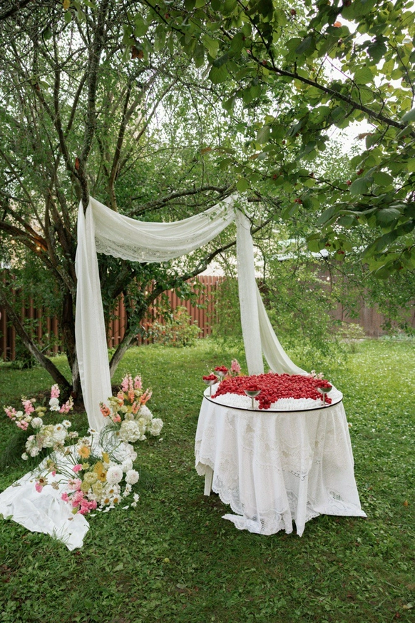Мы не создавали декорации "русской свадьбы", мы работали с настоящим пространством и настоящей историей. Церемония прошла под яблоней, под которой прошло детство невесты. На столах стоял бабушкин хрусталь и сервиз, композиции из садовых цветов.