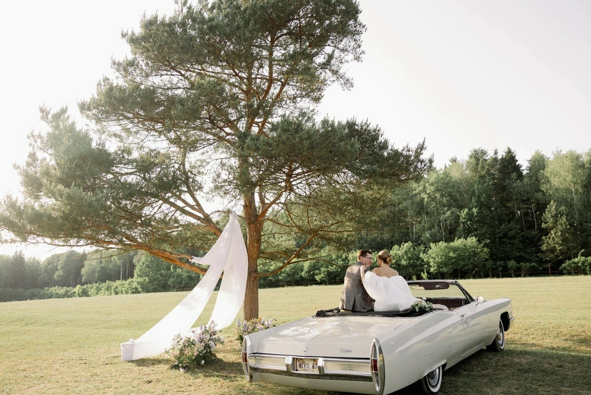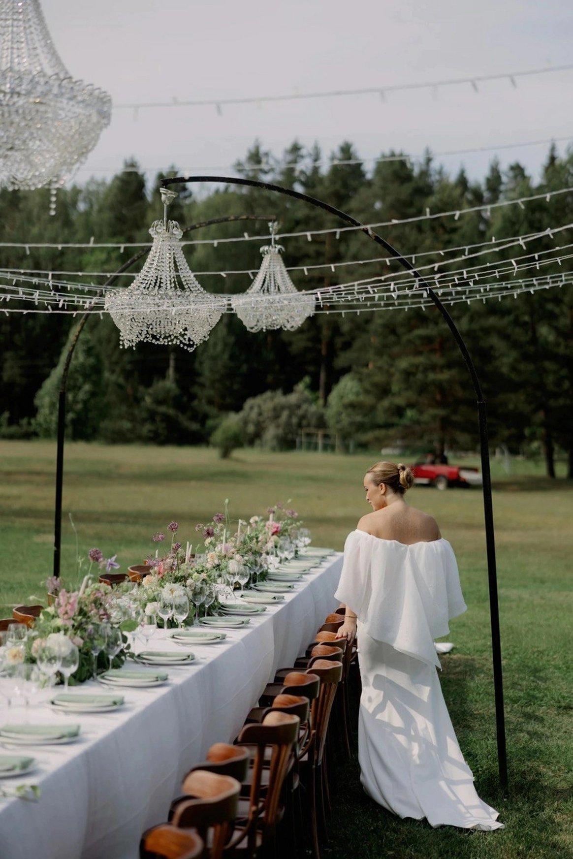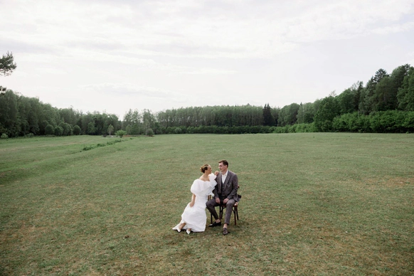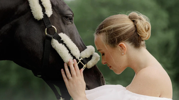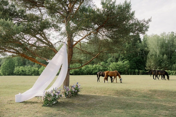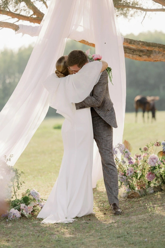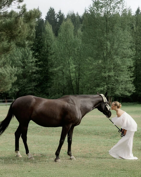 Летняя загородная площадка идеально отвечала этой идее - открытый воздух, природное окружение и свободно гуляющие лошади подчеркнули естественность и внутреннюю свободу пары.