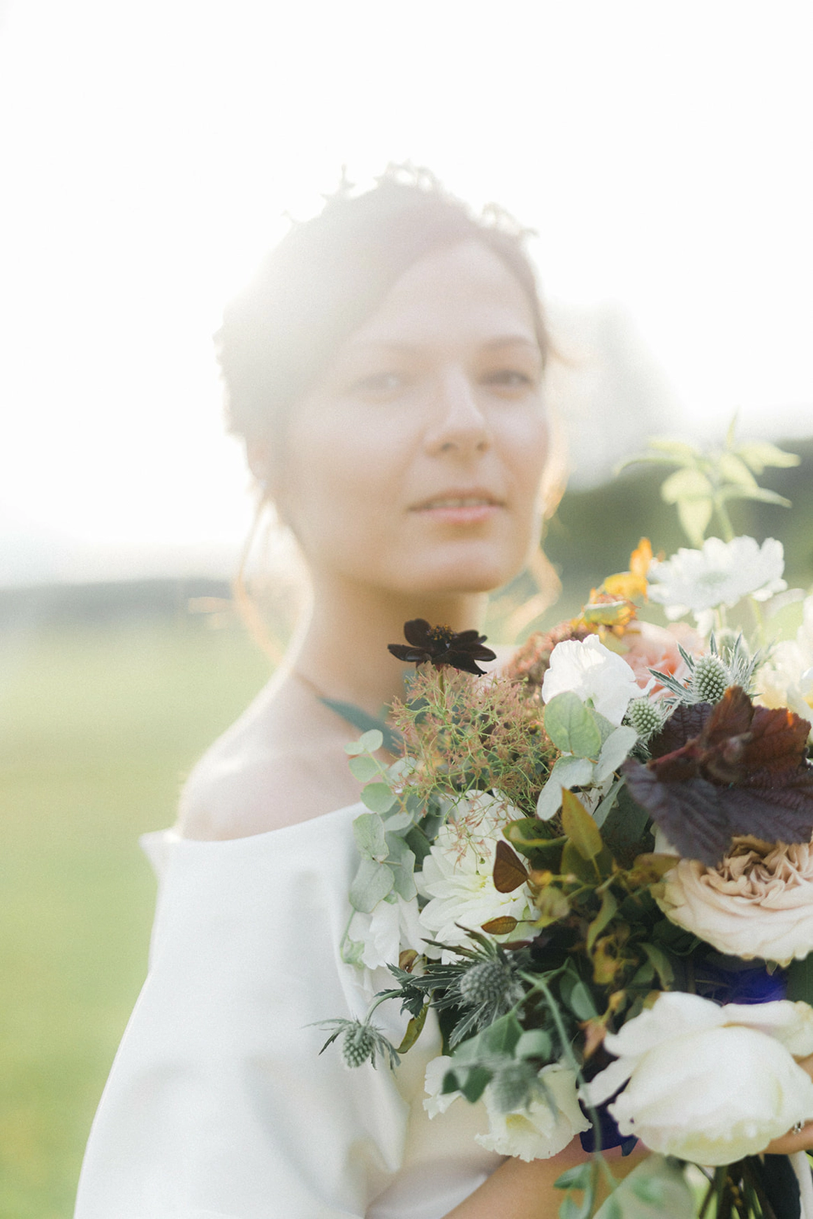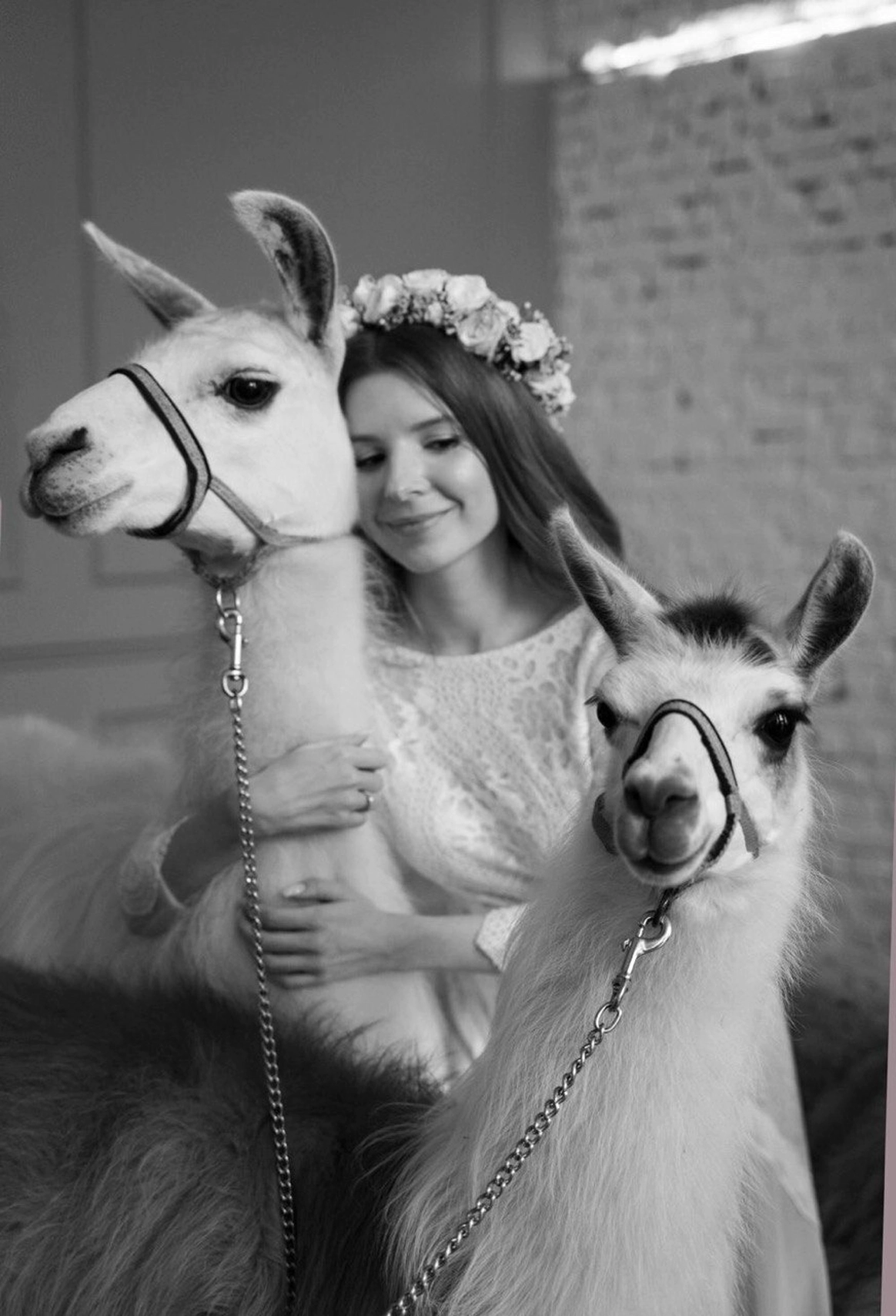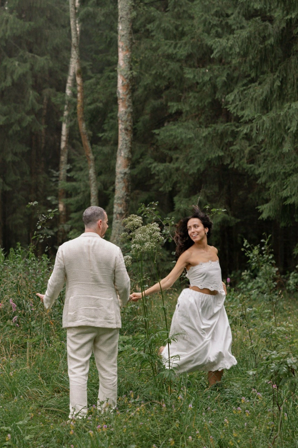Летняя загородная площадка идеально отвечала этой идее - открытый воздух, природное окружение и свободно гуляющие лошади подчеркнули естественность и внутреннюю свободу пары.