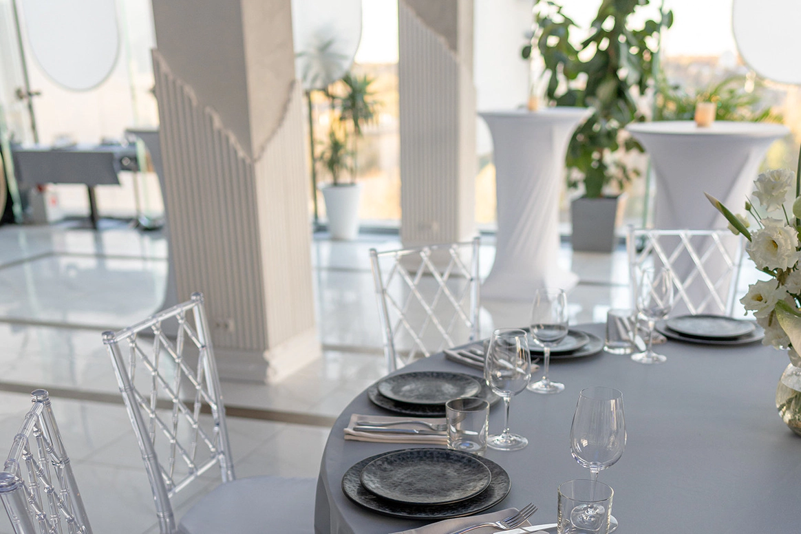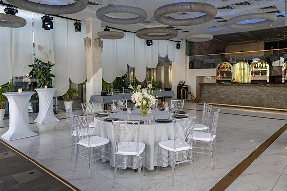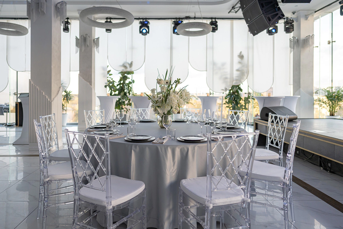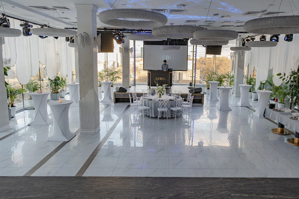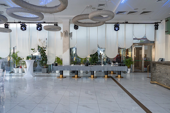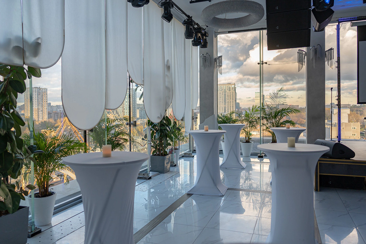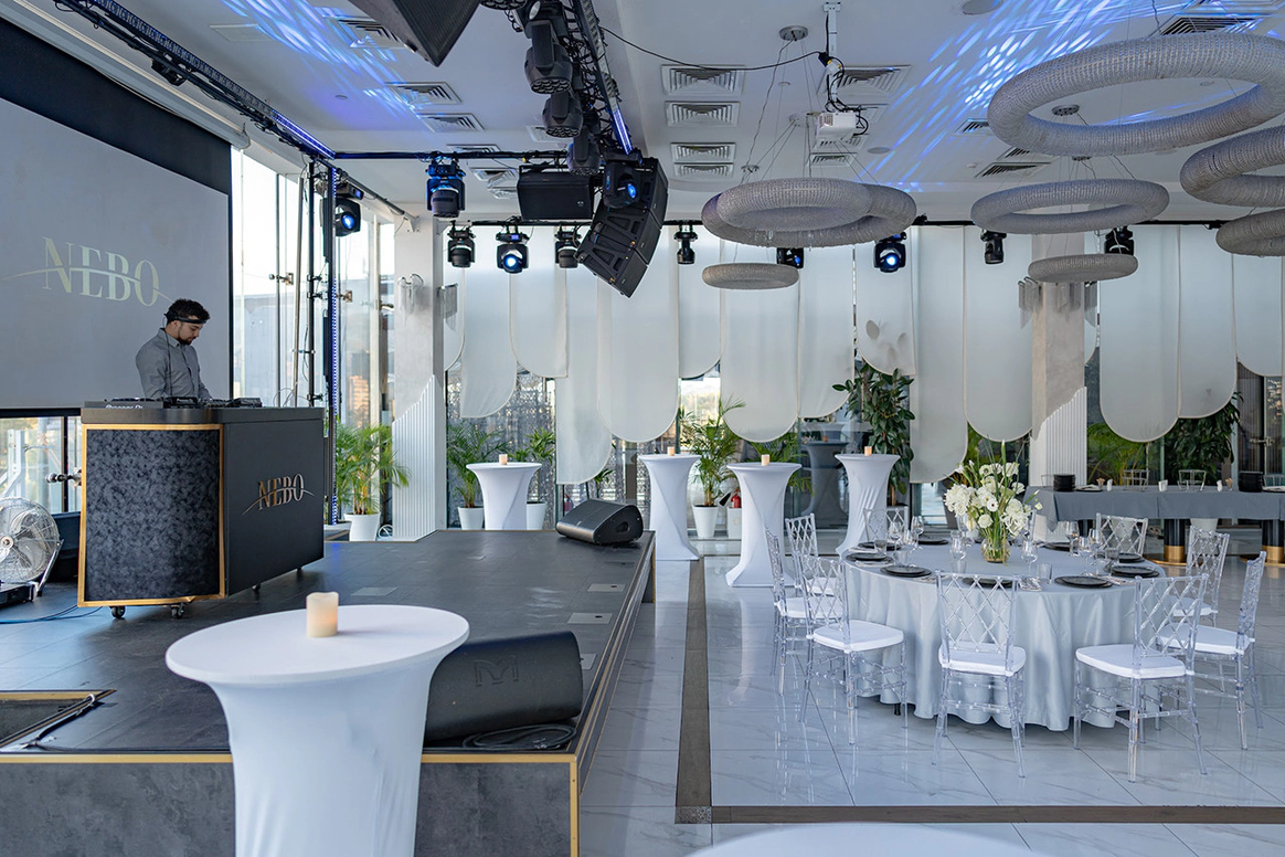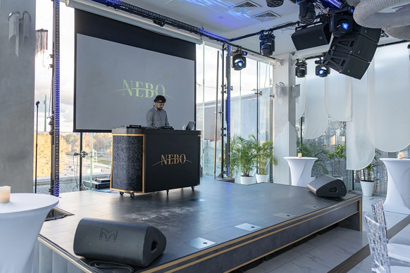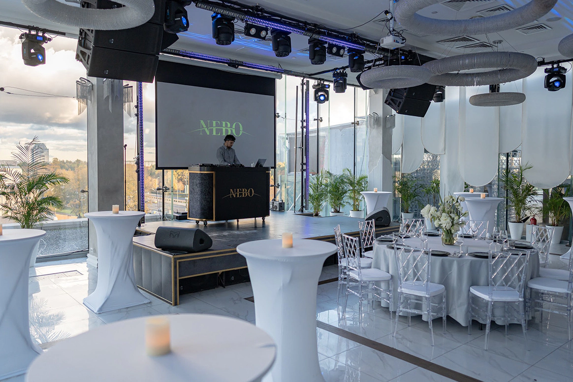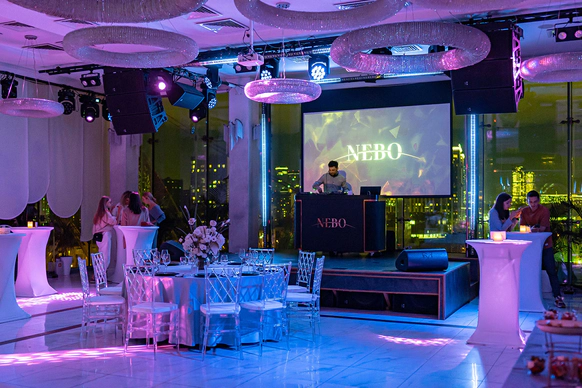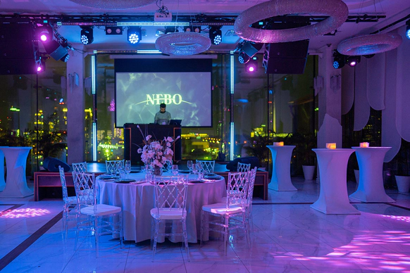 NEBO - это уникальная банкетная площадка,расположенная на 5-м этаже Галерей «Времена Года» по соседству с величественным Парком Победы. Удобное месторасположение, изысканная кухня, атмосферный интерьер и завораживающий панорамный вид на город - сделают мероприятие незабываемым. NEBO - идеальная площадка как для камерного семейного праздника, так и для роскошного торжества. Площадка имеет Подиумный зал, летнюю Веранду и Караоке - зал с отдельным входом. Самодостаточный интерьер и полный комплект технического оборудования позволят провести мероприятие любой сложности, не требуя дополнительных вложений. Площадка имеет просторное welcome-пространство. Двухуровневый зал возможно использовать как единое пространство, так и выделить вип-зону с камином. Зал оснащен звуковым, световым и видеопроекционным оборудованием, а так же сценическим подиумом. Панорамное остекление обеспечивает потрясающие видовые характеристики. Уникальный самодостаточный интерьер, красивая мебель, шикарный текстиль - все это является залогом организации мероприятия высокого уровня.