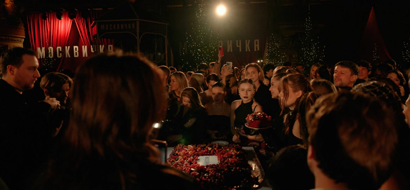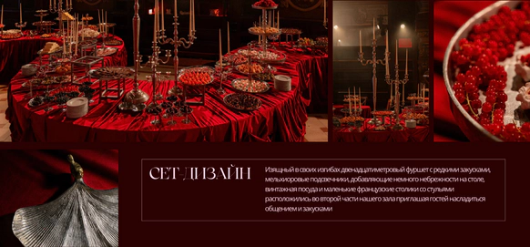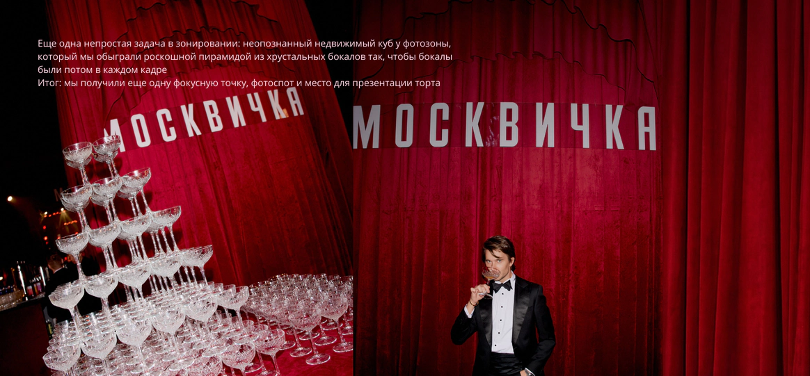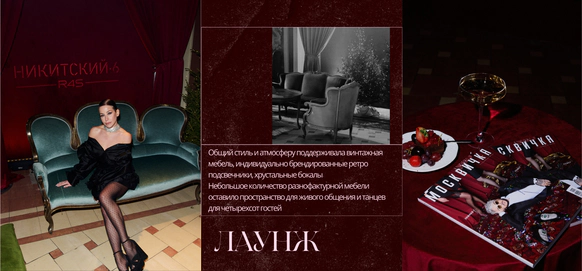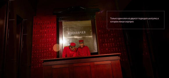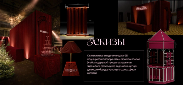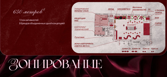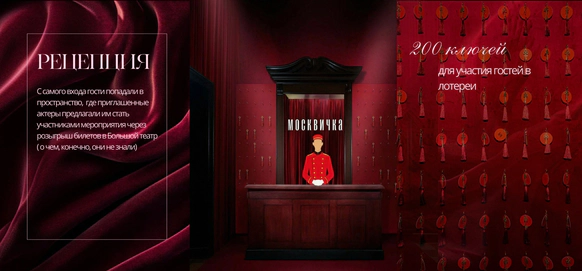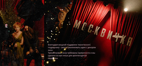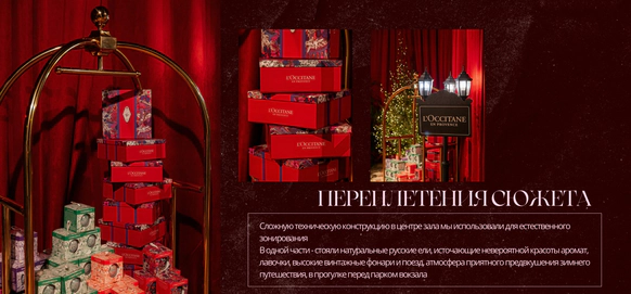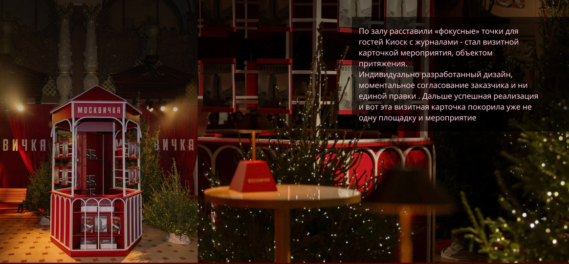 Идея: Театральность проработали через актеров, театр кукол, винный бархат, активную зону с шампанским и сцену с кулисами. Станцию вокзала имитировали за счет декоративного паровоза. Привокзальную площадь оформили кастомным киоском, елями и фонарями.