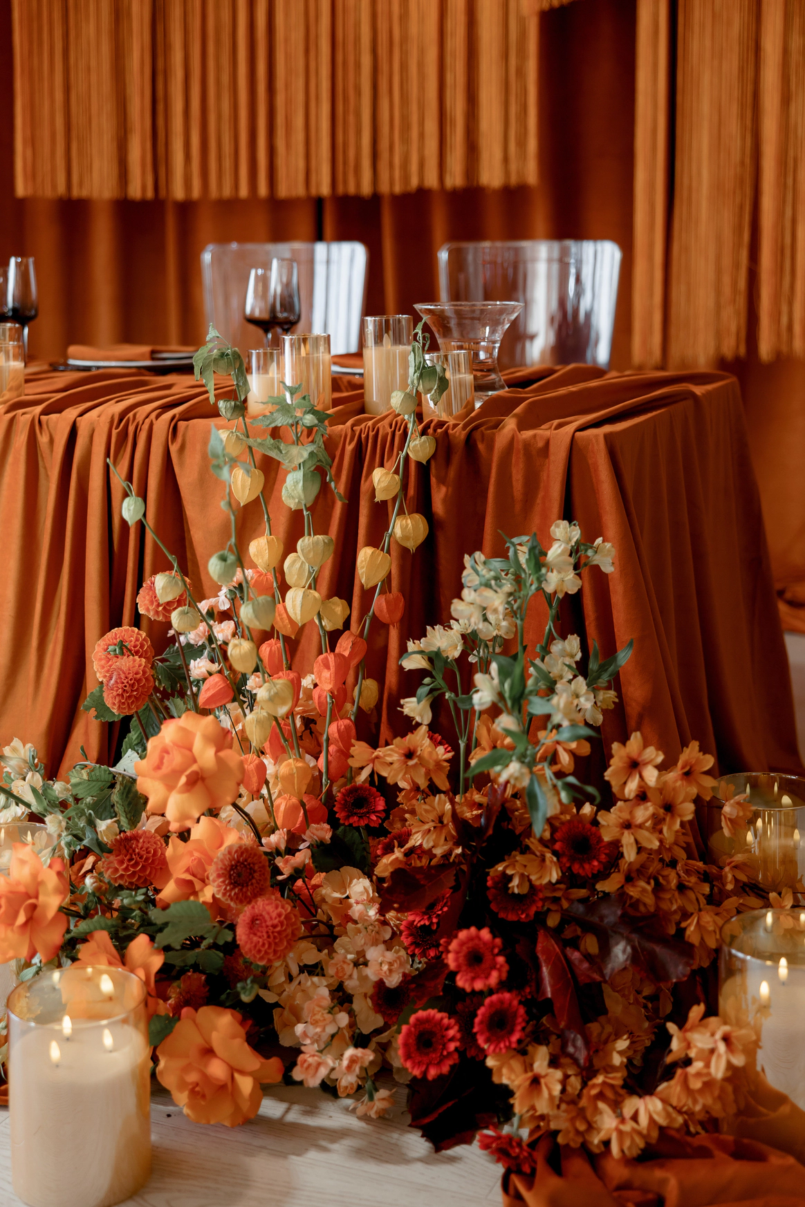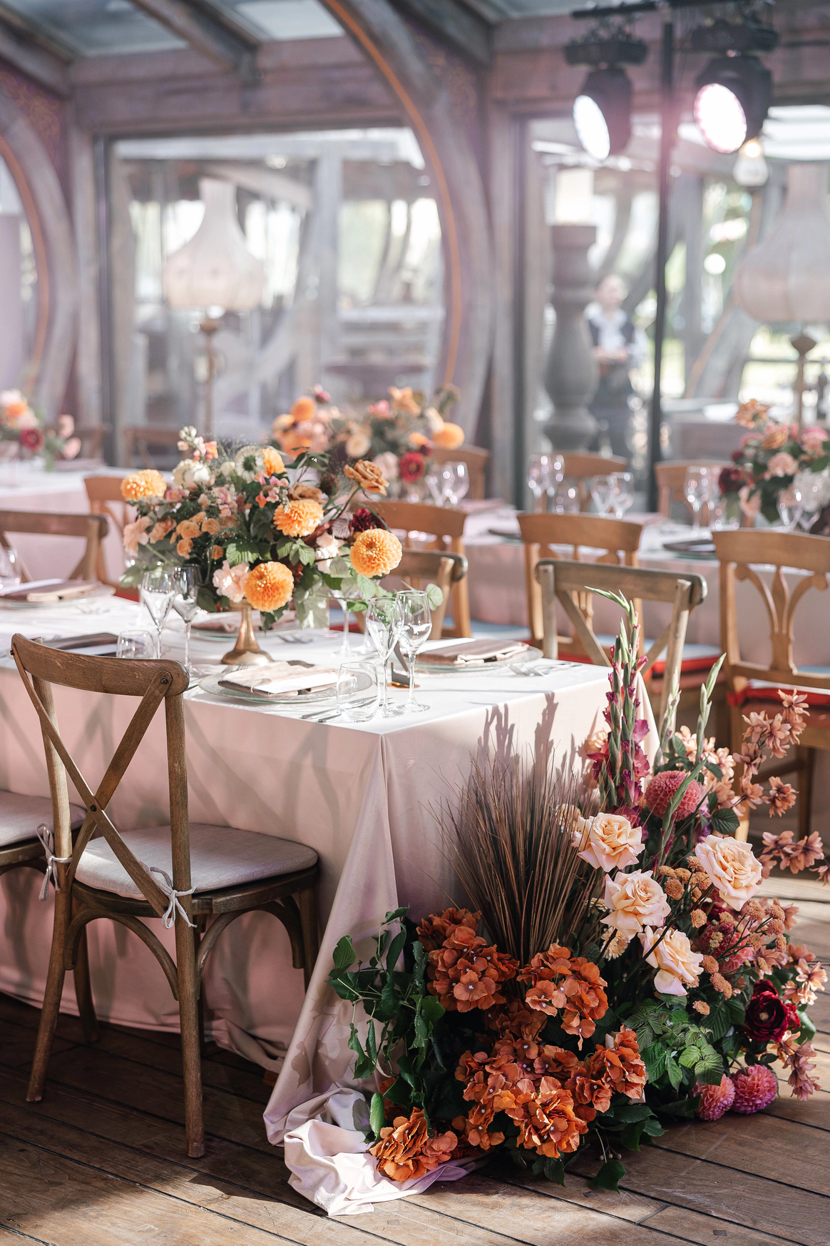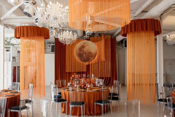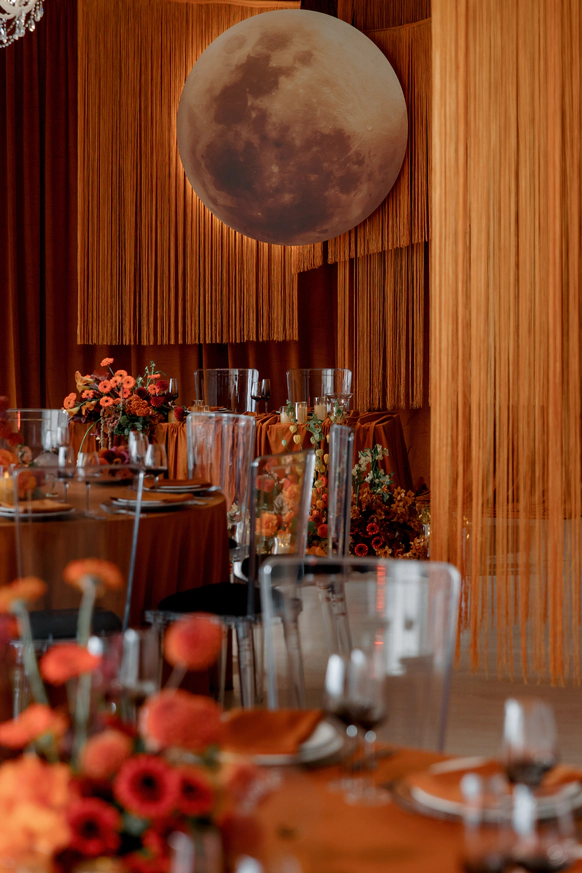 Декор поддержал концепцию современным и трендовым прочтением осенней эстетики. В оформлении преобладали оранжевые и чёрные акценты — смелое сочетание сезона 2025 года. Тёплые, тактильно приятные ткани, уютные скатерти и салфетки, а также флористика из ярких осенних цветов добавили пространству живости и камерного уюта.