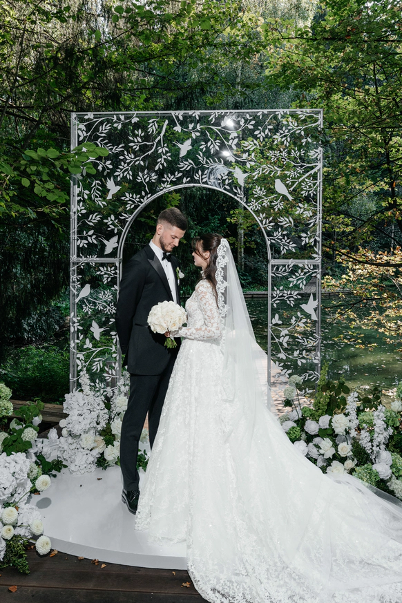 Концепцией вечера стало кружево. Ведь ниточки их судеб сплетались так долго и плотно, что стали напоминать красивую кружевную салфетку. Мы добавили элементы такого паттерна в арку, декор и платья невесты, что позволило создать единую картинку.