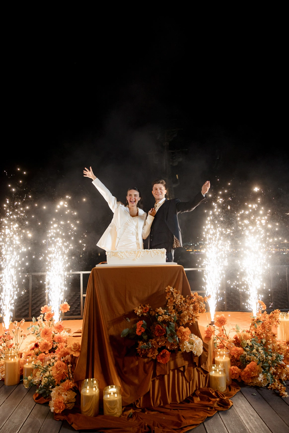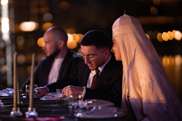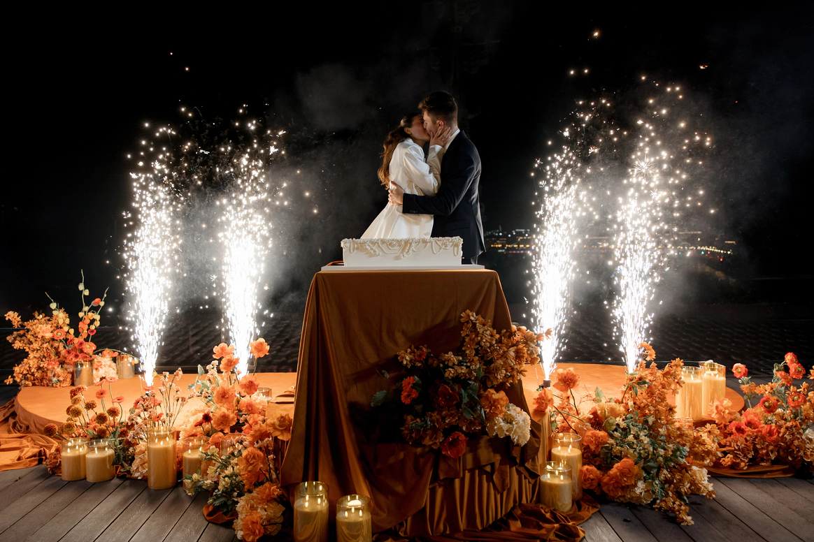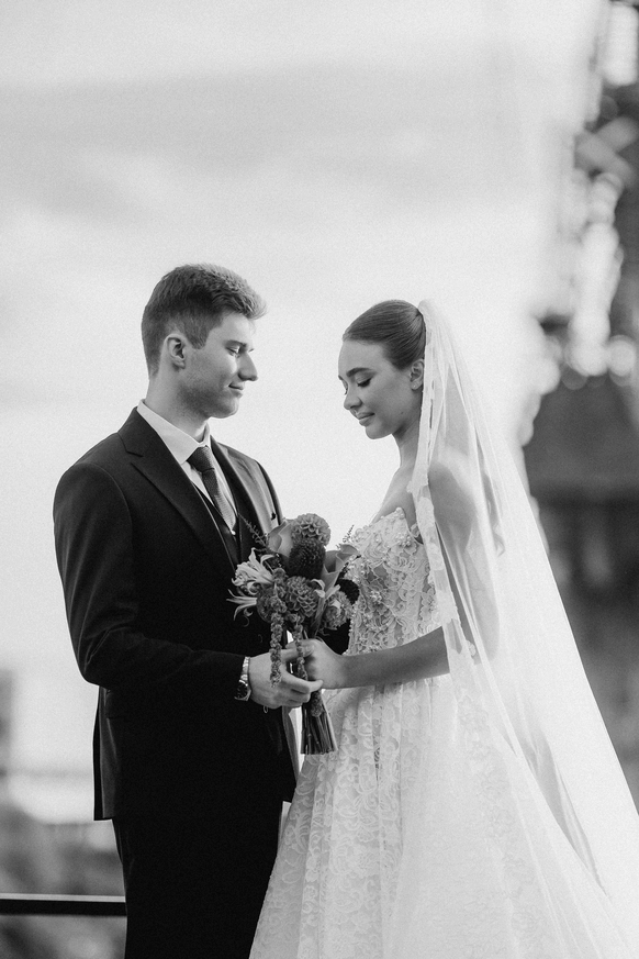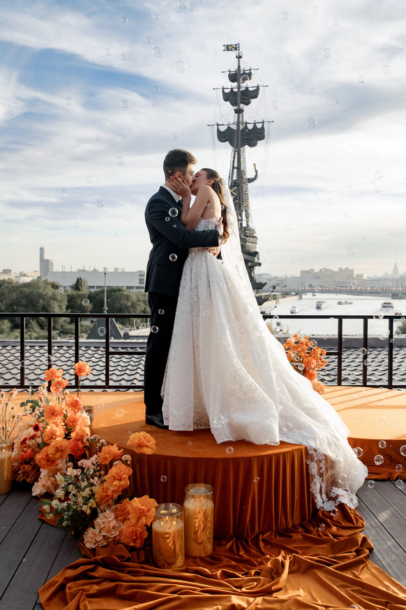 Церемония прошла на открытой террасе с захватывающим видом на закатную Москву — город стал естественными декорациями для признаний и клятв.