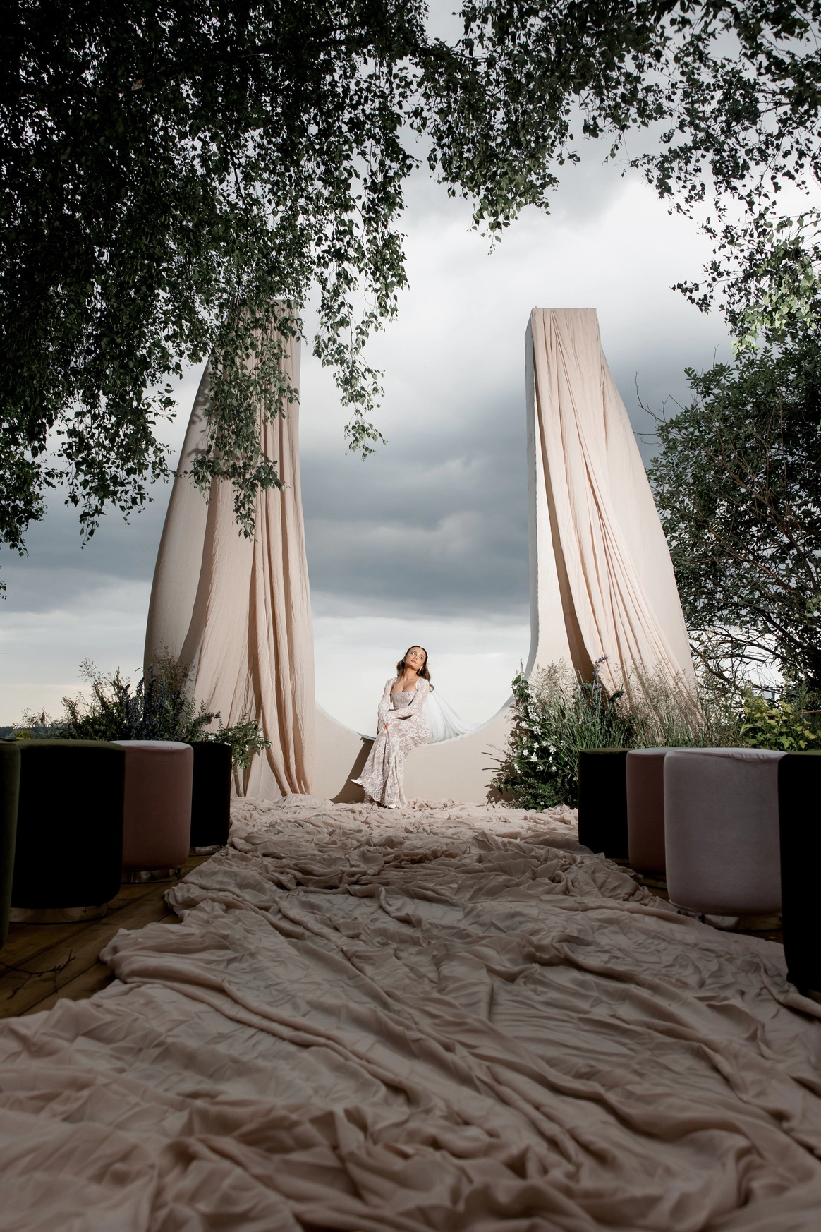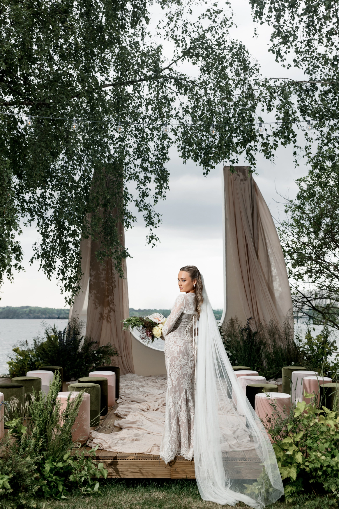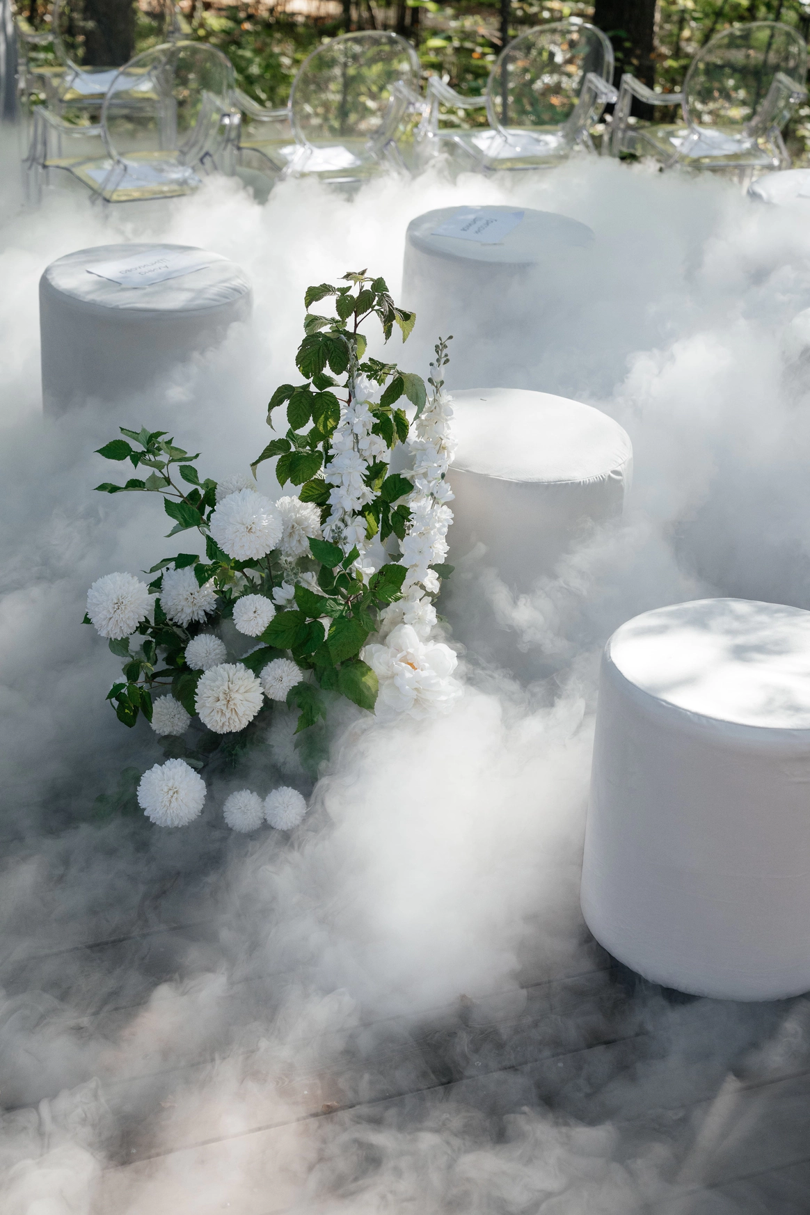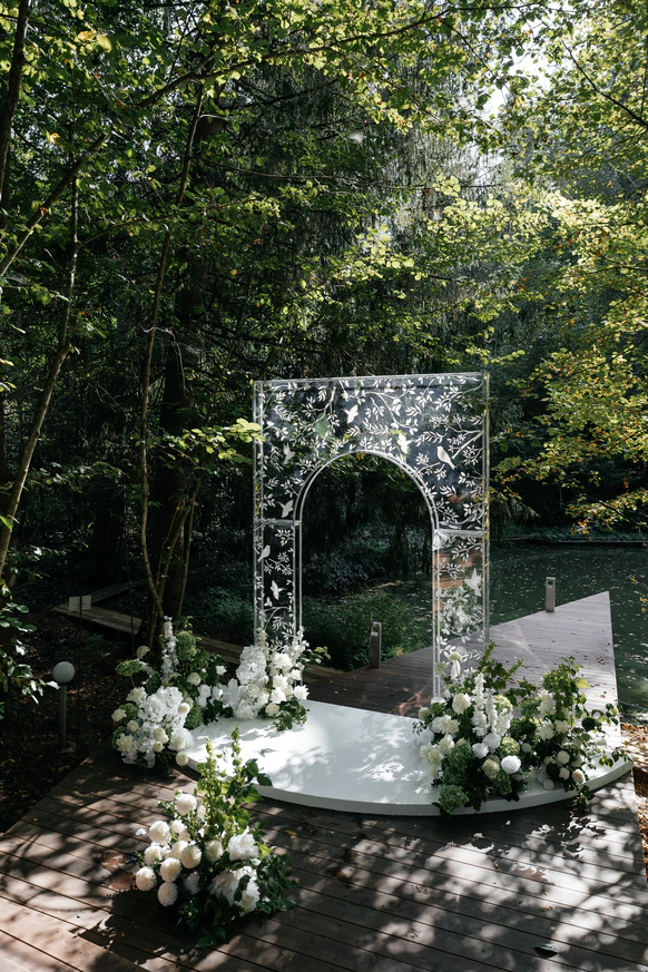 Открывается завеса, и гости проходят к красивой деревянной лестнице, на которой в густом дыму для них подготовлены пуфы и стулья. А в самом сердце этой лестницы красивая кружевная арка, прямо у воды. Жених появляется среди листвы, а невесту традиционно ведет папа. Атмосфера получилась очень романтичной, загадочной и с тем самым эффектом «ВАУ».
