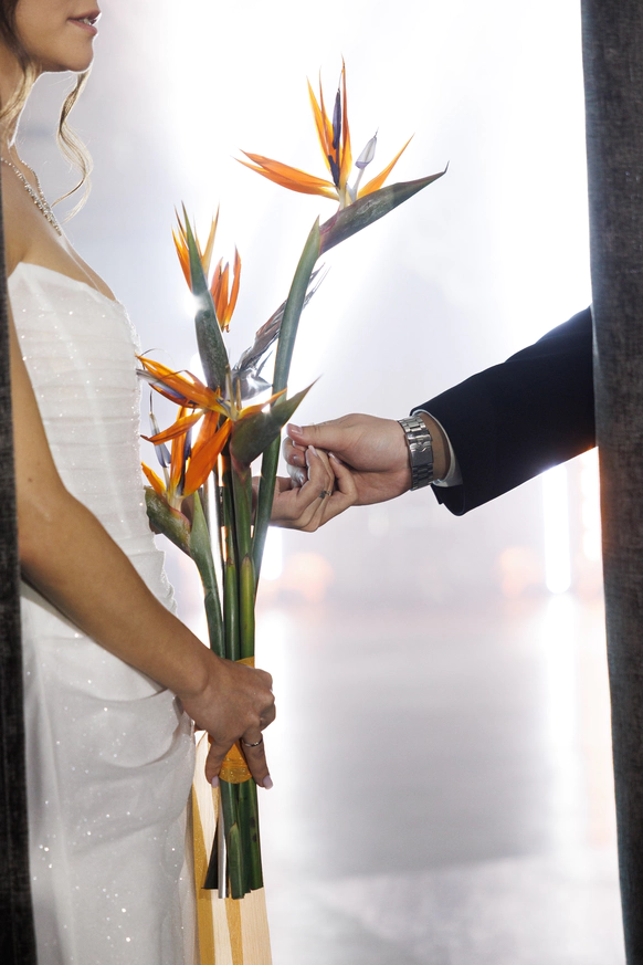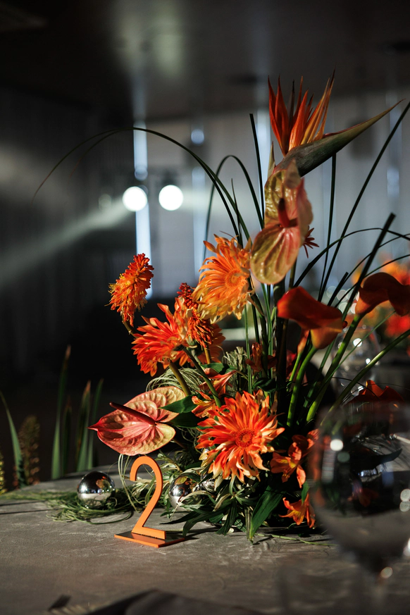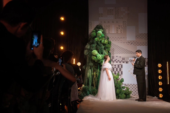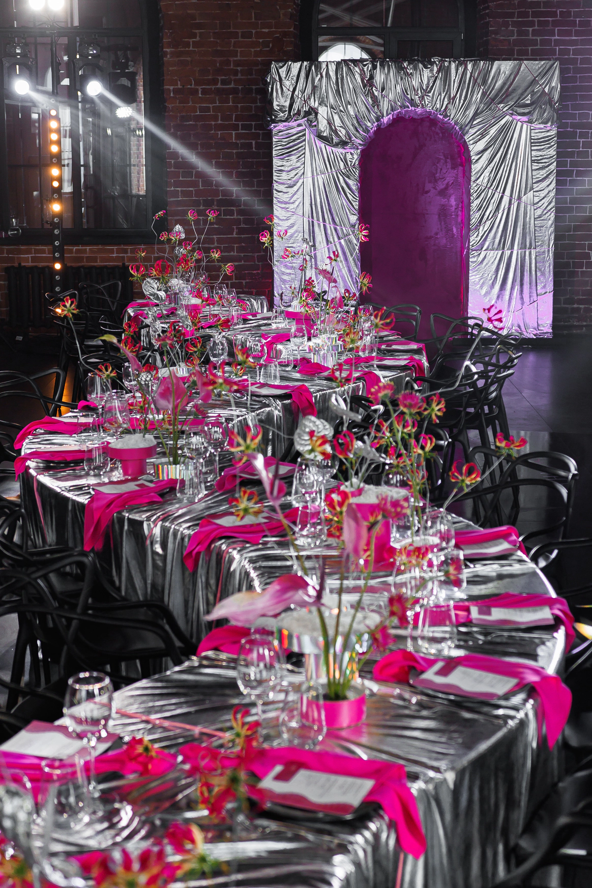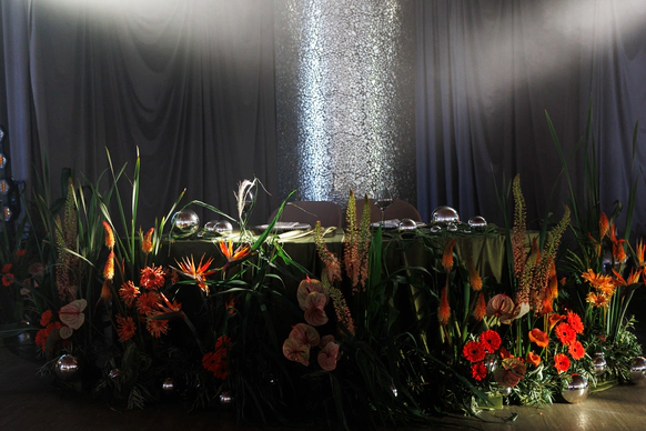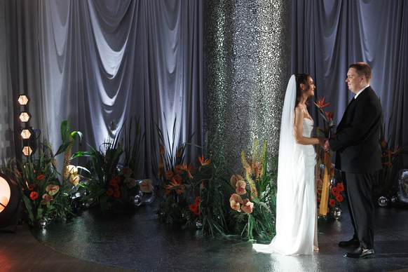 Мы полностью трансформировали пространство. Зал преобразился за счёт конструктивов, обтянутых тканью, рассудки в форме интегралов, флористического Арт-объекта и особого панно с вышитым патерном якутских орнаментов. Это была отсылка к месту рождения жениха Вадима и одновременно — символ связей, которые объединяли их с Сашей.