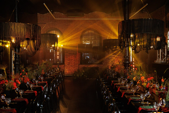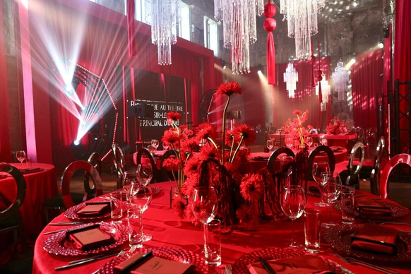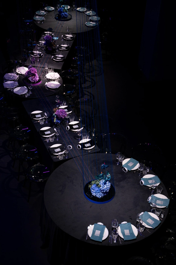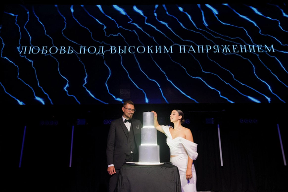 При реализации идеи мы сразу же начали работать с архитектурой пространства. Ключевым элементом стала нестандартная планировка символизирующая звенья электрической цепи. Столы гостей были связаны между собой километровыми нитями, образующими точки пересечения — узлы электрической схемы. От этих точек вверх поднимались нитевые «проводники тока», устремлённые к потолку и символизирующие электрические разряды.