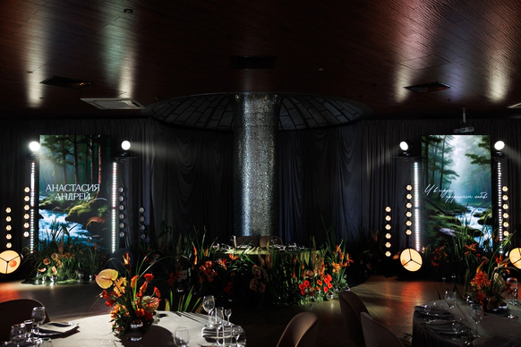 Экраны и световые решения мы грамотно встроили в пространство, преобразив в Эдемский сад, дополнив визуал и усилив интерактивность программы, 2 вертикальными экранами, для пары напротив президиума был дублирующий экран.