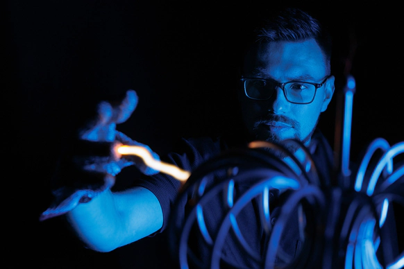 Астеры, подвешенные на тросах, усиливали эффект, создавая ощущение живого тока внутри пространства.