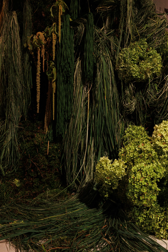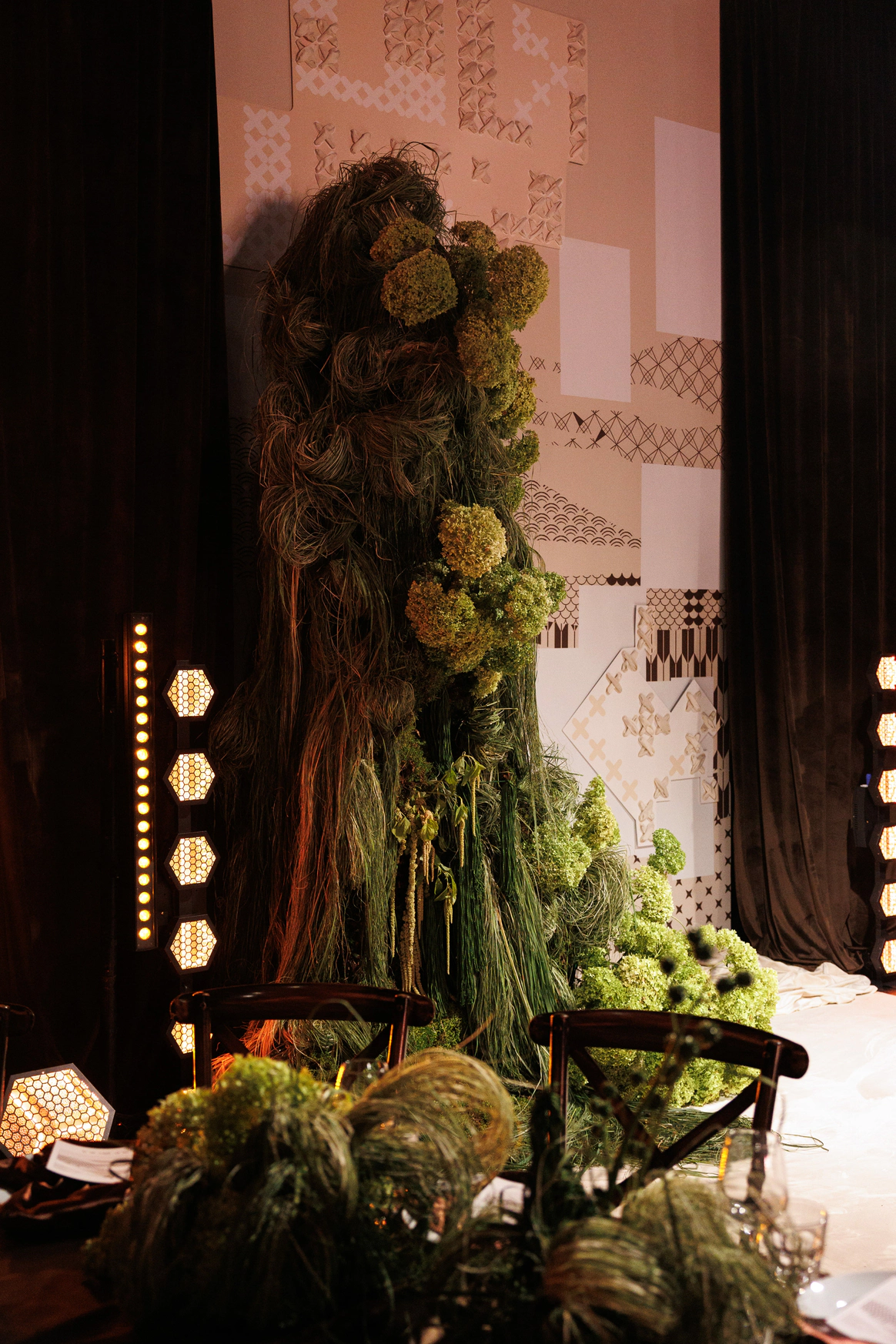 Выставленные полукругом столы, как цикличные круги, расходились от нашего центра. Композиции перетекали со стола на пол, образуя «зеленые холмы»,