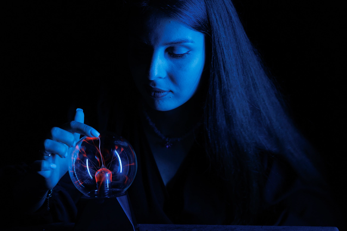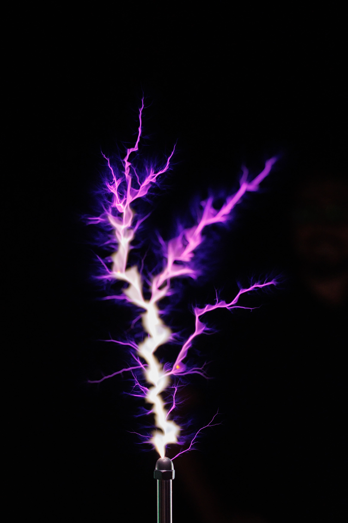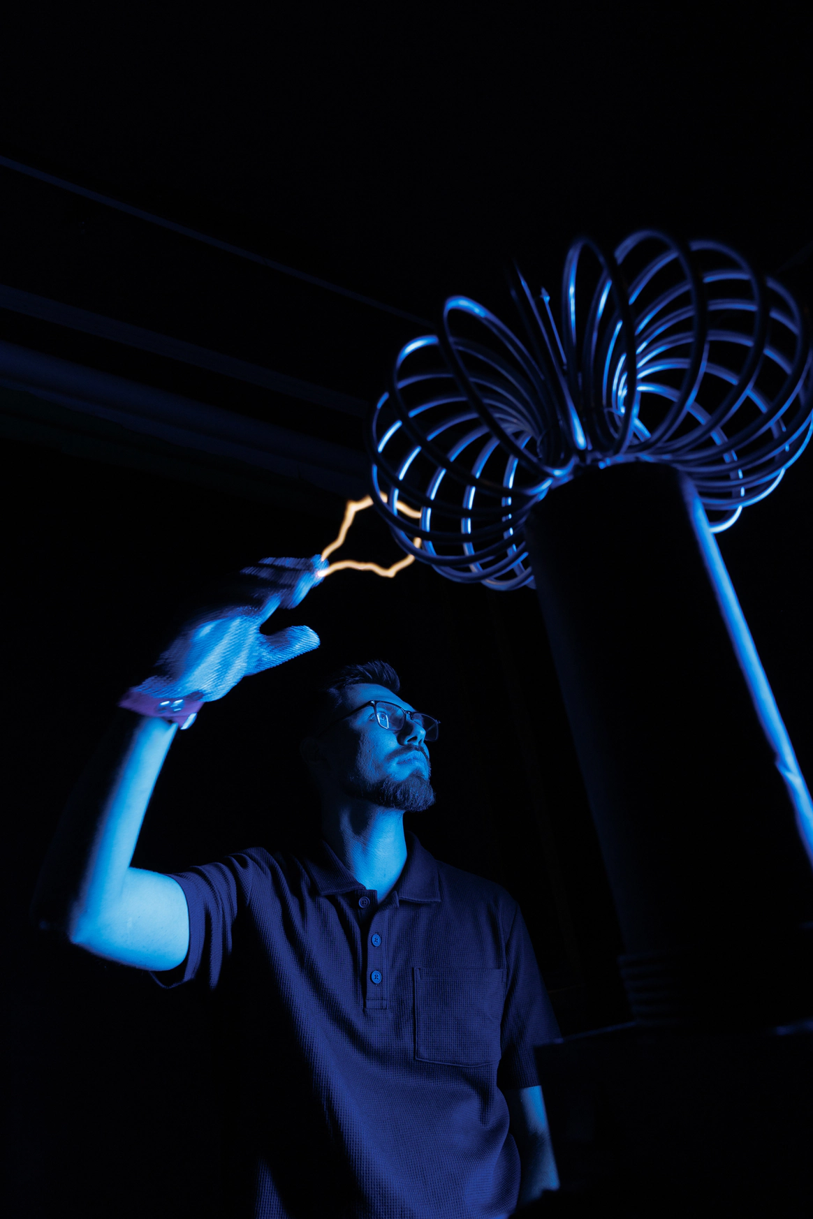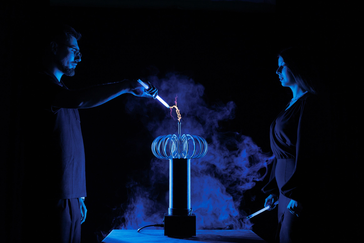 На предсвадебной съемке мы реализовали метафору прикосновения с током, используя катушки Тесла и неон.
