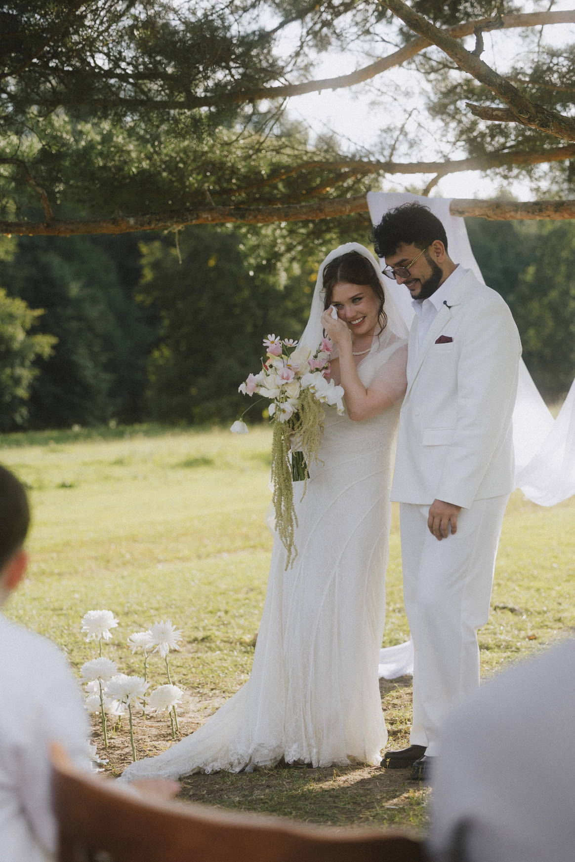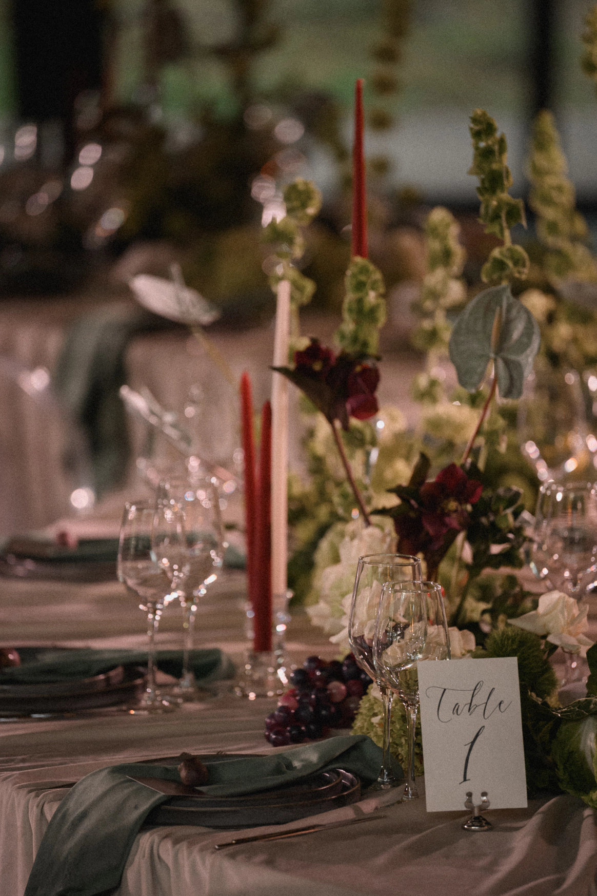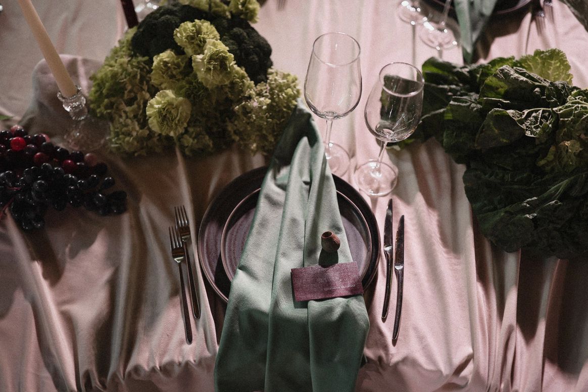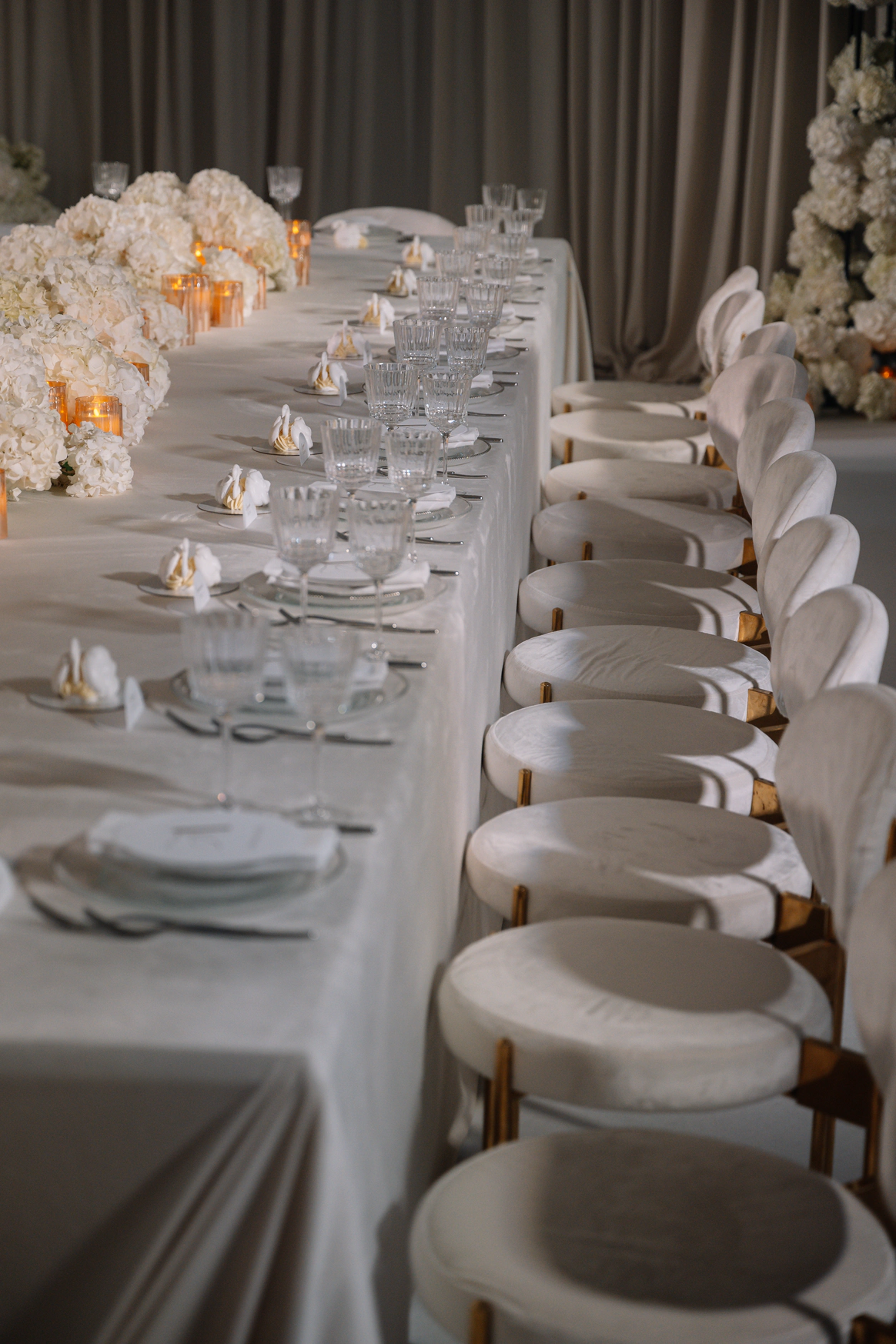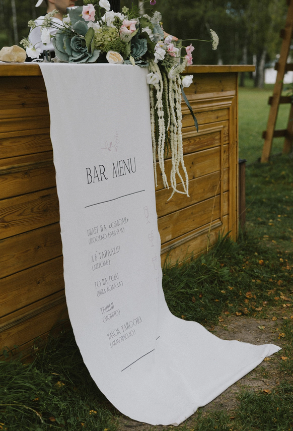 Особое внимание было уделено персонализации: письма для каждого гостя, именные элементы сервировки, печать на ткани, авторские коктейли и индивидуально продуманное меню, кастомные трэки на выходы жениха и невесты на церемонии, на танец невесты с папой и первый танец молодых.