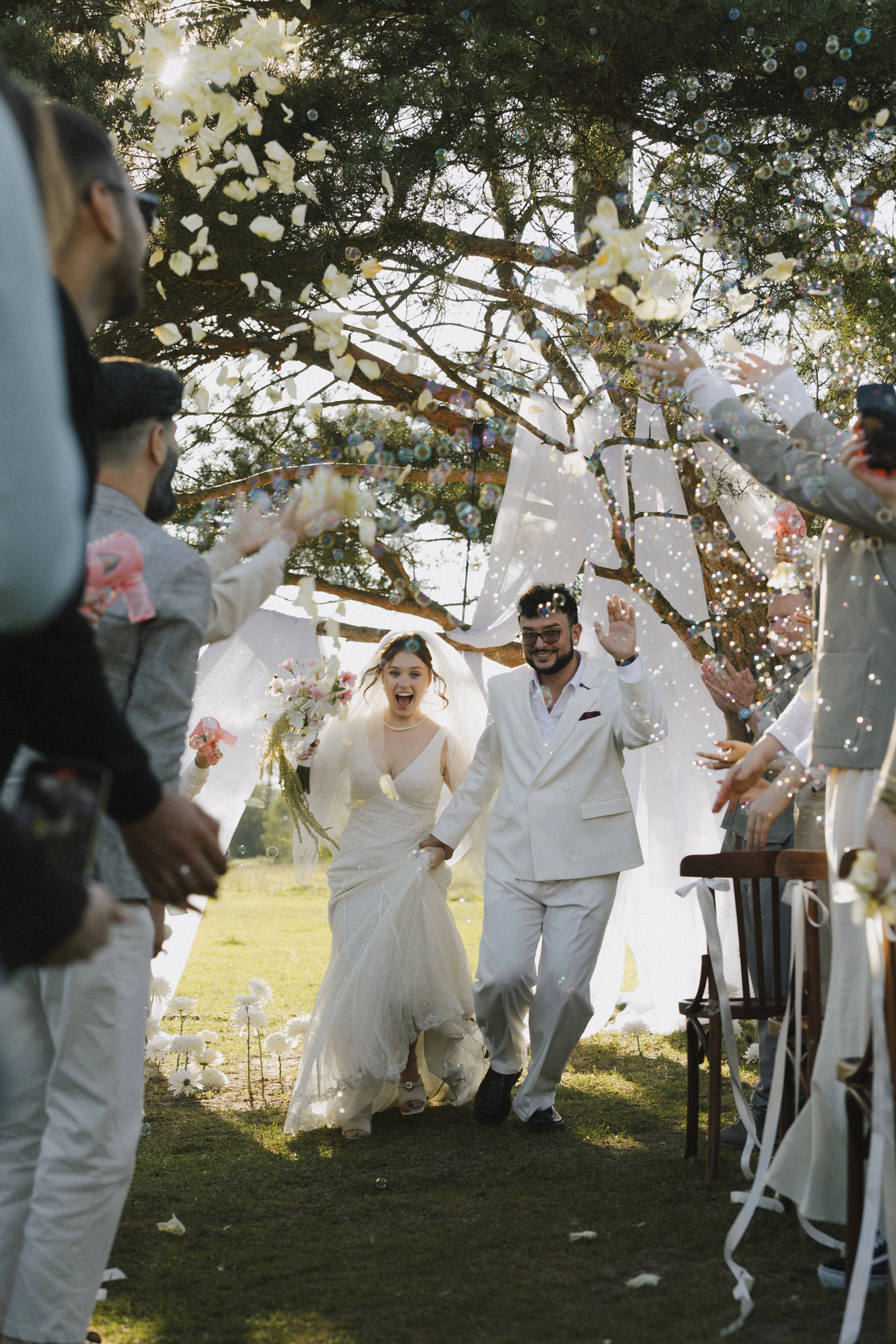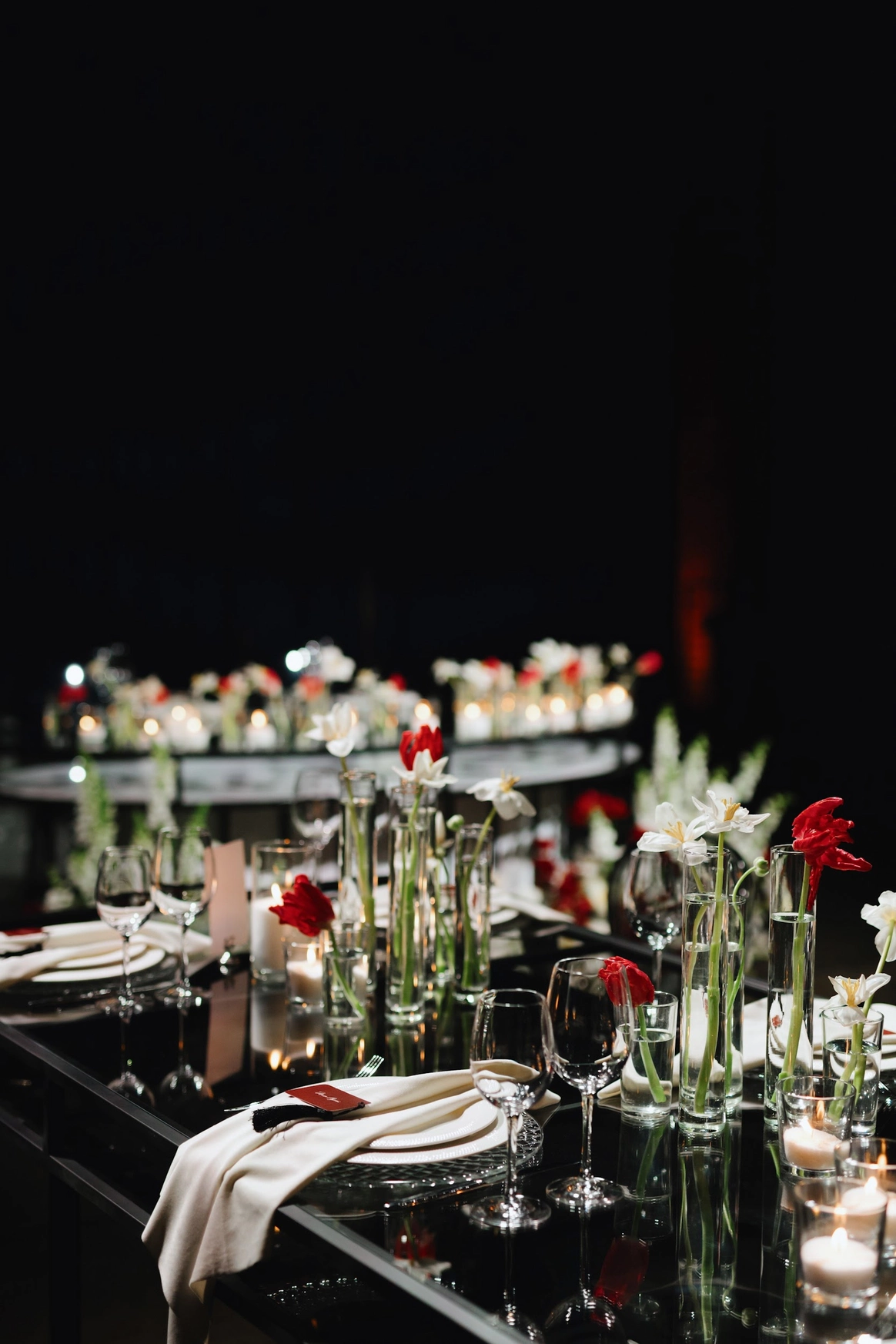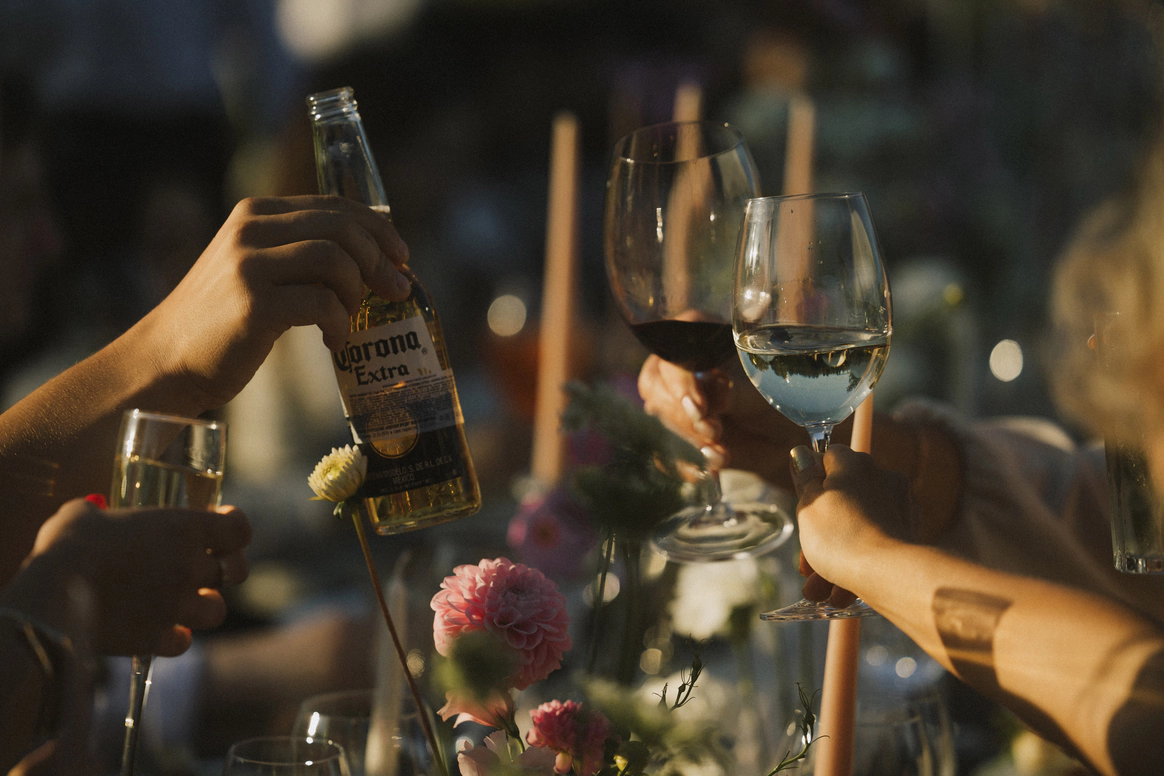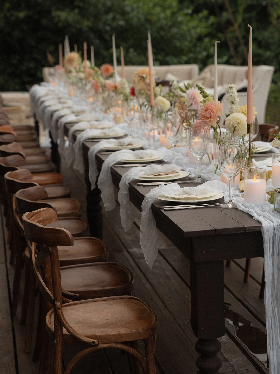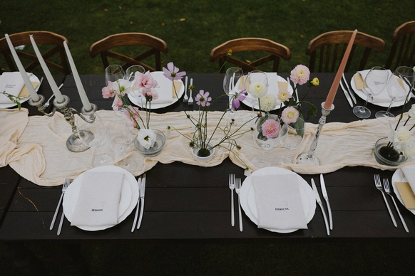 Особое внимание было уделено персонализации: письма для каждого гостя, именные элементы сервировки, печать на ткани, авторские коктейли и индивидуально продуманное меню, кастомные трэки на выходы жениха и невесты на церемонии, на танец невесты с папой и первый танец молодых.