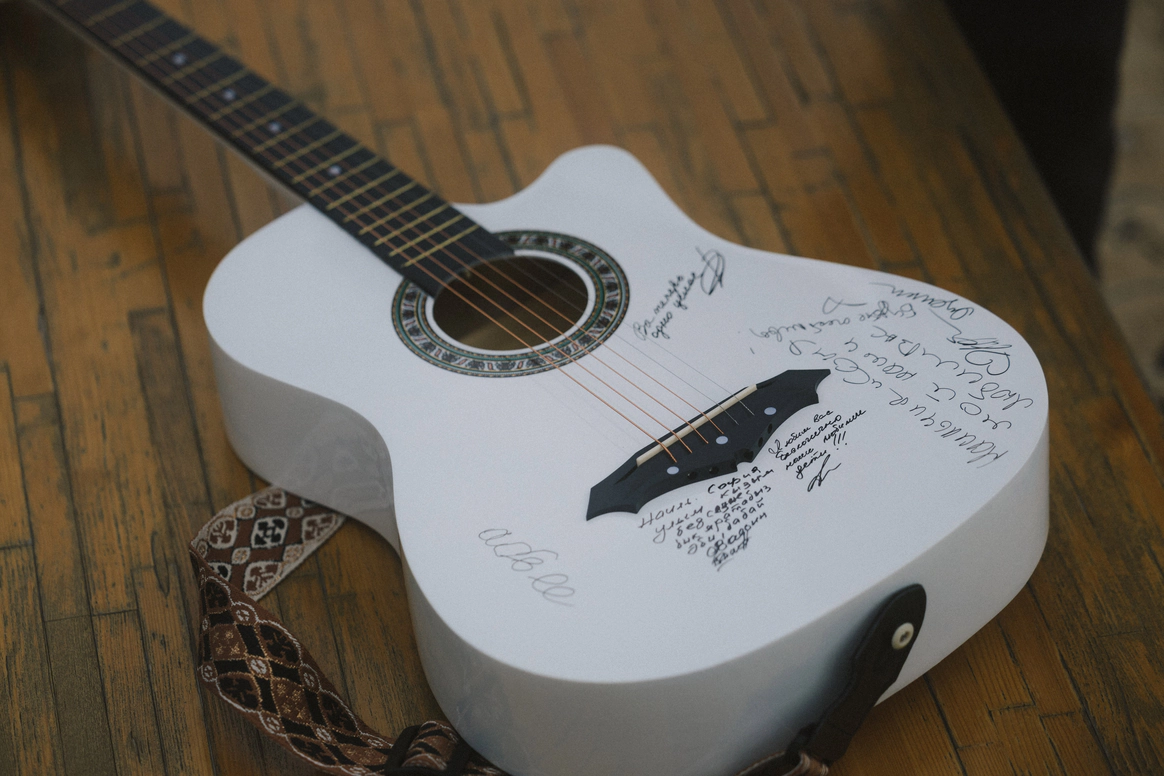 Вместо банальной книги пожеланий огромный постер, напечатанный на ПВХ + белые маркеры. Такая просто, а получилось очень стильно!