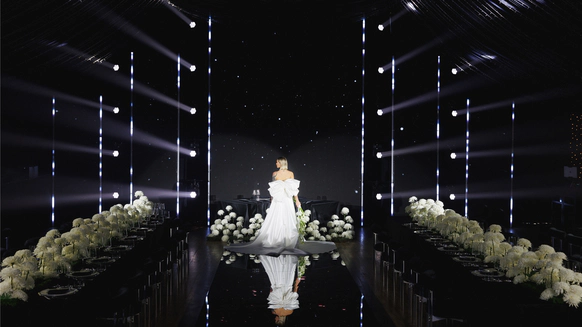 Кромешная темнота, тишина, музыка и голос невесты в наушниках + визуальные эффекты, передали ощущение полного единства и создали кульминацию их истории.