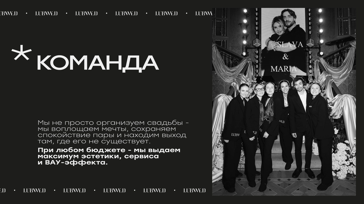 Lubwed - стиль - технологичность - забота. Свадьбы со вкусом, без лишнего пафоса, но с характером внутри. С нами можно мечтать масштабно и спать спокойно. Наши идеи впечатляют, а сервис согревает. Наша миссия - подарить вам эмоции, которые захочется проживать снова и снова. Чтобы и через 30 лет, глядя друг на друга, вы говорили: "Хочу повторить этот день" -Финалисты Wedding Awards Russia 2022 год ( свадьба от 3 до 8 млн руб) -Финалисты Wedding Awards Russia 2024 год ( свадьба до 3 млн руб) -Победители WHITE Awards 2024 год ( частное мероприятие от 3 до 8 млн) - экспертное жюри Wedding Awards Russia ( 2023, 2024, 2025) - с этого года экспертное жюри TOP100AWARDS