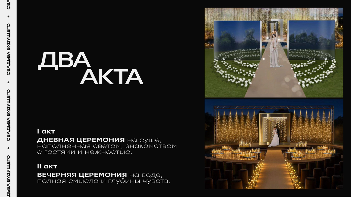 Сценарий мероприятия был построен как два акта, повторяющие путь пары (ПЕРЕРОЖДЕНИЕ ЦЕРЕМОНИИ)