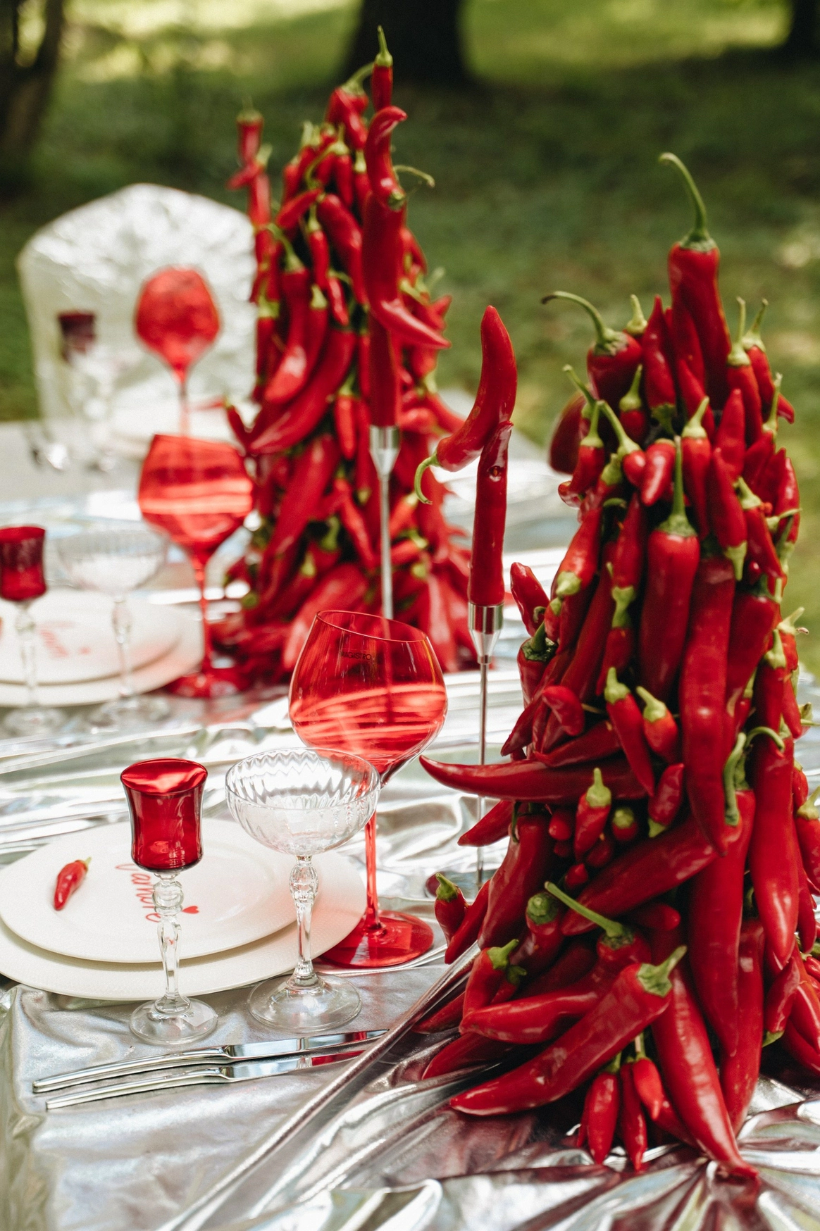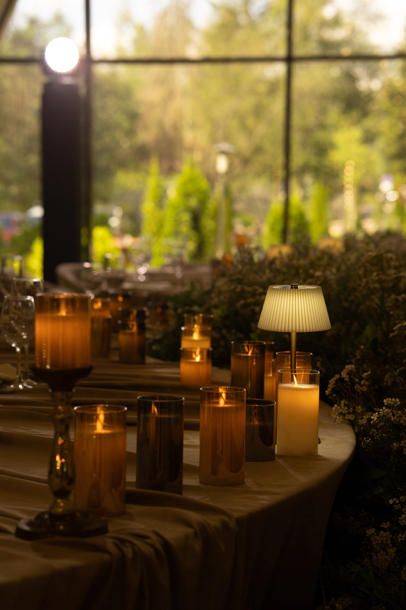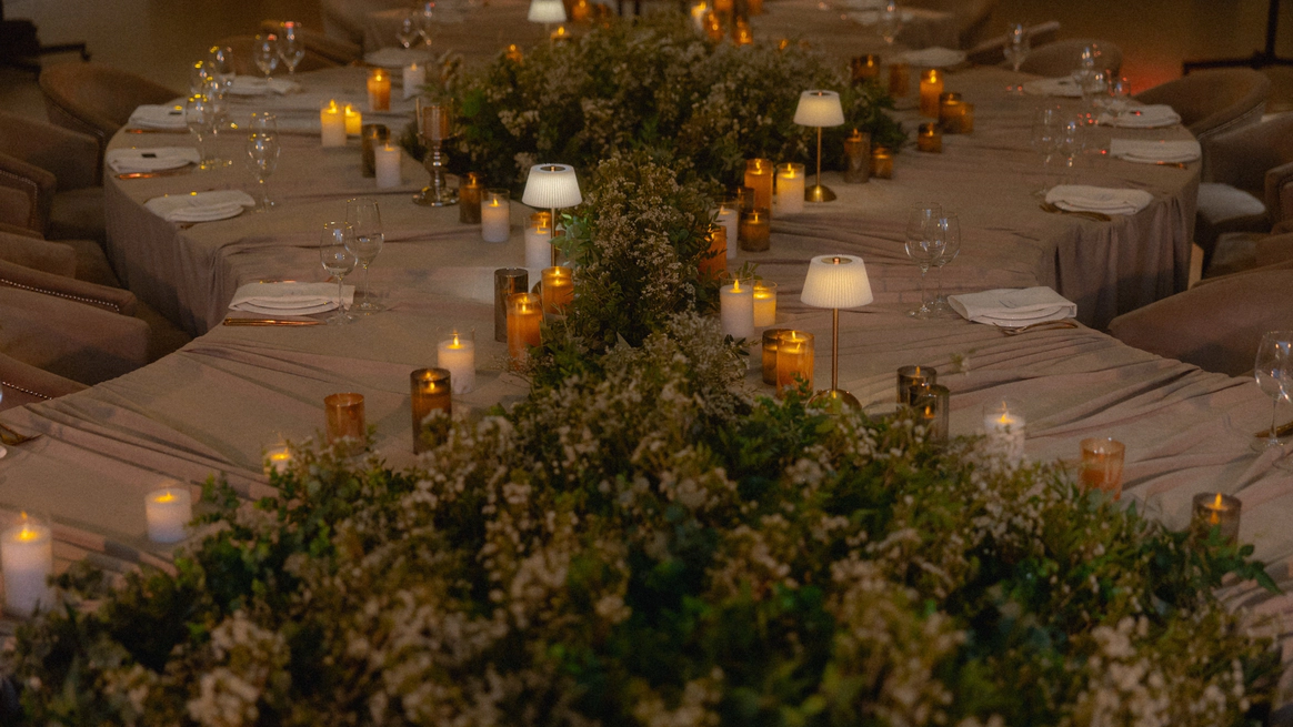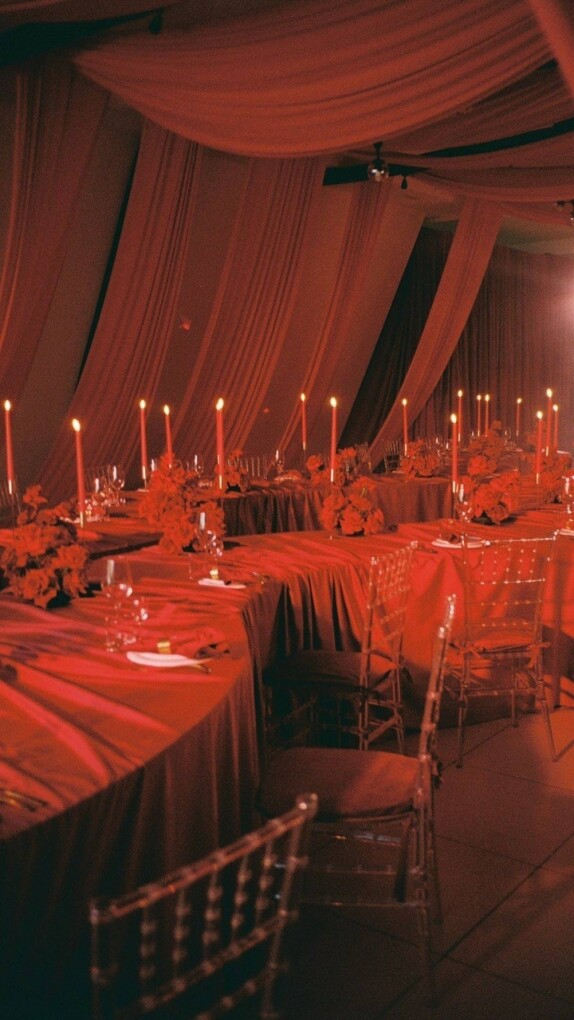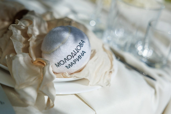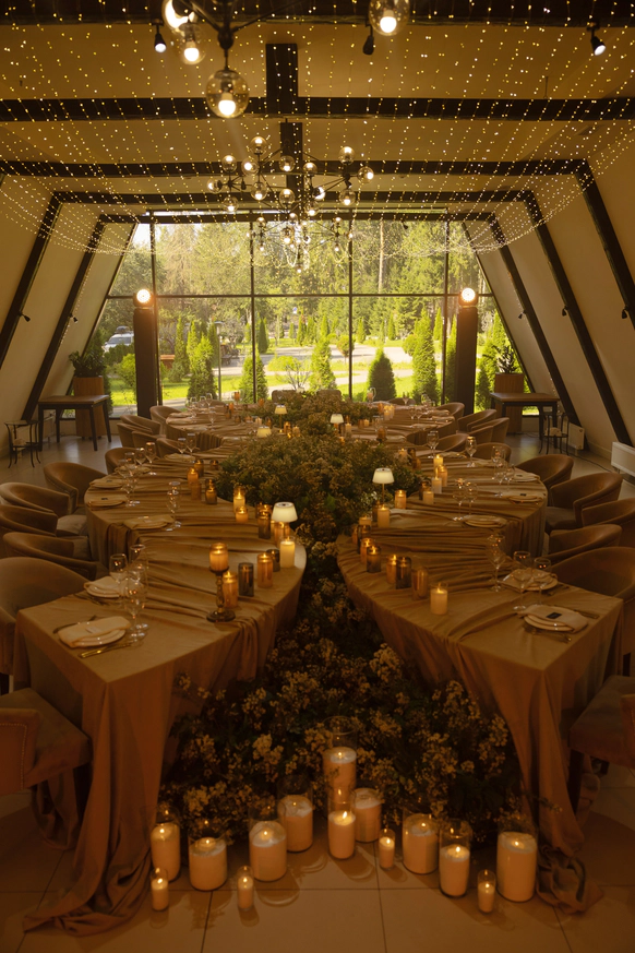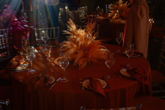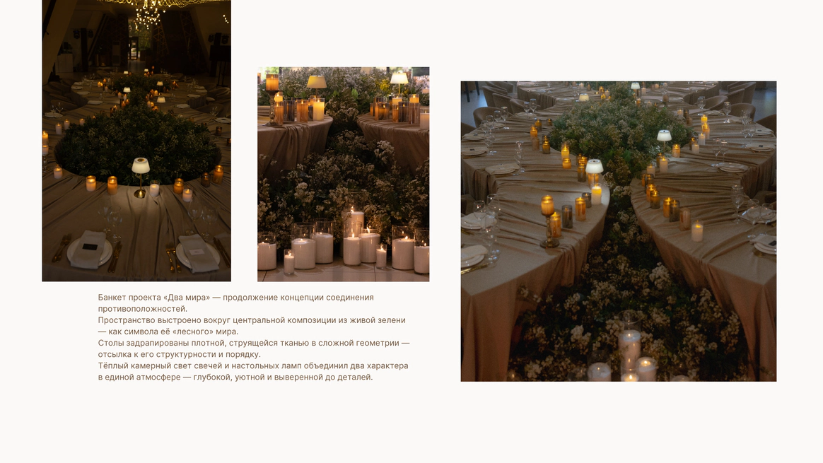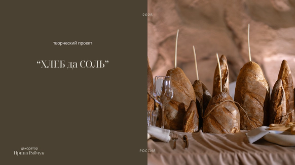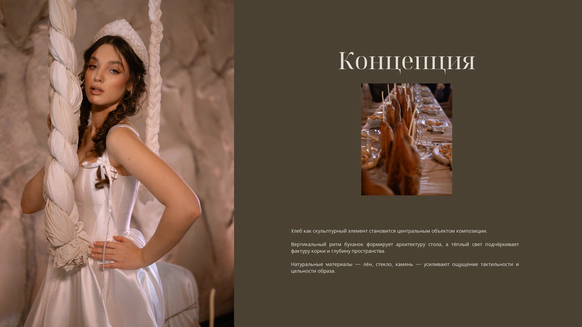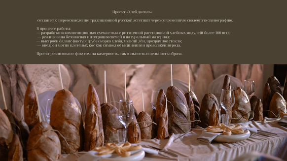 В основе концепции — символ гостеприимства и изобилия: длинный стол, оформленный композициями из румяных караваев со свечами, натуральный лен, тёплый свет и фактурные стены, напоминающие глину и камень. Хлеб стал не просто угощением, а главным арт-объектом и смысловым центром декора.