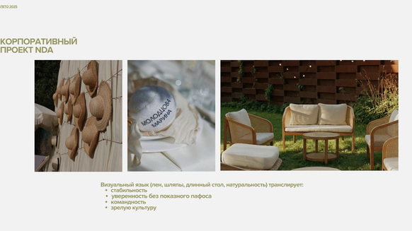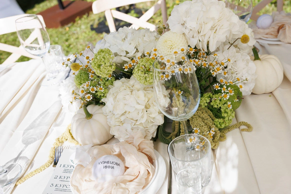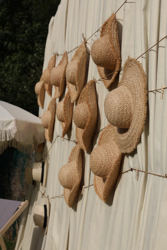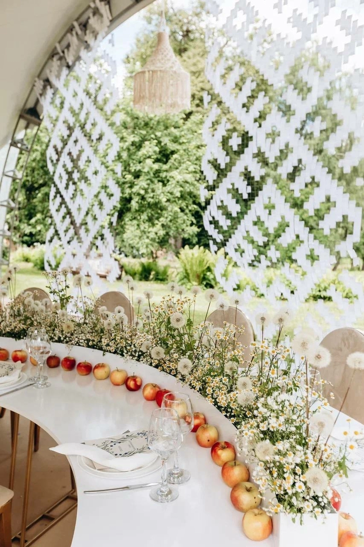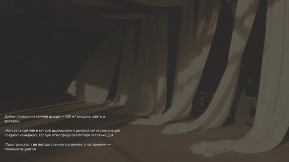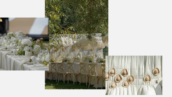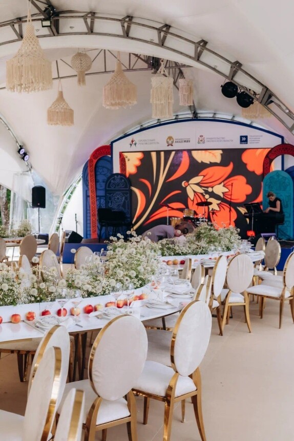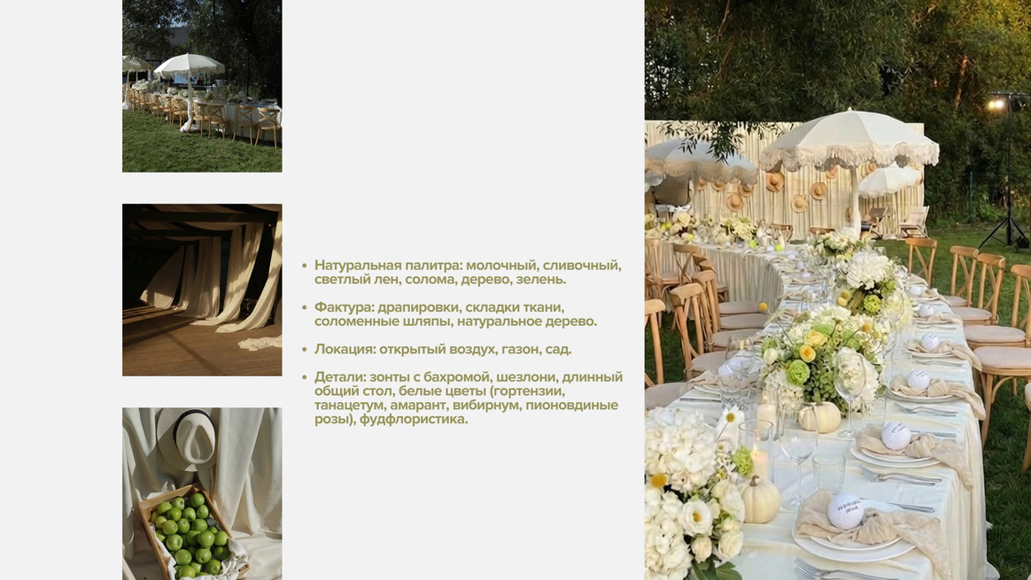 В основе проекта — натуральные фактуры и тёплая палитра: лен, ротанг, светлое дерево, айвори и мягкая зелень. Длинные общие столы с воздушными цветочными композициями в бело-зелёной гамме создавали атмосферу уюта и камерности, а текстильные зонты с бахромой и фотозона со стеной из соломенных шляп добавили проекту характер и запоминающийся визуальный акцент.