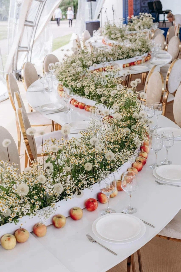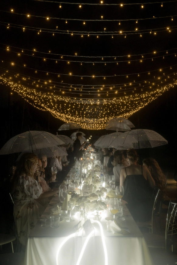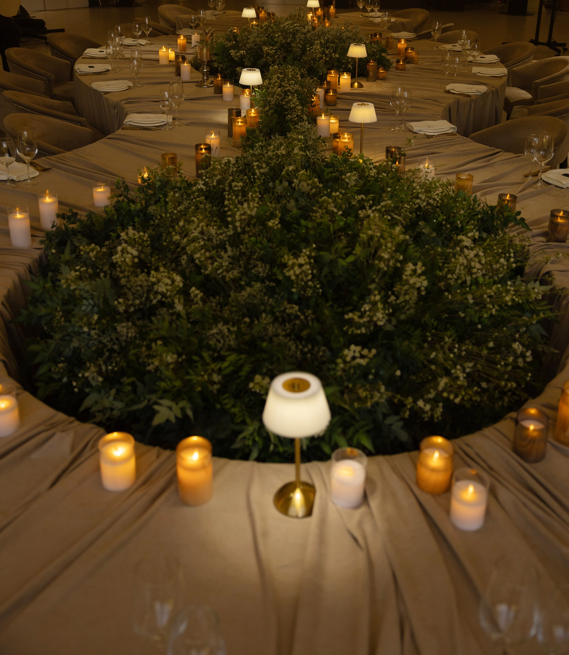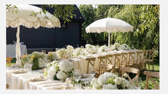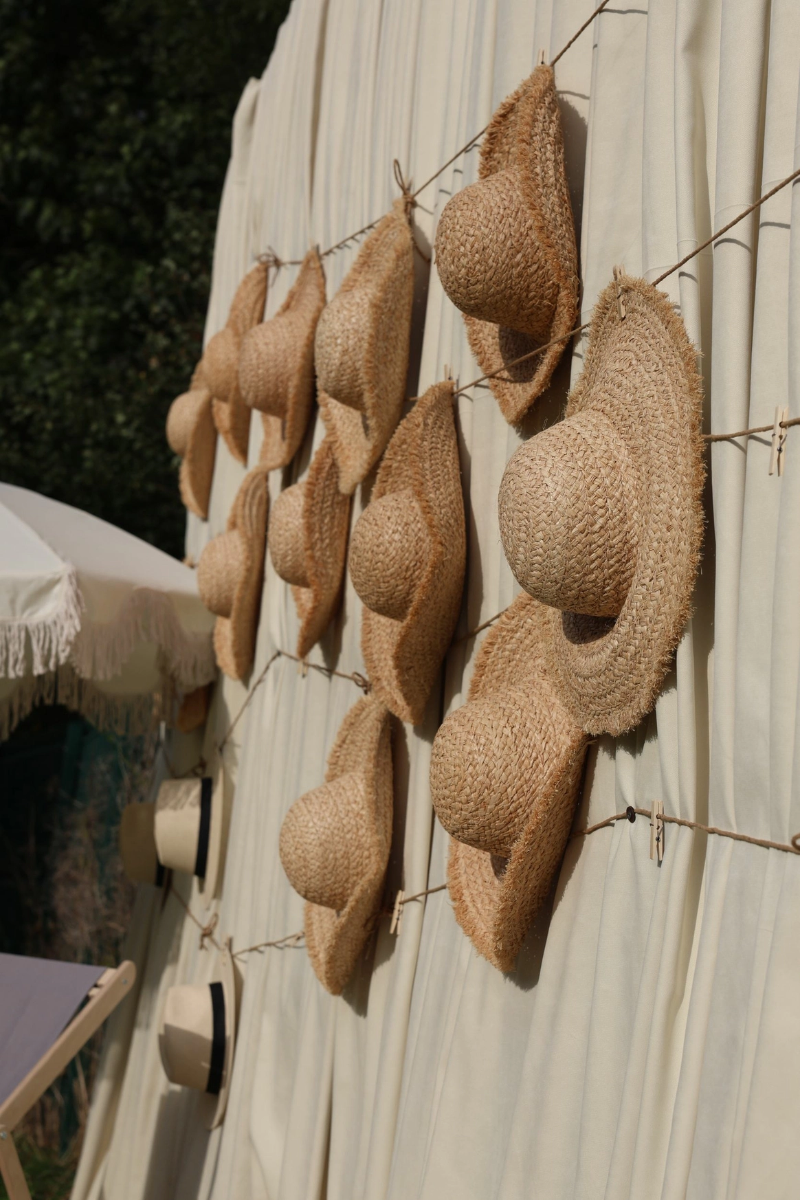 В основе проекта — натуральные фактуры и тёплая палитра: лен, ротанг, светлое дерево, айвори и мягкая зелень. Длинные общие столы с воздушными цветочными композициями в бело-зелёной гамме создавали атмосферу уюта и камерности, а текстильные зонты с бахромой и фотозона со стеной из соломенных шляп добавили проекту характер и запоминающийся визуальный акцент.