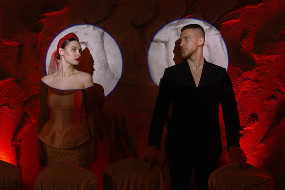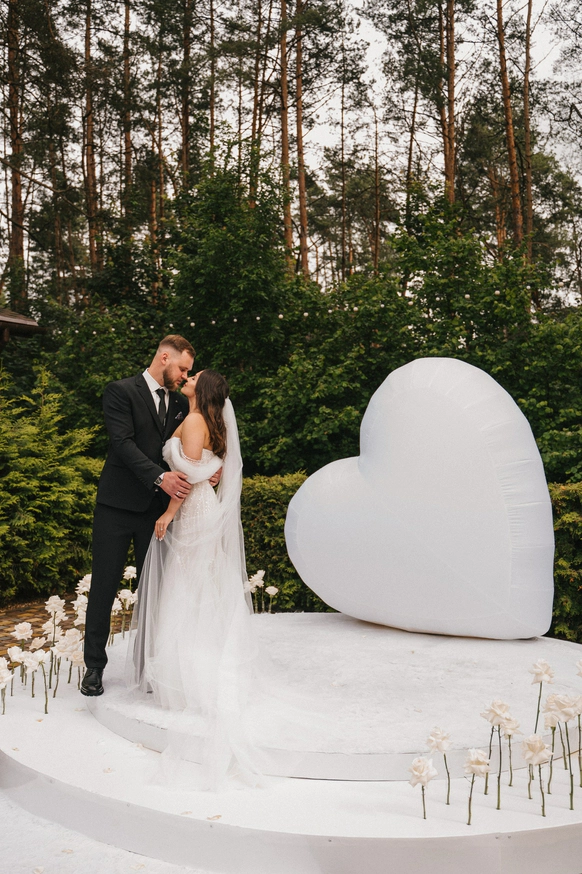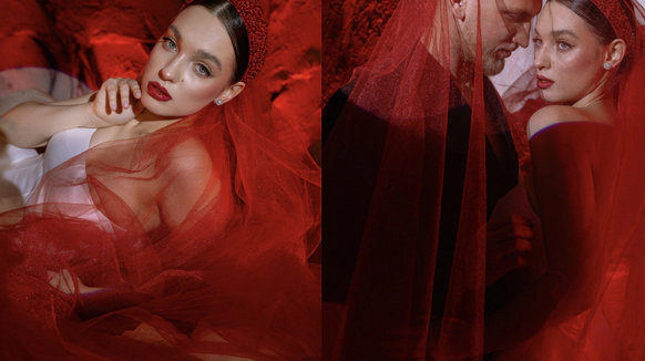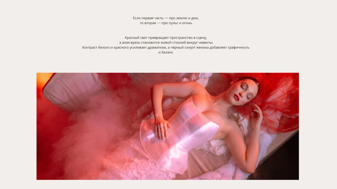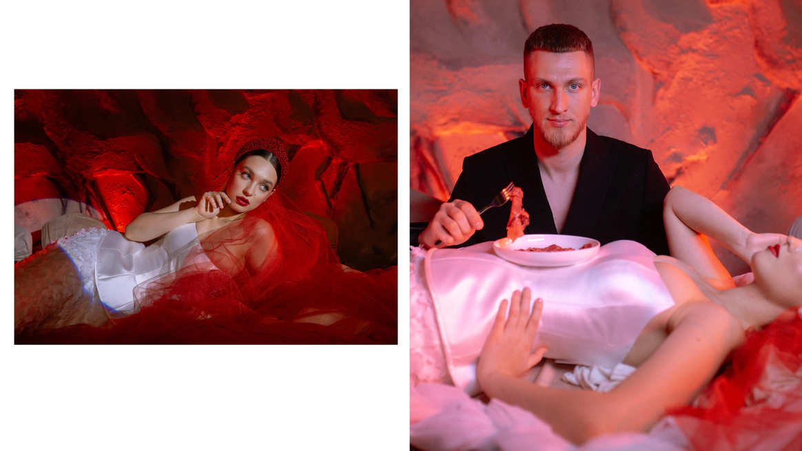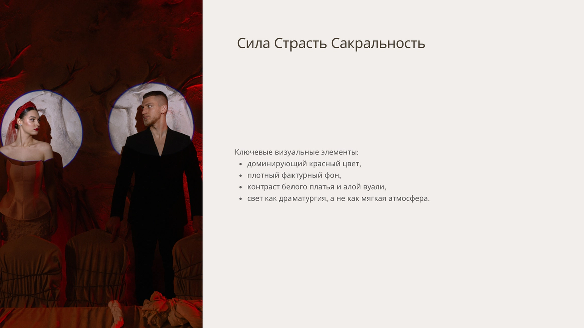 Образы пары поддерживают идею: невеста — в лаконичном белом платье с акцентным кокошником, жених — в современном костюме с отсылкой к народному крою. Красный свет и полупрозрачная фата добавили драматургии, соединив традицию и модную подачу.