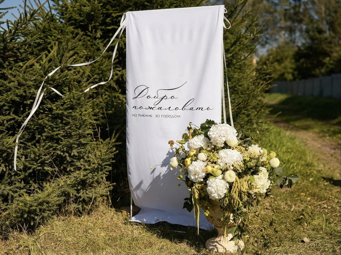 Пространство было зонировано: банкетная часть, лаунж с плетёной мебелью и декоративные инсталляции для фото — всё продумано для комфортного отдыха и живого общения гостей на свежем воздухе.