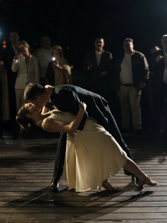 Ключевые моменты дня — выходы пары на церемонию и первый танец — сопровождались французскими композициями, усиливая концепцию события. Акцентом церемонии стал лёгкий перформанс от друга пары: в образе француза с беретом он вынес кольца, а момент объявления пары мужем и женой эффектно подчеркнул выстрелом из пистолета.