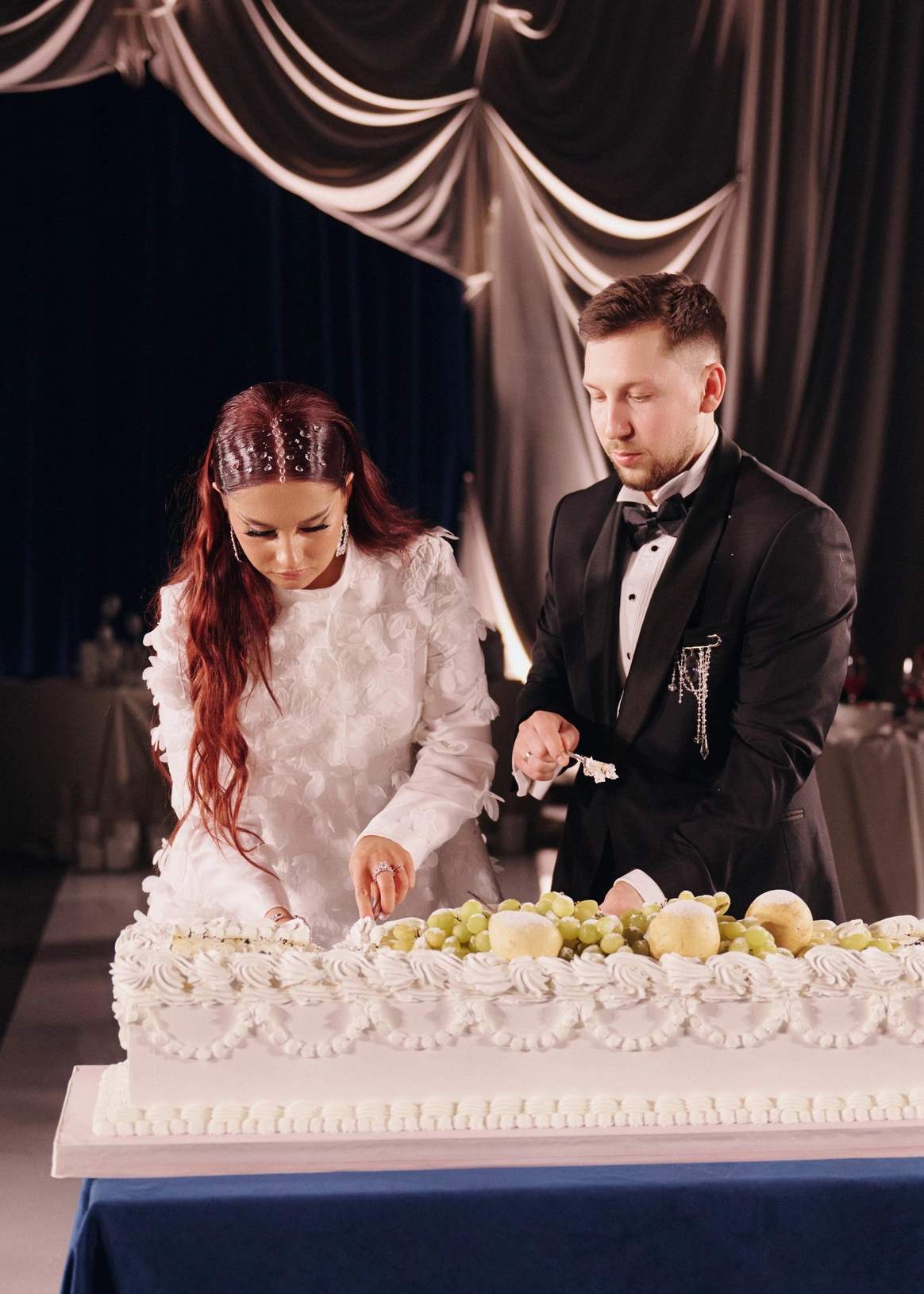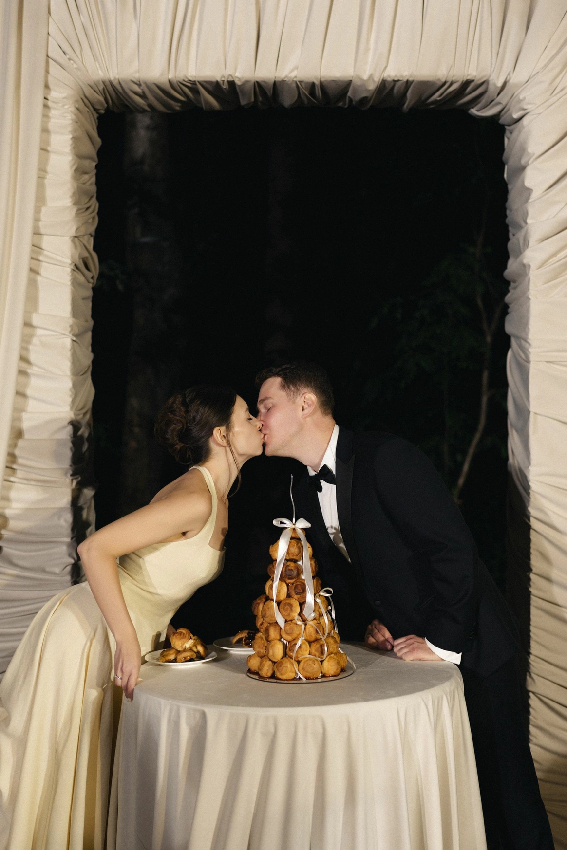Перед аркой появились пирамиды из профитролей, не случайно: на первое свидание Никита привёз Карине набор профитролей, и с тех пор это её любимый десерт. Этот мотив продолжился и в свадебном торте, выполненном в форме такой же пирамиды.